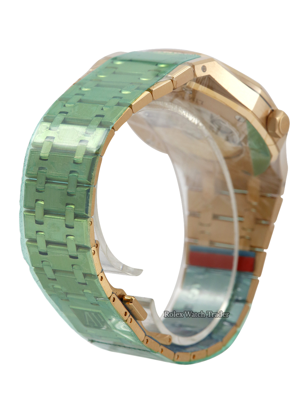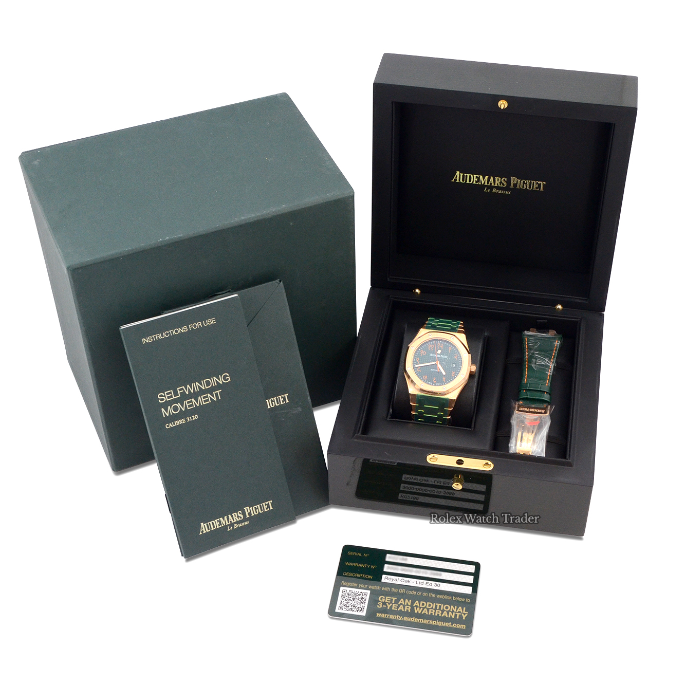 As shown in the images this watch is supplied with the original Audemars Piguet inner and outer boxed, the original Audemars Piguet instruction manual, the original Audemars Piguet manual holder, the original Audemars Piguet warranty card and the additional Audemars Piguet green leather strap with a rose gold folding clasp.