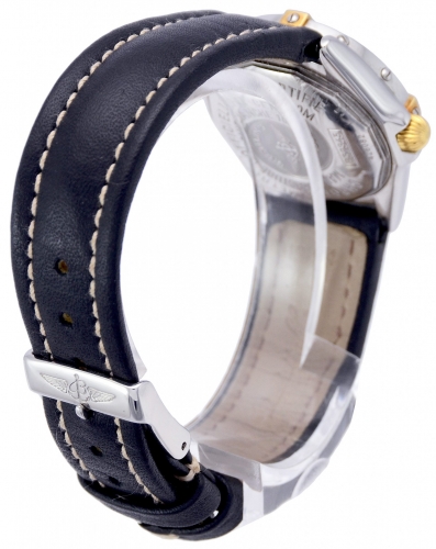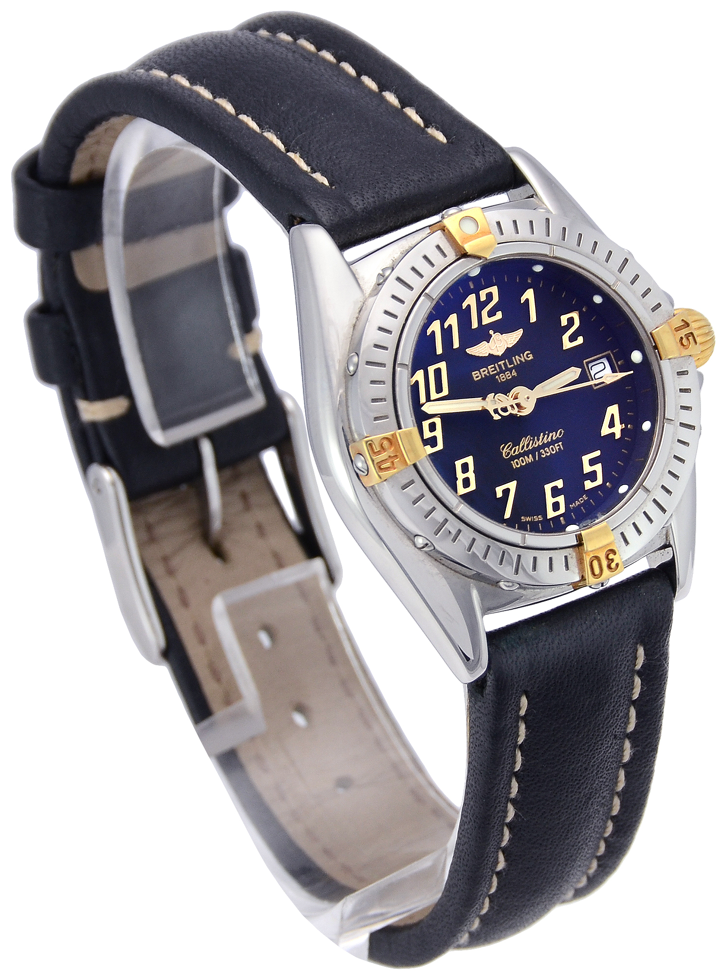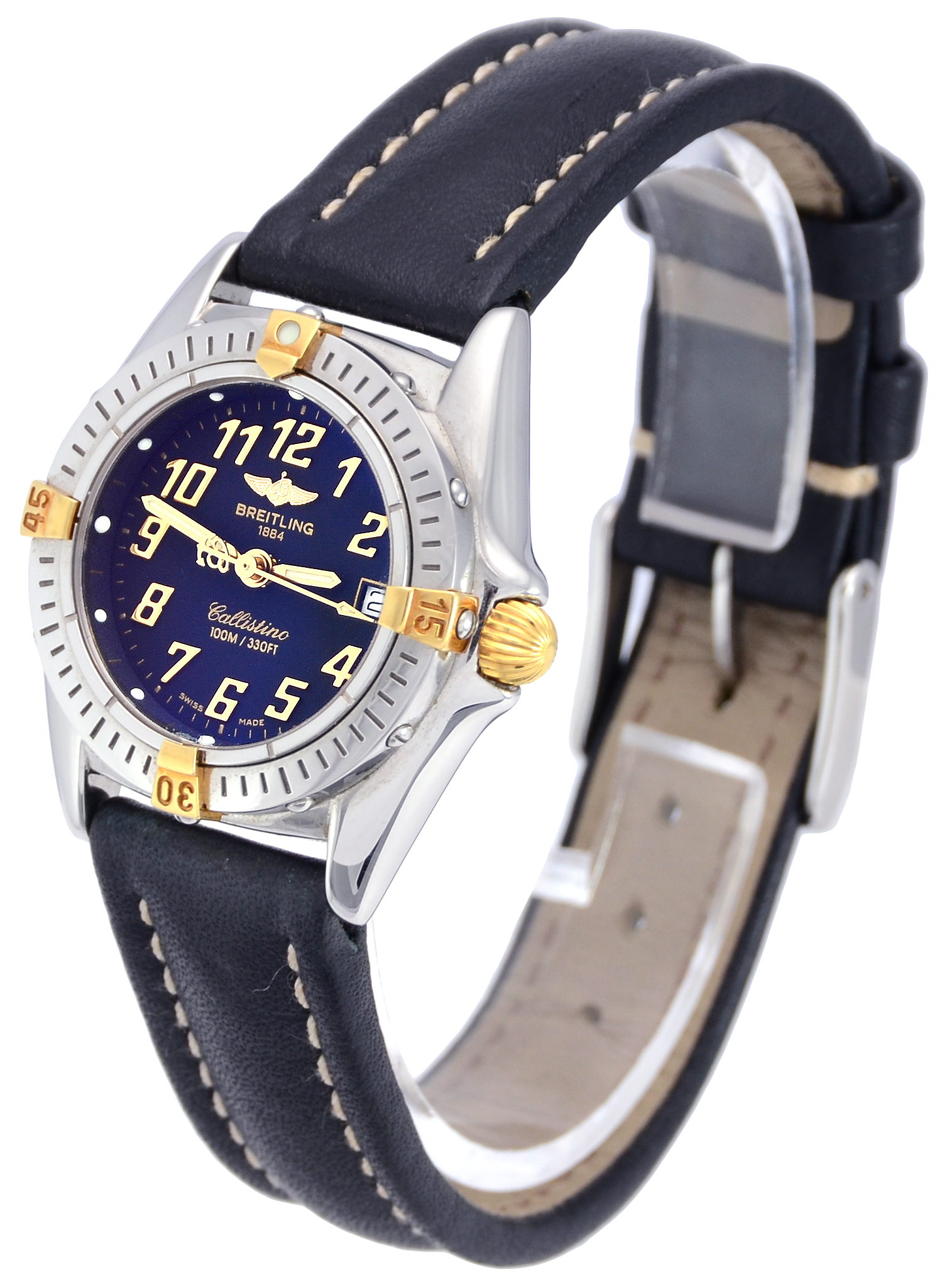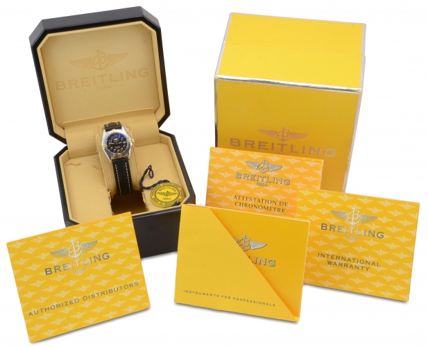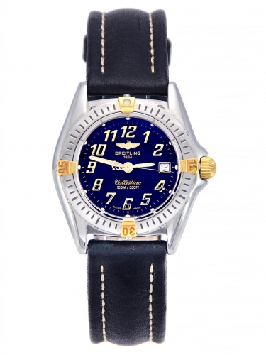 Pre-owned 28mm case diameter Breitling Callistino B52345. This is a 2002 model in good cosmetic condition. Stainles steel case and bezel with yellow gold detail on a black leather strap which shows very little signs of wear. This watch comes complete with the outer box, inner box and papers as shown.
