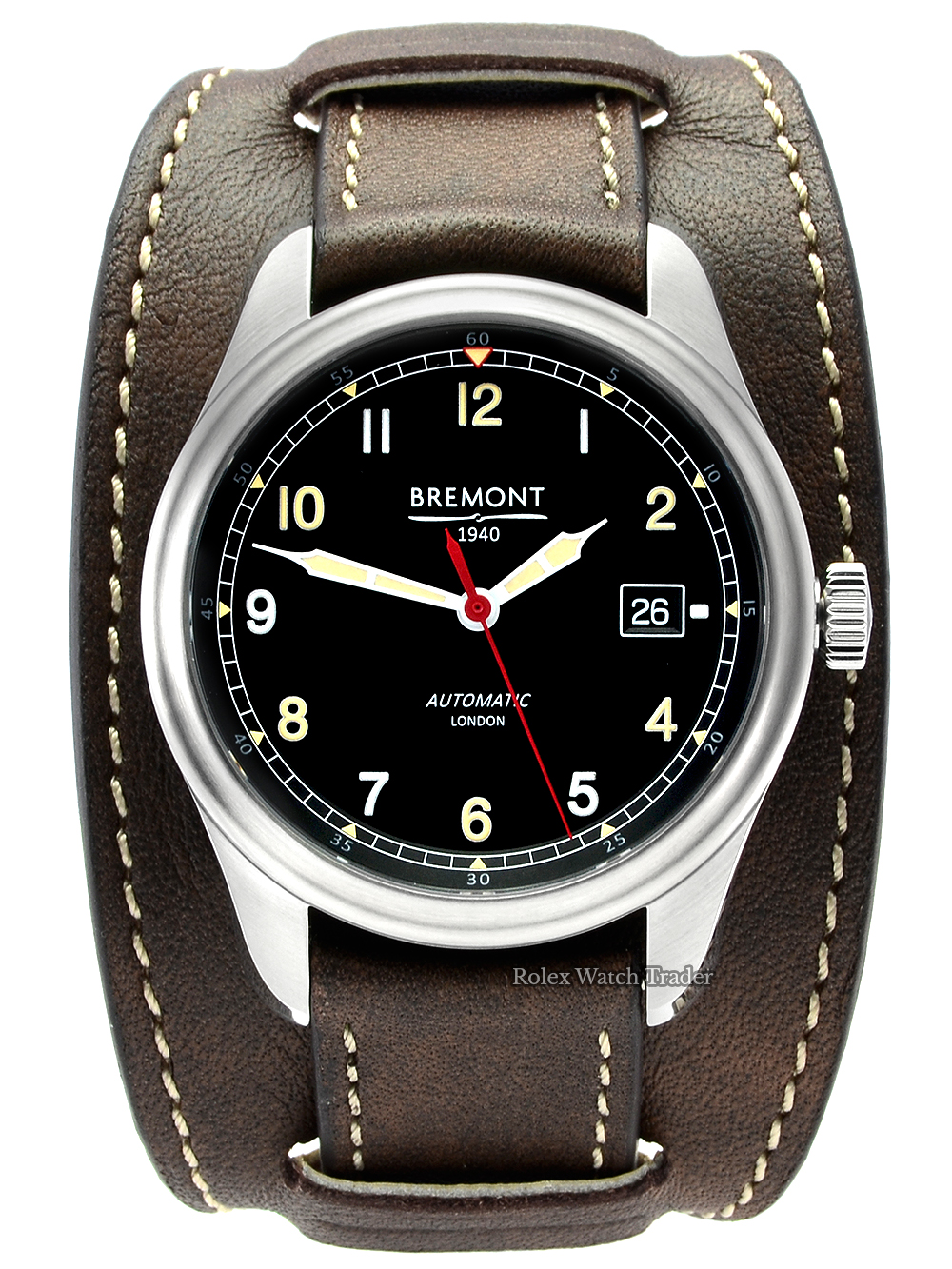 The Bremont Battle of Britain Hurricane inspired by the Airco clocks which can be found in their namesake planes that flew during the Battle of Britain. Featuring a 40mm hardened stainless steel Bremont Trip-Tick case with scratch-resistant DLC-treated barrel, housing a crisp black metal dial with date aperture at 3 o'clock, Arabic numerals with alternating SuperLuminova application, and coated nickel hands including eye-catching red seconds hand. Further the case contains within a modified calibre 11 1/2''' BE-92AE automatic chronometer movement with 21 jewels and 38h power reserve. The dial is protected by an anti-reflective scratch resistant sapphire crystal and surrounded by a stainless steel brushed finish bezel. Presented on a vintage brown leather bund strap with off-white side stitch and stainless steel pin buckle.