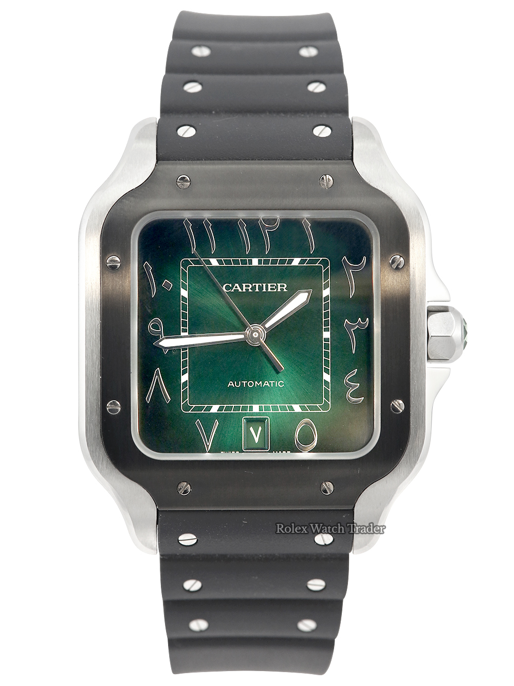 A pre-owned in pristine condition (could easily pass as unworn) large model, automatic movement, ADLC steel, interchangeable rubber and leather straps Santos de Cartier watch large model, reference WSSA0055 Manufacture mechanical movement with automatic winding, caliber 1847 MC. Steel case, ADLC bezel, steel crown set with a green faceted synthetic spinel, green dial, Hindu-Arabic numbers, steel sword-shaped hands with luminescent material, sapphire crystal. First strap in rubber, second strap in green alligator leather, interchangeable steel deploymant buckle. Both straps are fitted with the "Quick Switch" interchangeability system. Case width: 39.8 mm, thickness: 9.38 mm. Water-resistant up to 10 bar.