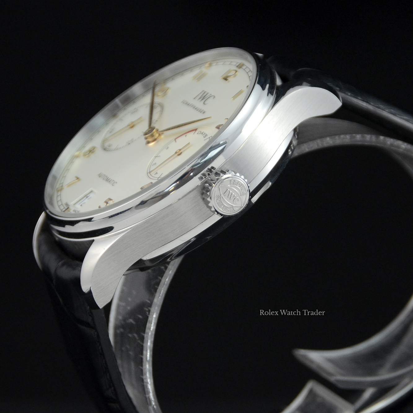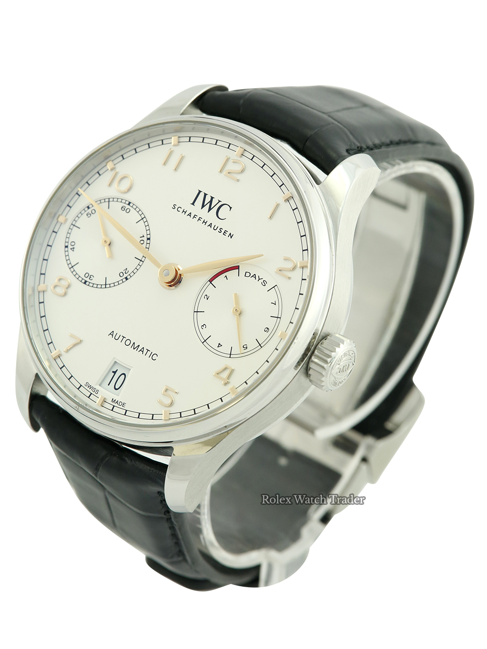A brand new and unworn IWC PORTUGIESER Automatic model reference IW500704. A stainless steel 42.3mm case, automatic, self-winding, with a 7 days power reserve, a power reserve display, a date display, a convex sapphire glass with an anti-reflective coating on both sides, pellaton automatic winding rotor with 18-carat gold medallion, a small hacking seconds presented on a black alligator leather strap with a folding deployment clasp.