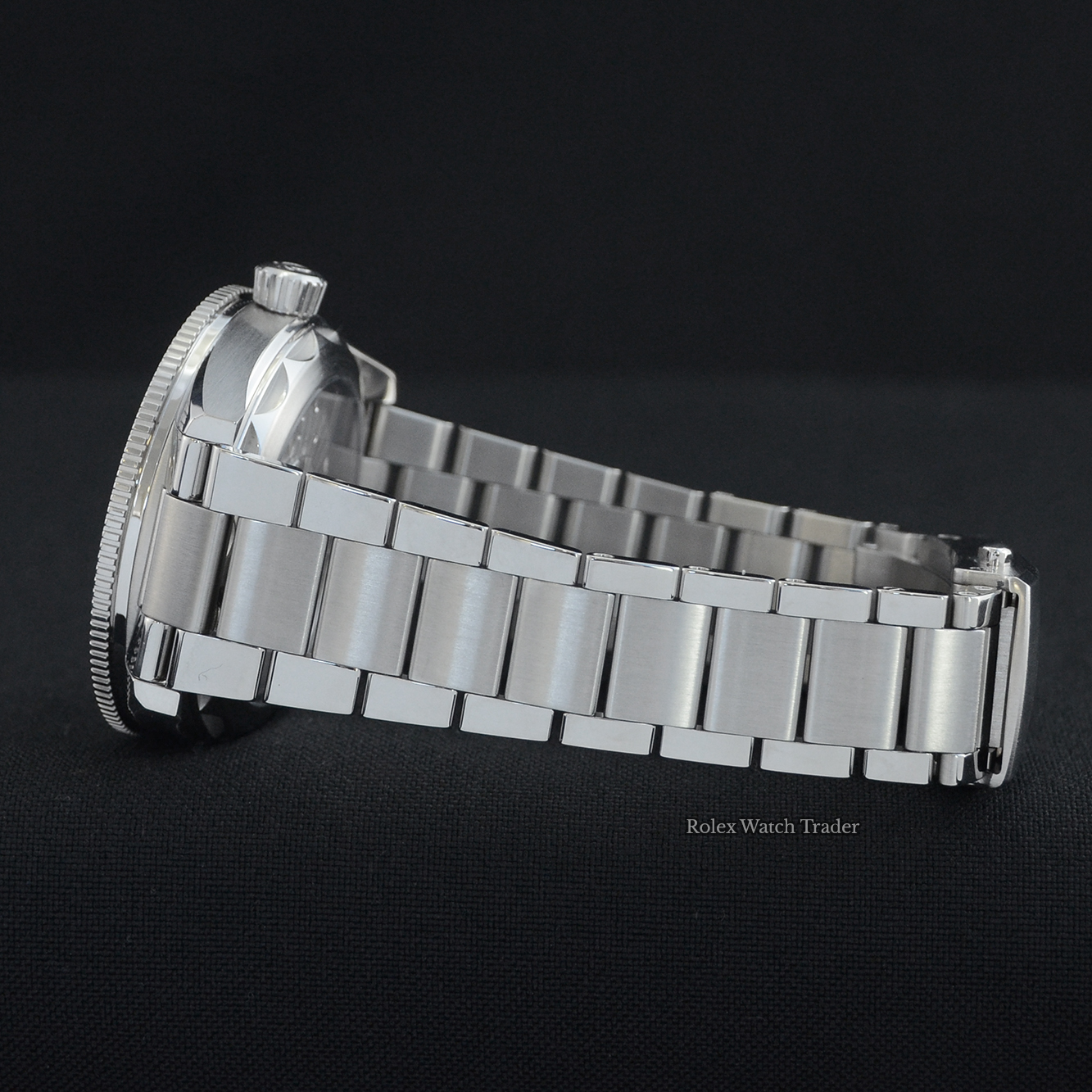 This 41 mm stainless steel model includes a blue dial and a blue oxalic anodized aluminium bezel with its diving scale filled with vintage Super-LumiNova. The recessed hour markers and open numerals feature Super-LumiNova, which is also present on the rhodium-plated hands.