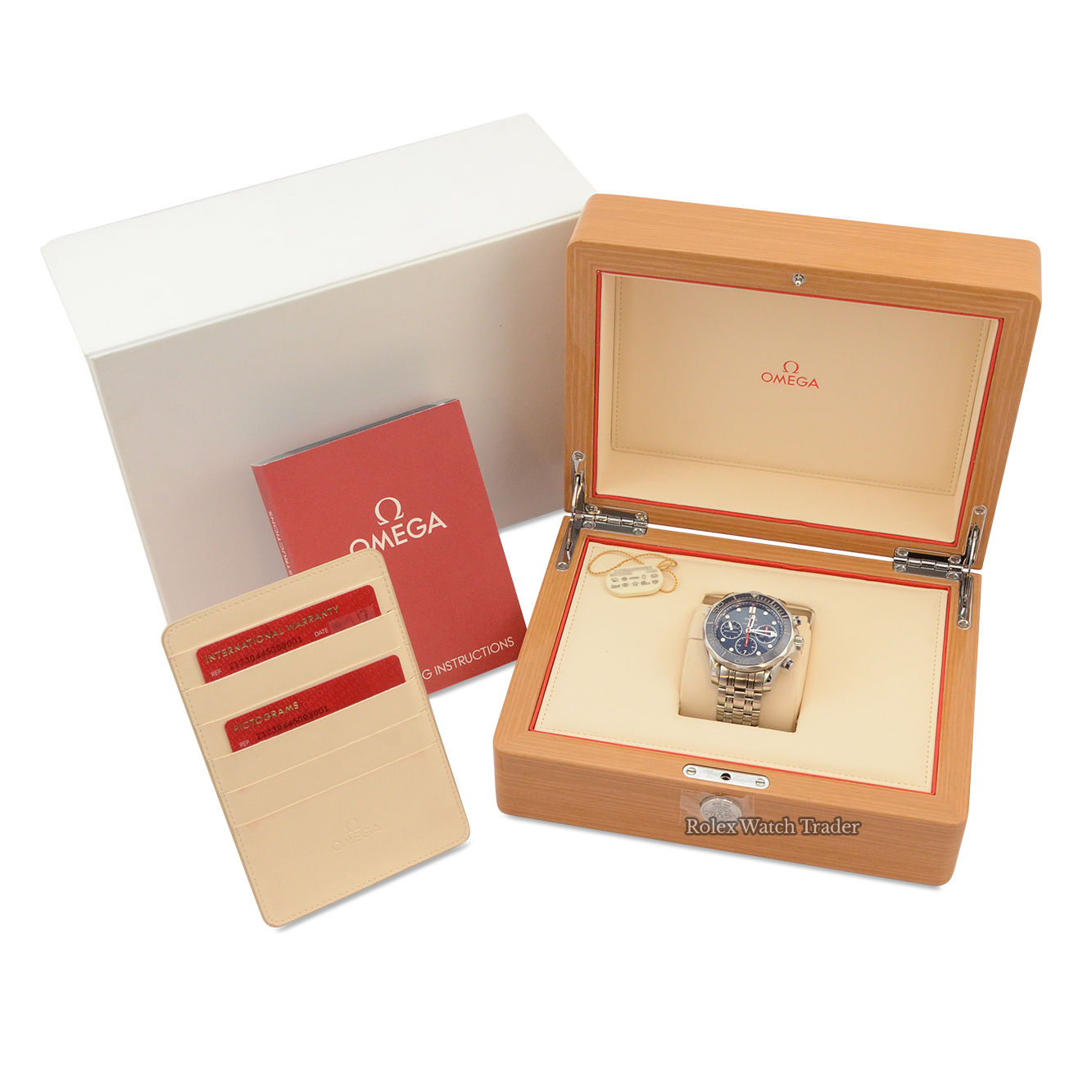 This particular watch comes supplied as shown in the detailed images with both of the original inner and outer Omega boxes, the original Omega operating instructions, the original Omega card holder, the two original Omega cards namely pictograms and the international warranty card which is dated September 2017 when first supplied new by the authorised dealer.