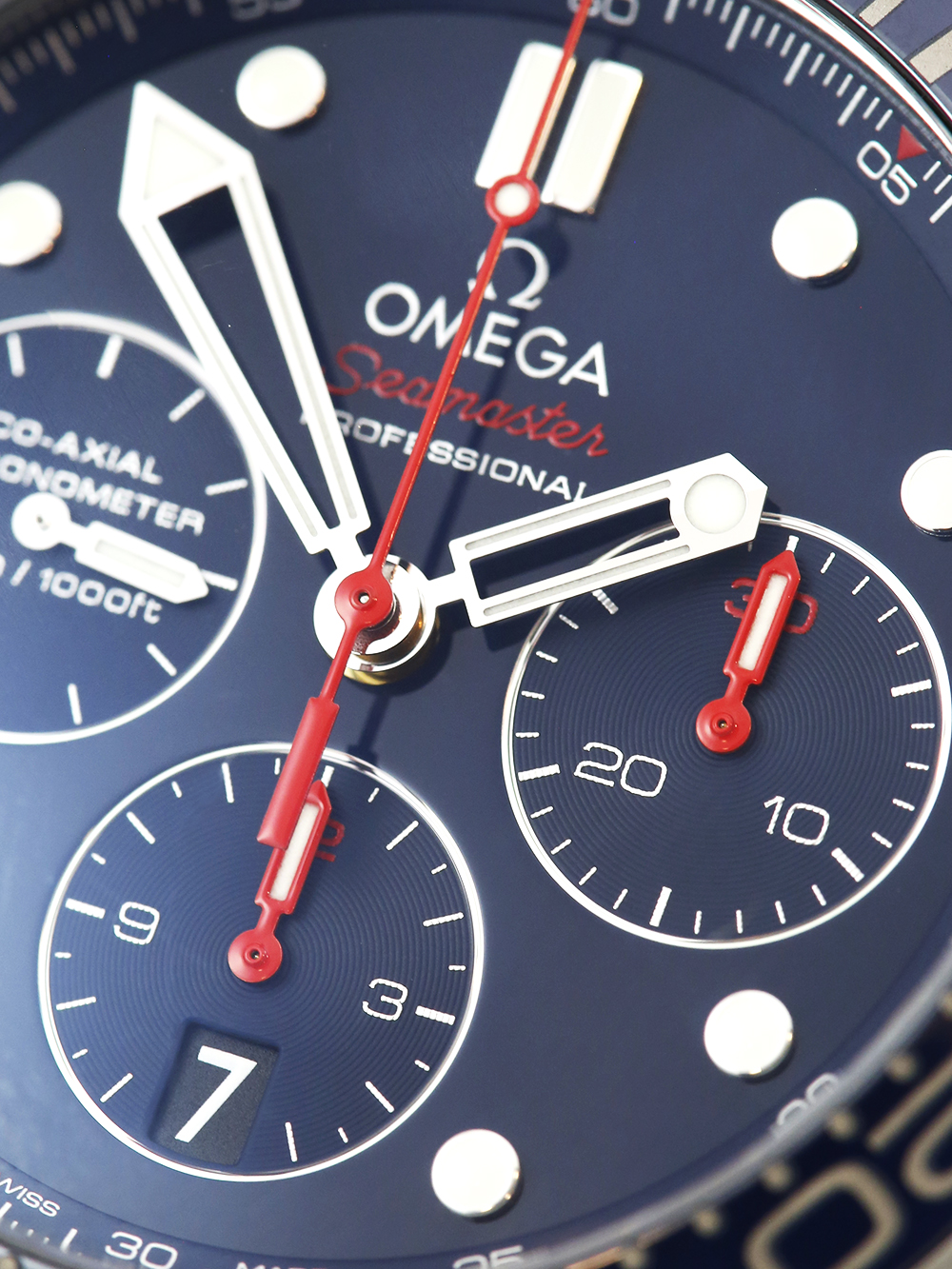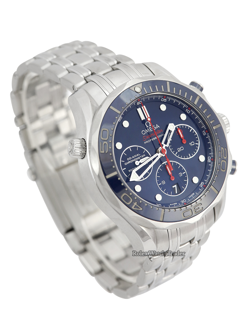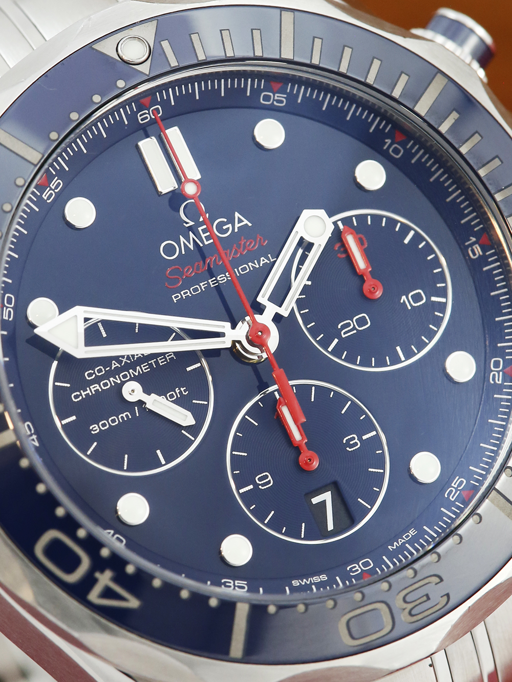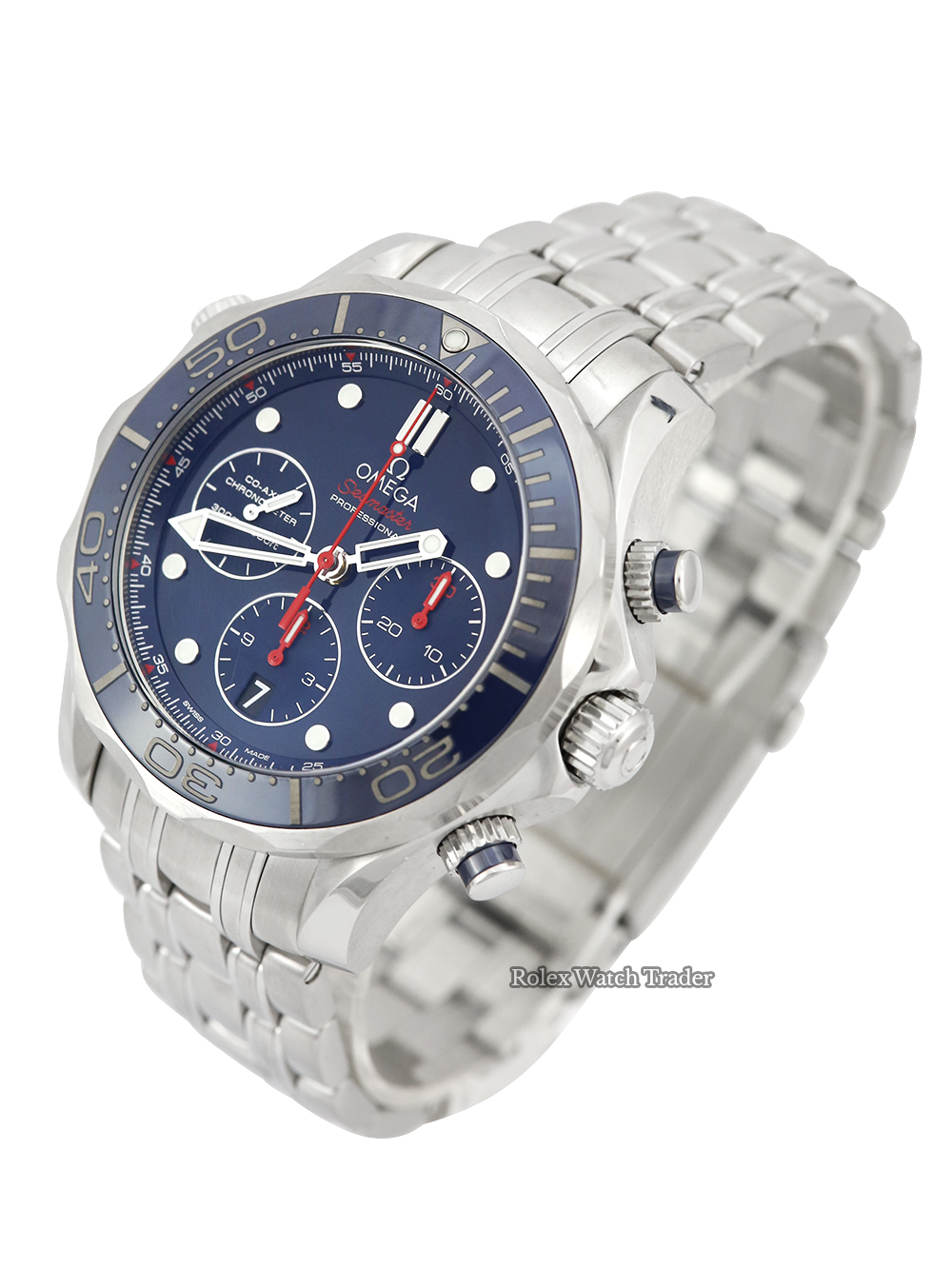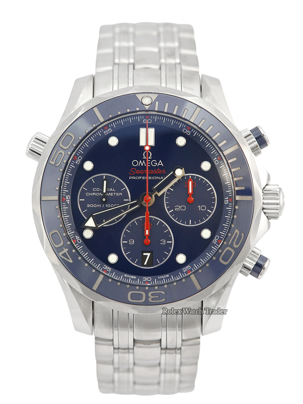 An excellent condition steel automatic, chronometer rated co-axial, stainless steel 44mm case size Omega Seamaster 300M Chronograph 212.30.44.50.03.001 featuring a blue baton dial housing a date aperture at 6 O'clock surrounded by a 60 minute uni-directional blue ceramic bezel on a full retail length Omega Seamaster bracelet.
