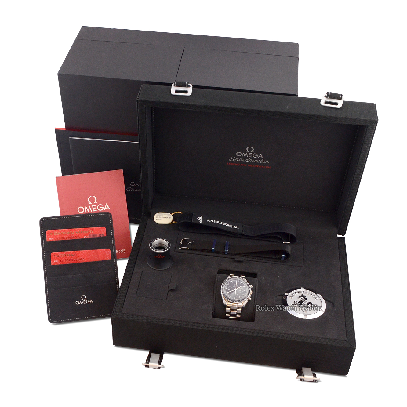 This particular watch comes supplied as shown in the detailed images with both of the original inner and outer Omega boxes, the original Omega operating instructions, two Omega booklets, Omega loupe, additional Omega canvas strap, the original Omega card holder, the two original Omega cards namely pictograms and the international warranty card which is dated November 2019 when first supplied new by the authorised dealer.