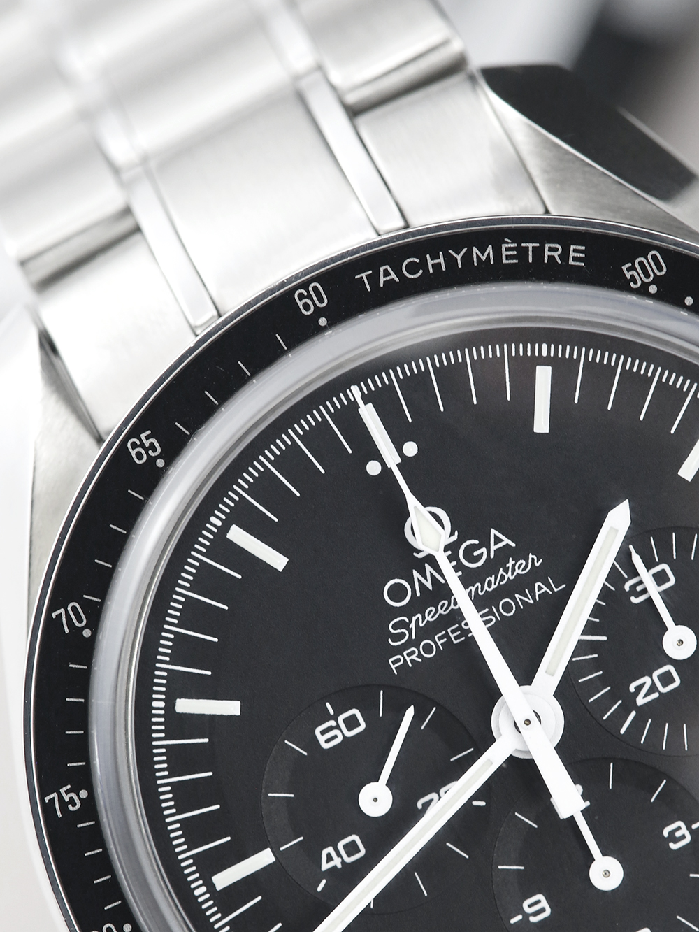 An excellent condition pre-owned 42mm case size stainless steel mechanical manual-winding, calibre 1863, Omega Speedmaster Moonwatch 311.30.42.30.01.006 featuring a black baton dial surrounded by a stainless steel bezel with a black aluminium tachymetre insert and Sapphire crystal. This particular watch comes on a full retail length stainless steel Omega Speedmaster bracelet.