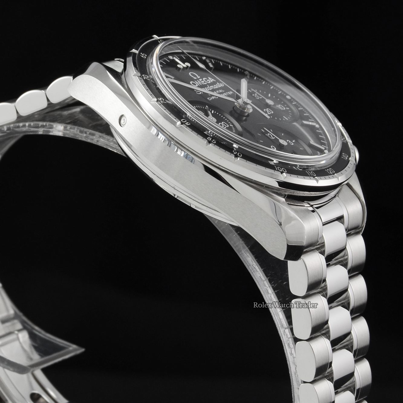 A pre-owned. in excellent condition, chronometer certified, automatic co-axial calibre 3330 Omega Speedmaster 38, model reference 324.30.38.50.01.001. Featuring a 38mm stainless steel case, housing a black dial with three black sub-dials, luminous hands and a concealed date aperture at 6 o'clock. The dial is surrounded by stainless steel bezel with a black aluminium tachymeter scale insert. This particular watch comes on a full retail length stainless steel Omega Speedmaster bracelet.