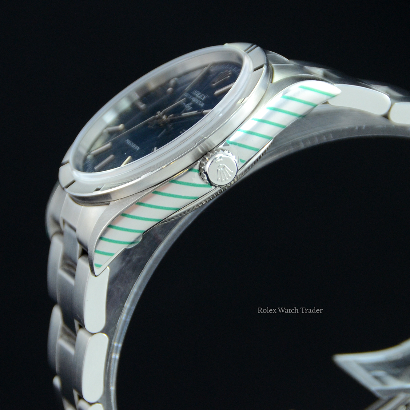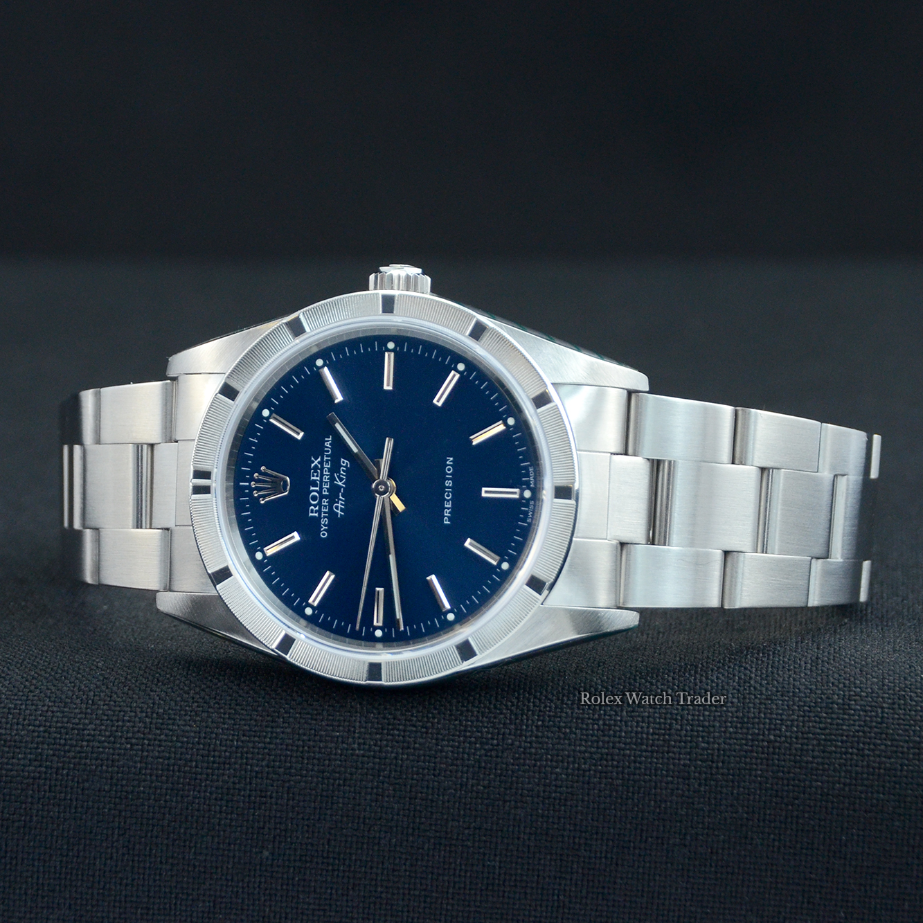 A pre-owned in as close to brand new as possible a 34mm case size stainless steel 'F' serial automatic movement Rolex Air King model reference 14010M featuring a blue baton dial surrounded by a stainless steel engine turned 'hour marker' bezel on a full retail length stainless steel Rolex Oyster bracelet.