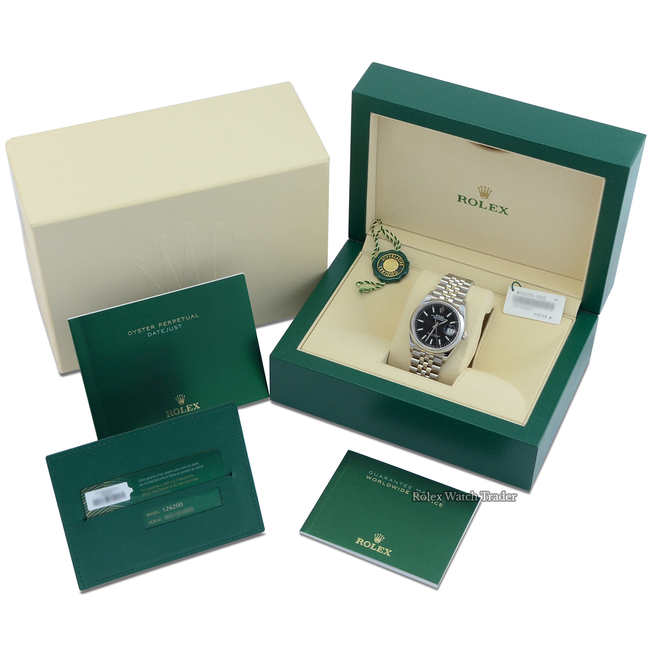 This Rolex Datejust 126200 benefits from the remainder of the 5-year manufacturer's warranty which is valid until August 2025. In addition like all our watches, it is also covered by a one-year Rolex Watch Trader warranty valid from the point of purchase.