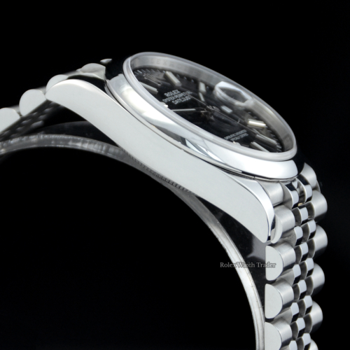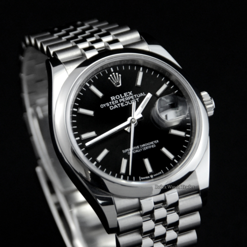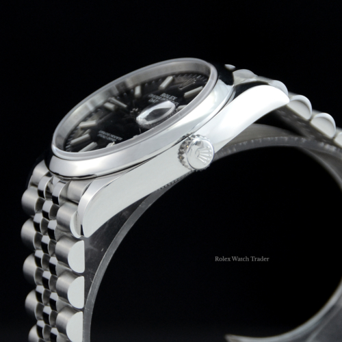 A one previous owner in pristine condition, chronometer certified automatic movement, Rolex Datejust 36 model reference 126200. Featuring a 36mm stainless steel case, housing a black baton dial with a date aperture at 3 o'clock and an external cyclops. The dial is surrounded by a smooth polished finish stainless steel bezel. Presented on a full retail length stainless steel Rolex Jubilee bracelet with brushed finish outer links and polished finish centre links, completed by a folding Oysterclasp.