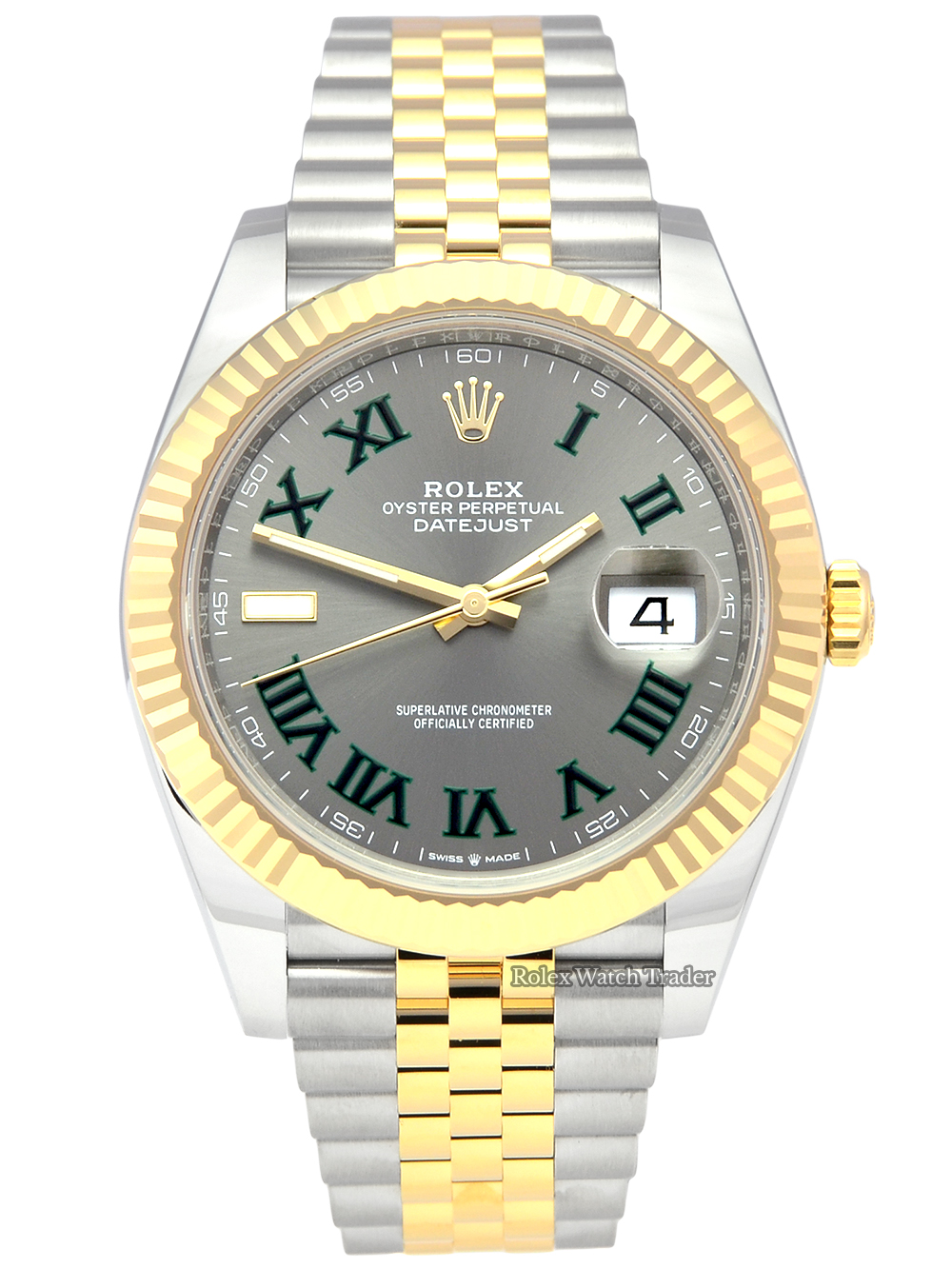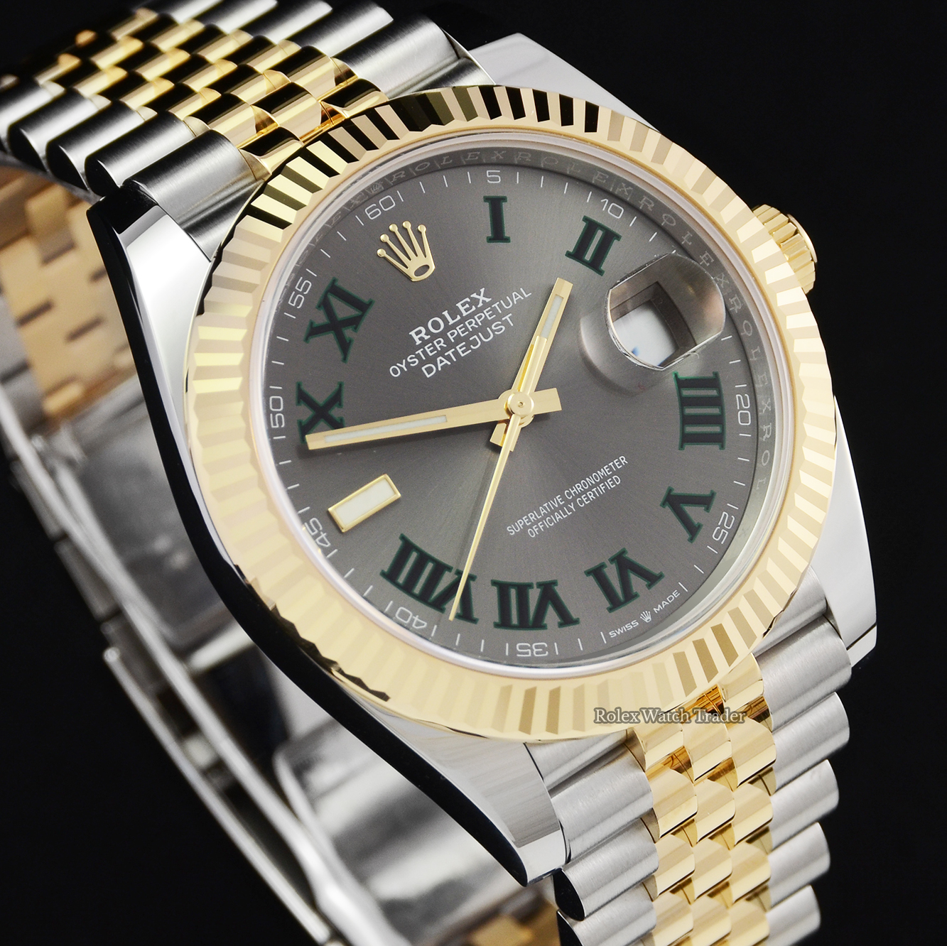 An unworn, chronometer certified, automatic movement Rolex Datejust 41, model reference 126333. Featuring a 41mm stainless steel & yellow gold case, housing the desirable grey Wimbledon dial with green-outlined Roman numerals, a luminous baton at 9 o'clock and a date aperture at 3 o'clock. The dial is surrounded by a yellow gold fluted bezel and protected by a sapphire crystal. Presented on a full retail length stainless steel and yellow gold Rolex Jubilee bracelet with an Oysterclasp.
