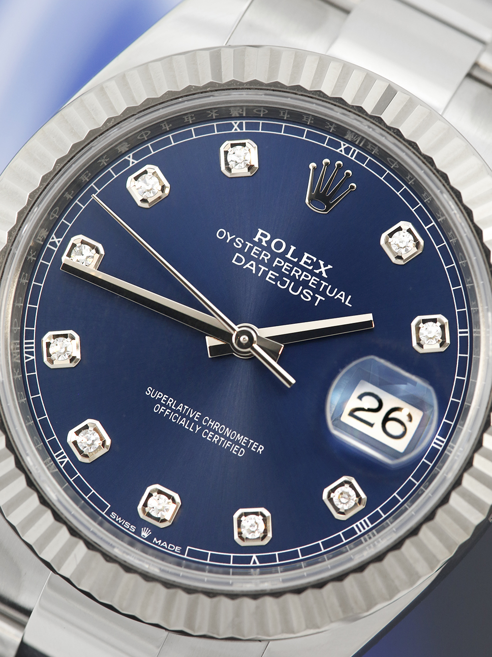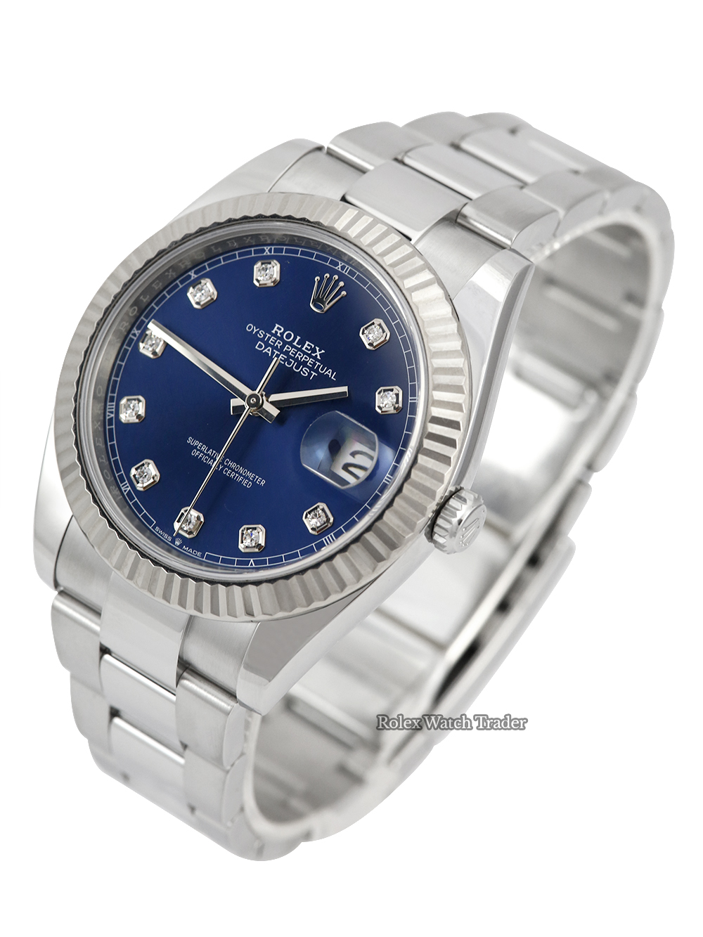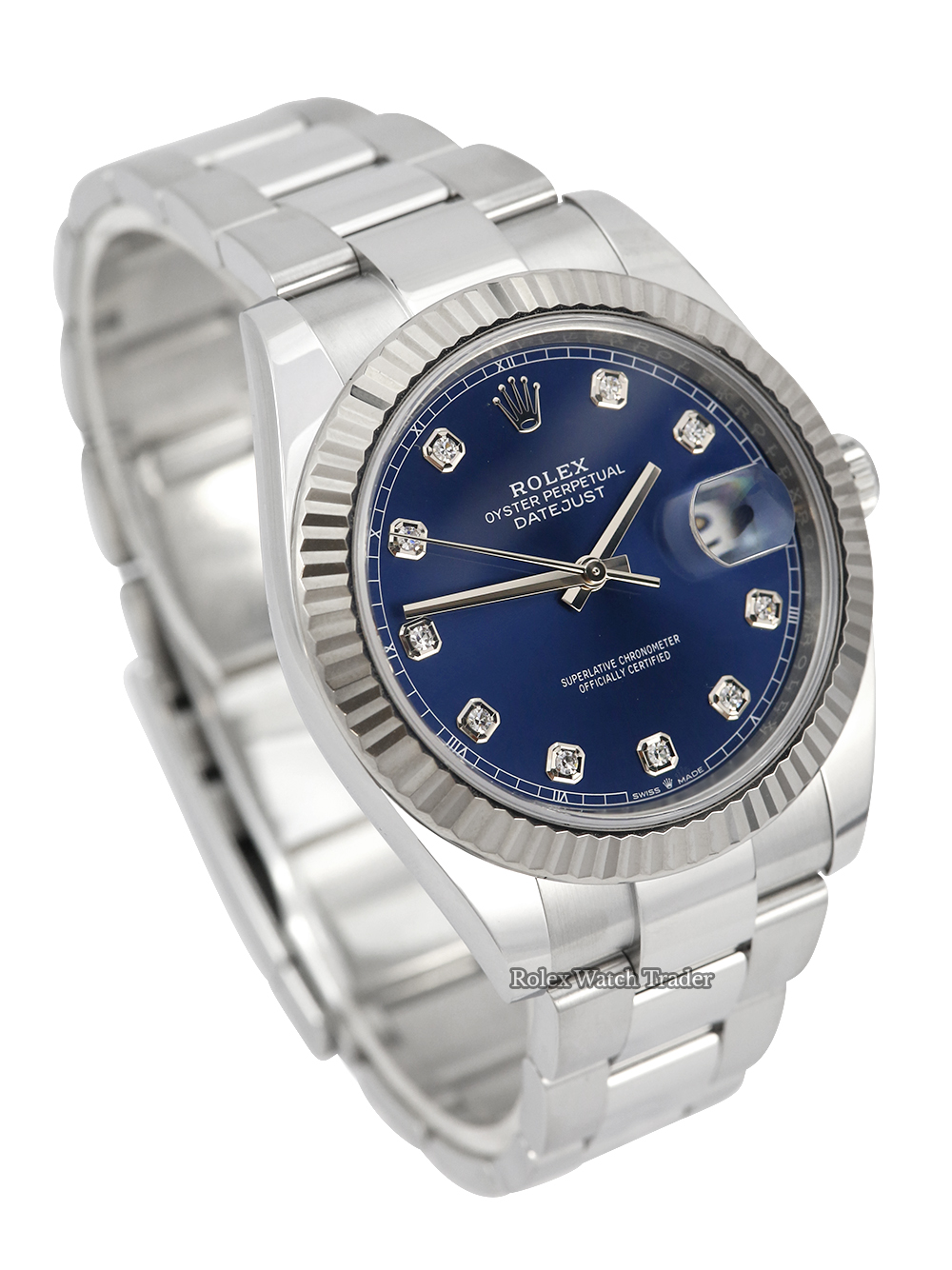 A pre-owned in excellent condition chronometer certified, automatic movement Rolex Datejust 41 model reference 126334. Featuring a 41mm stainless steel case, housing a blue dial with diamond set hour markers, a date aperture at 3 o'clock and an external cyclops. The dial is surrounded by a white gold fluted bezel. Presented on a full retail length stainless steel Rolex Oyster bracelet fitted with an Oyster clasp.