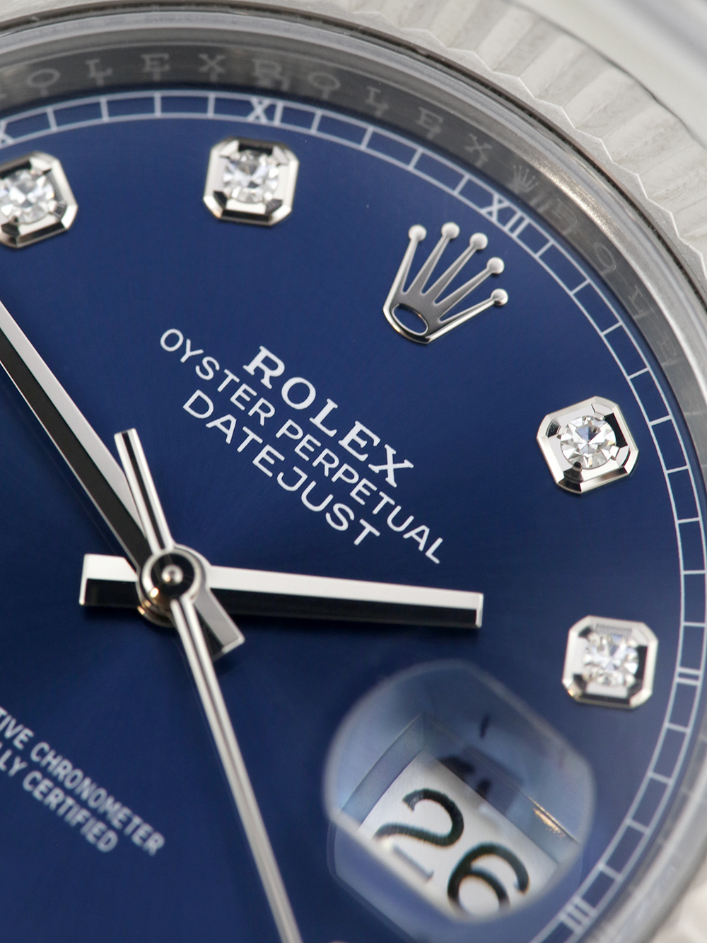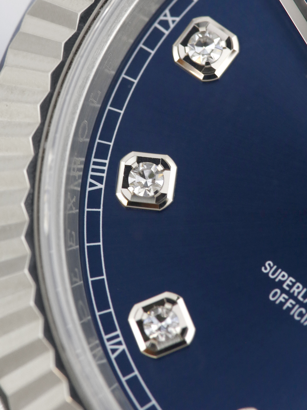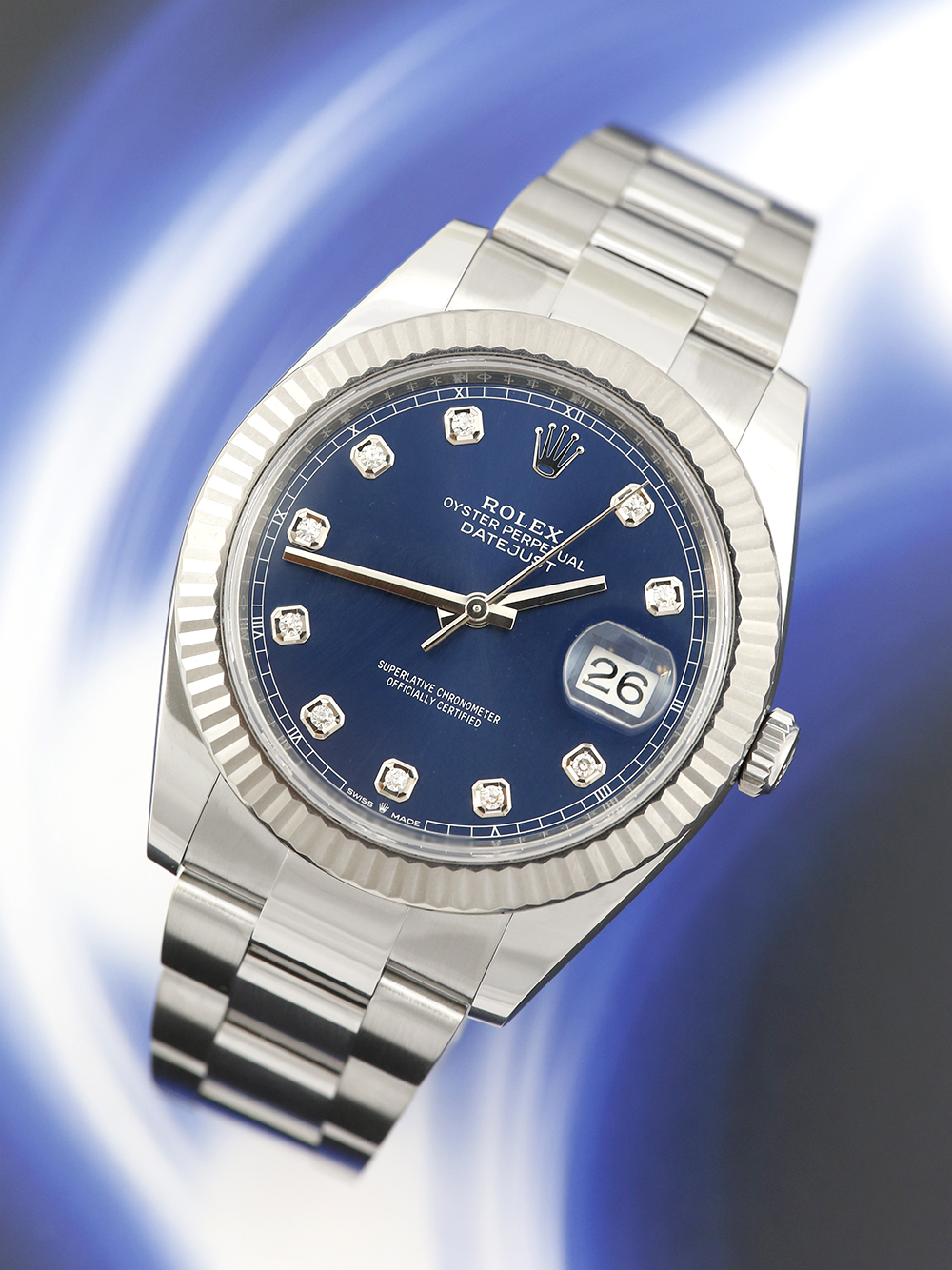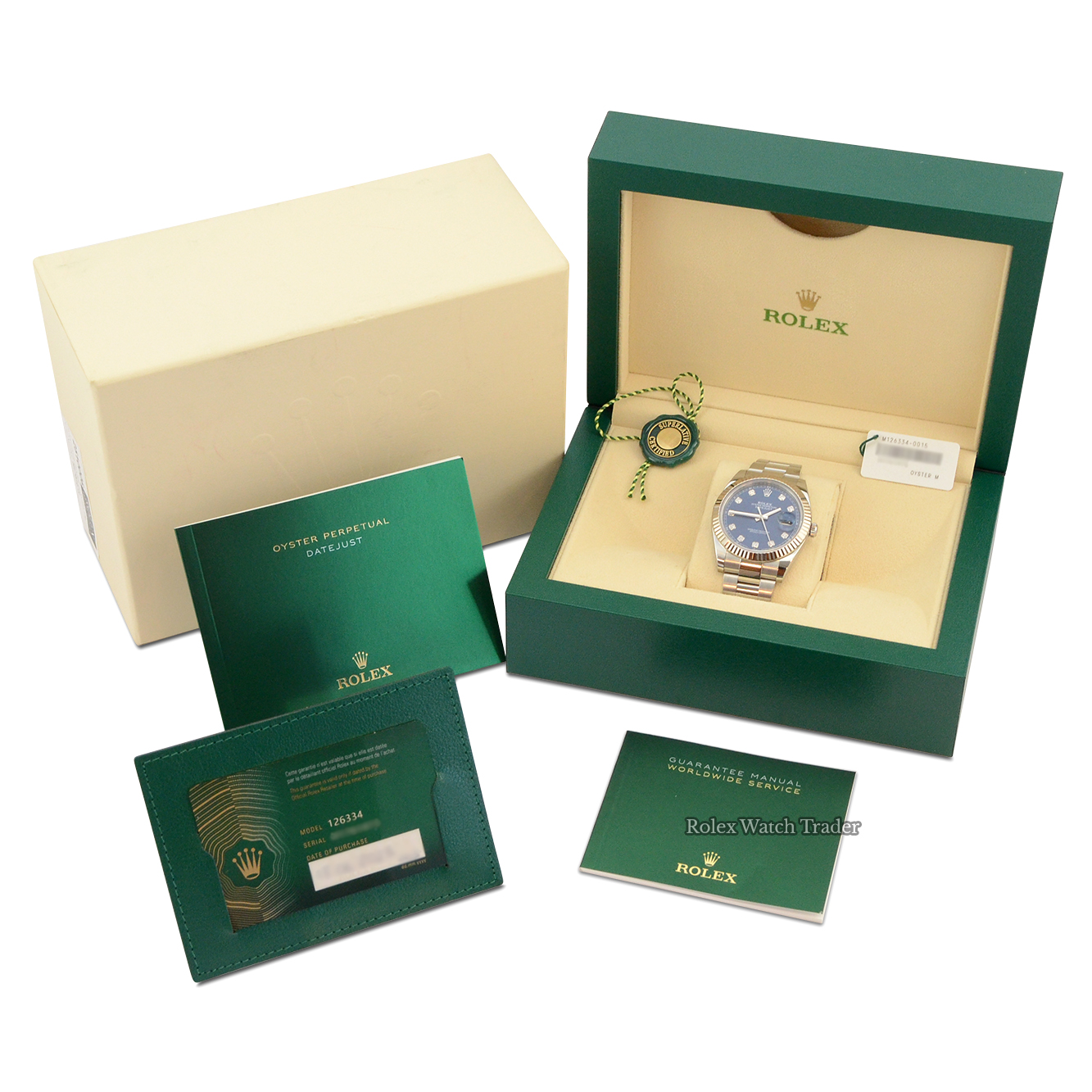 A pre-owned in excellent condition chronometer certified, automatic movement Rolex Datejust 41 model reference 126334. Featuring a 41mm stainless steel case, housing a blue dial with diamond set hour markers, a date aperture at 3 o'clock and an external cyclops. The dial is surrounded by a white gold fluted bezel. Presented on a full retail length stainless steel Rolex Oyster bracelet fitted with an Oyster clasp.