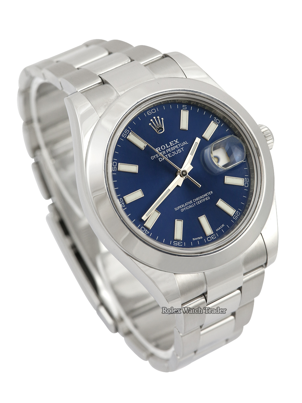 A pre-owned in excellent condition stainless steel 41mm case size chronometer certified automatic movement Rolex Datejust II model reference 116300 featuring a blue baton dial housing a date aperture at 3 o'clock surrounded by a stainless steel domed bezel on a full retail length stainless steel Rolex Oyster bracelet.