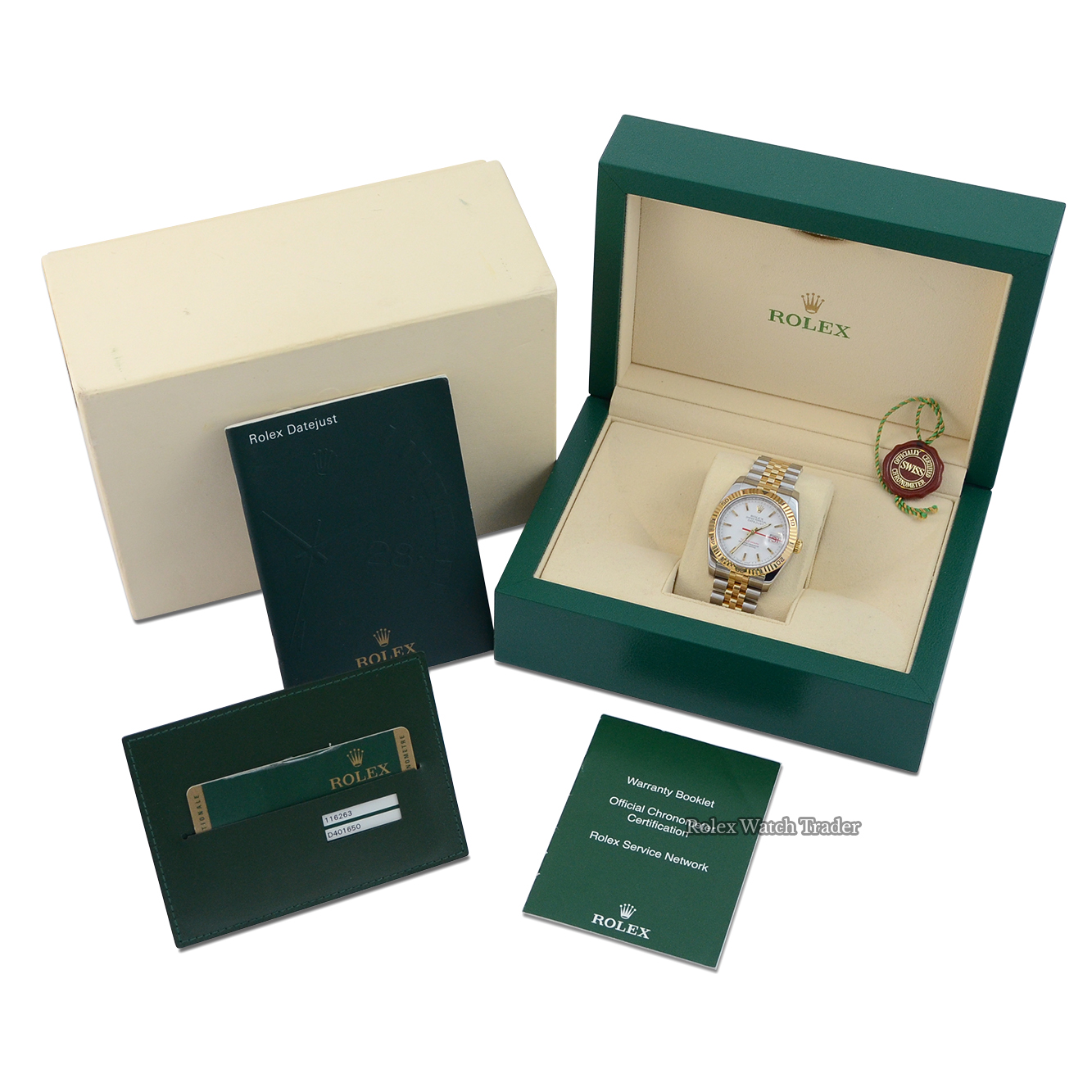 This particular watch is supplied as shown in the detailed images with both of the original Rolex inner and outer boxes, the two original Rolex booklets, one original Rolex swing tag, the original Rolex warranty card holder and the original Rolex warranty card which is dated March 2008 when the watch was first purchased new.