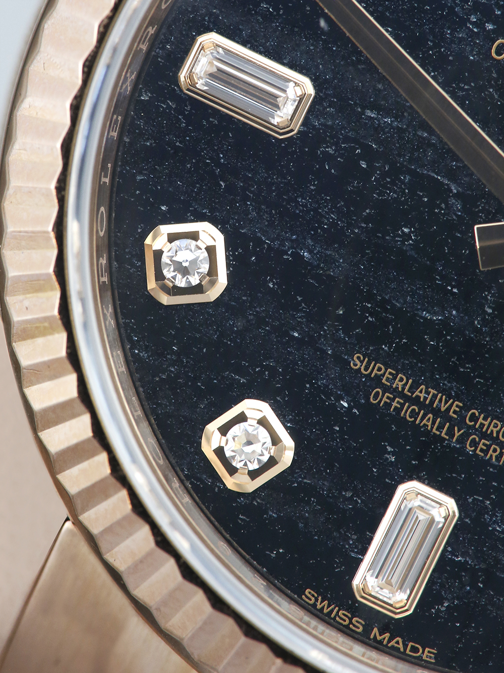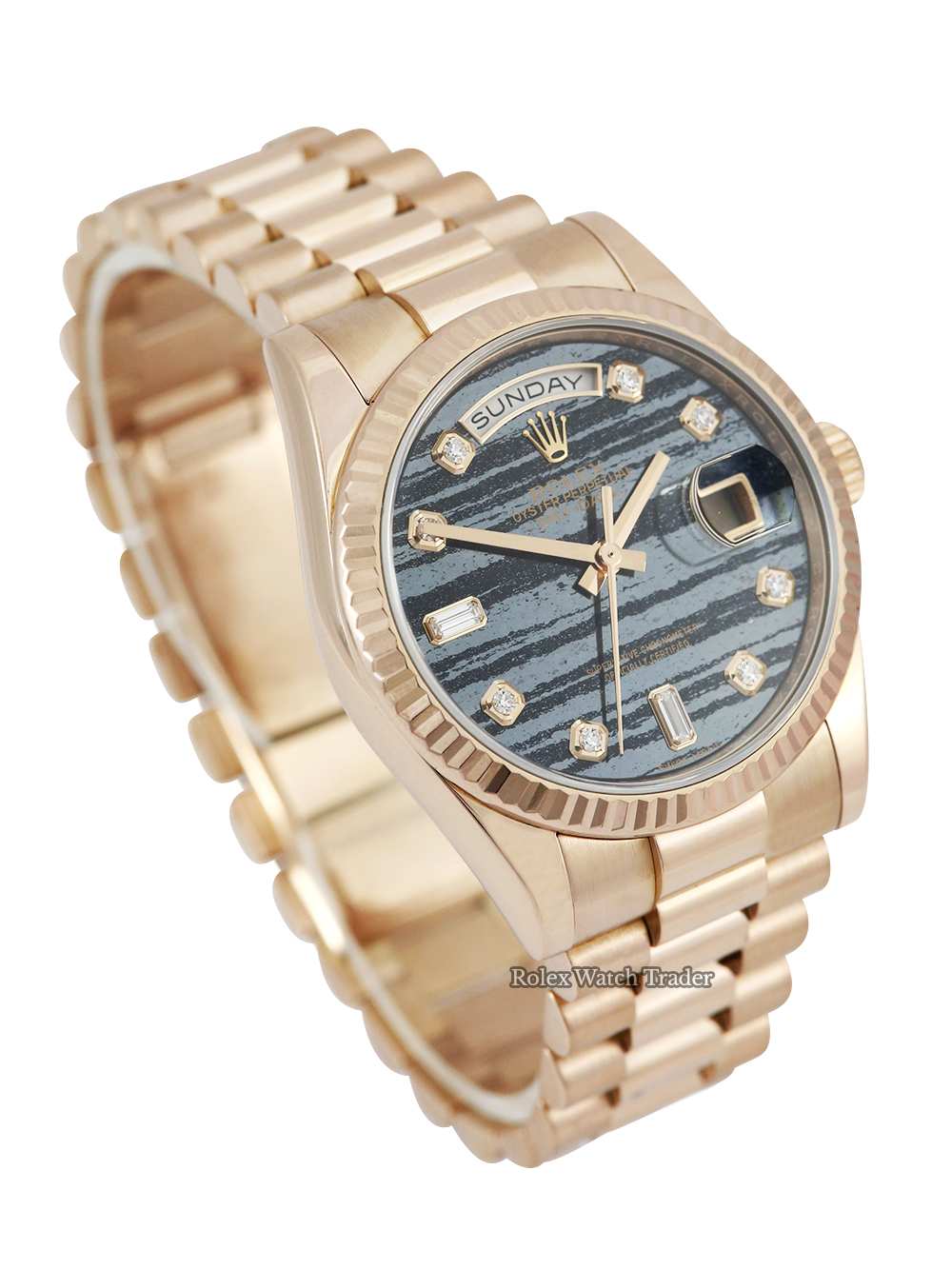 An excellent condition pre-owned rose gold chronometer certified automatic movement 36mm case size Rolex Day-Date 118235 featuring a Ferrite diamond dot dial housing a date aperture at 3 O'clock with an external Cyclops and day aperture in-between 11 & 1 O'clock surrounded by a rose gold fluted bezel on a rose gold Rolex President bracelet