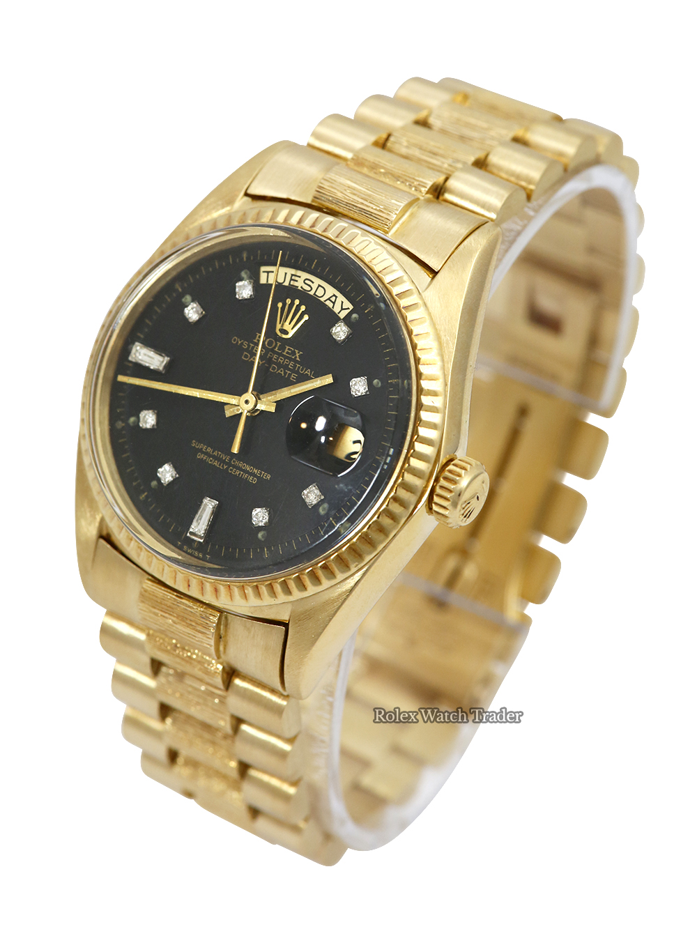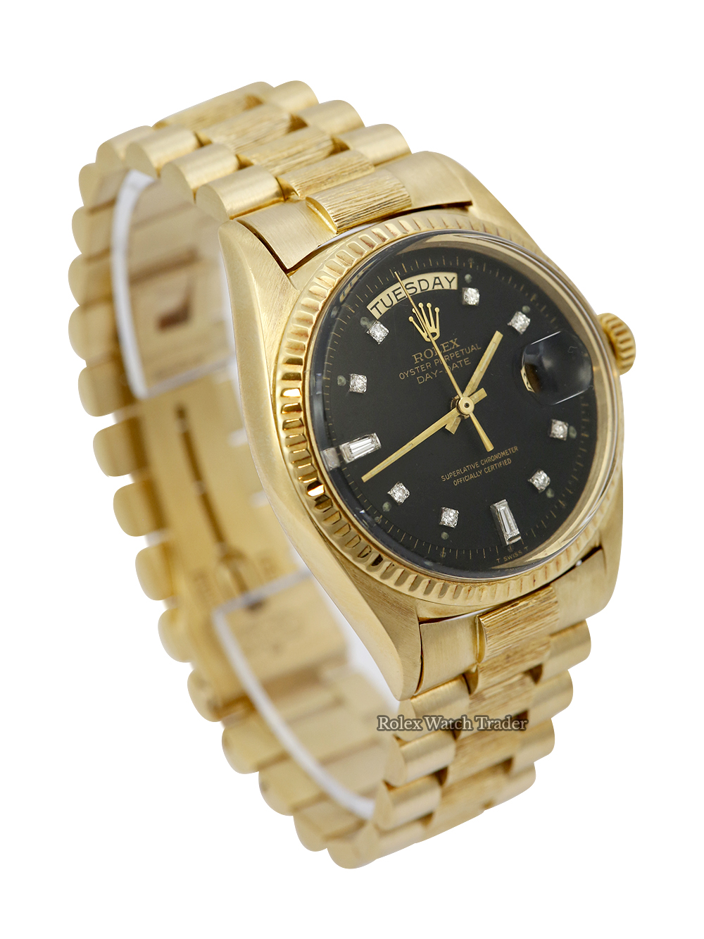 An excellent condition pre-owned chronometer rated automatic movement yellow gold Rolex Day-Date model reference 1803 featuring a stunning after market black diamond dot dial surrounded by a yellow gold fluted bezel on a yellow gold "bark finish" Rolex President bracelet.