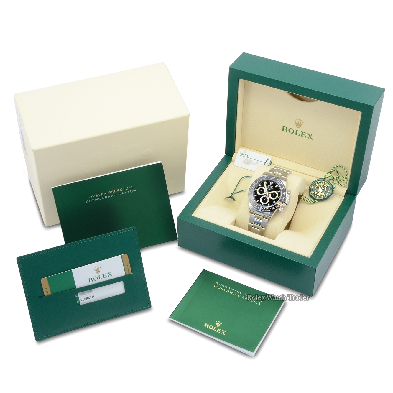 This Rolex Daytona 116500LN benefits from the remainder of the 5-year manufacturer's warranty which is valid until November 2023. In addition like all our watches, it is also covered by a one-year Rolex Watch Trader warranty valid from the point of purchase.