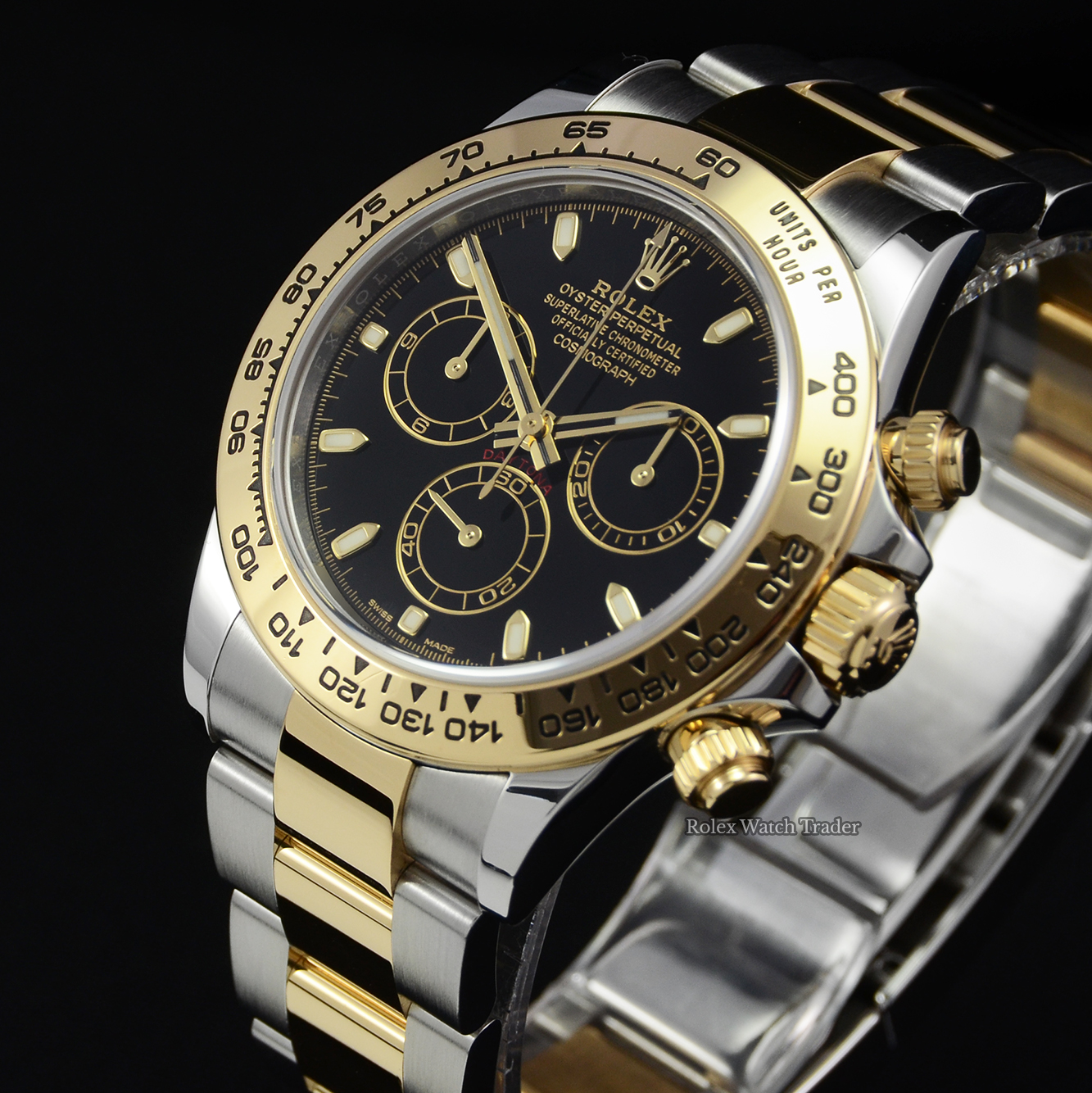 A very good condition, one previous owner, chronometer certified, automatic movement Rolex Daytona model reference 116503. Featuring a 40mm bimetal stainless steel and yellow gold case, housing a black dial with three black sub-dials. The dial is surrounded by a yellow gold units per hour tachymeter bezel. All presented on a full retail length stainless steel and yellow gold Rolex Oyster bracelet with a secure Oysterlock folding clasp.