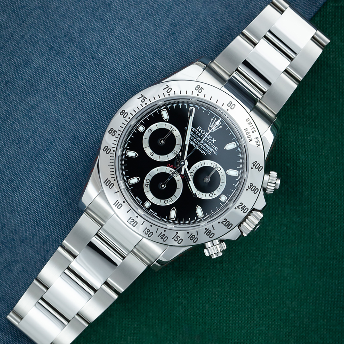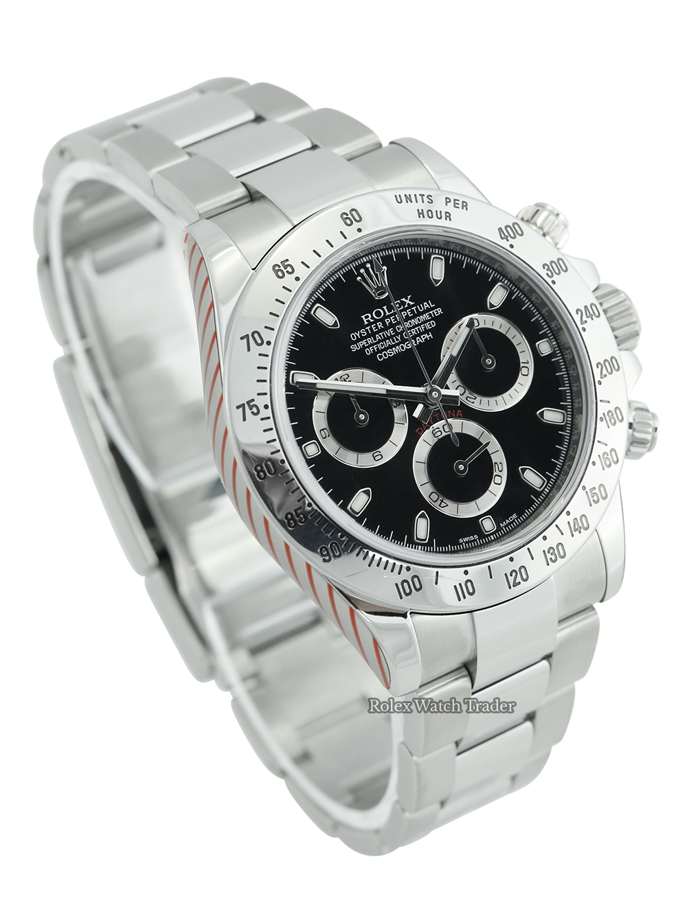 An excellent condition pre-owned stainless steel chronometer certified automatic movement Rolex Daytona model reference 116520 featuring a black baton dial housing silver outlined black sub-dials surrounded by a stainless steel units per hour bezel on a full retail length stainless steel Rolex Oyster bracelet.