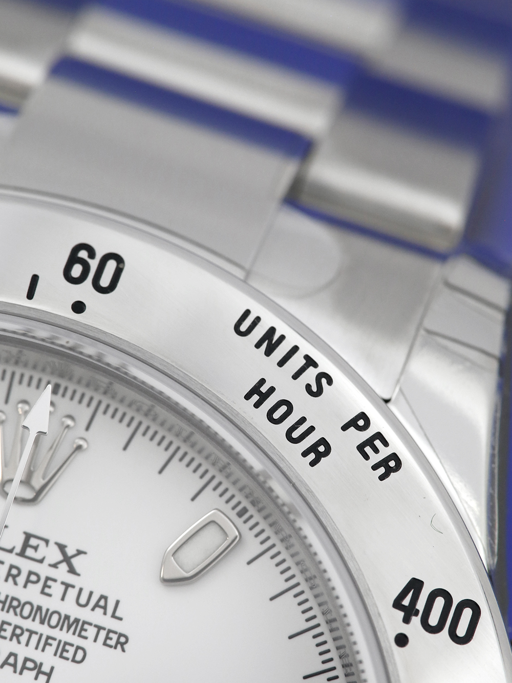 As mentioned above a unworn, untampered with all factory stickers intact 40mm case size stainless steel random serial superlative chronometer, calibre 4130, automatic movement Rolex Daytona model reference 116520 featuring a white baton 'APH' dial housing silver outlined white sub-dials surrounded by a stainless steel units per hour bezel on a full retail length stainless steel Rolex Oyster bracelet.