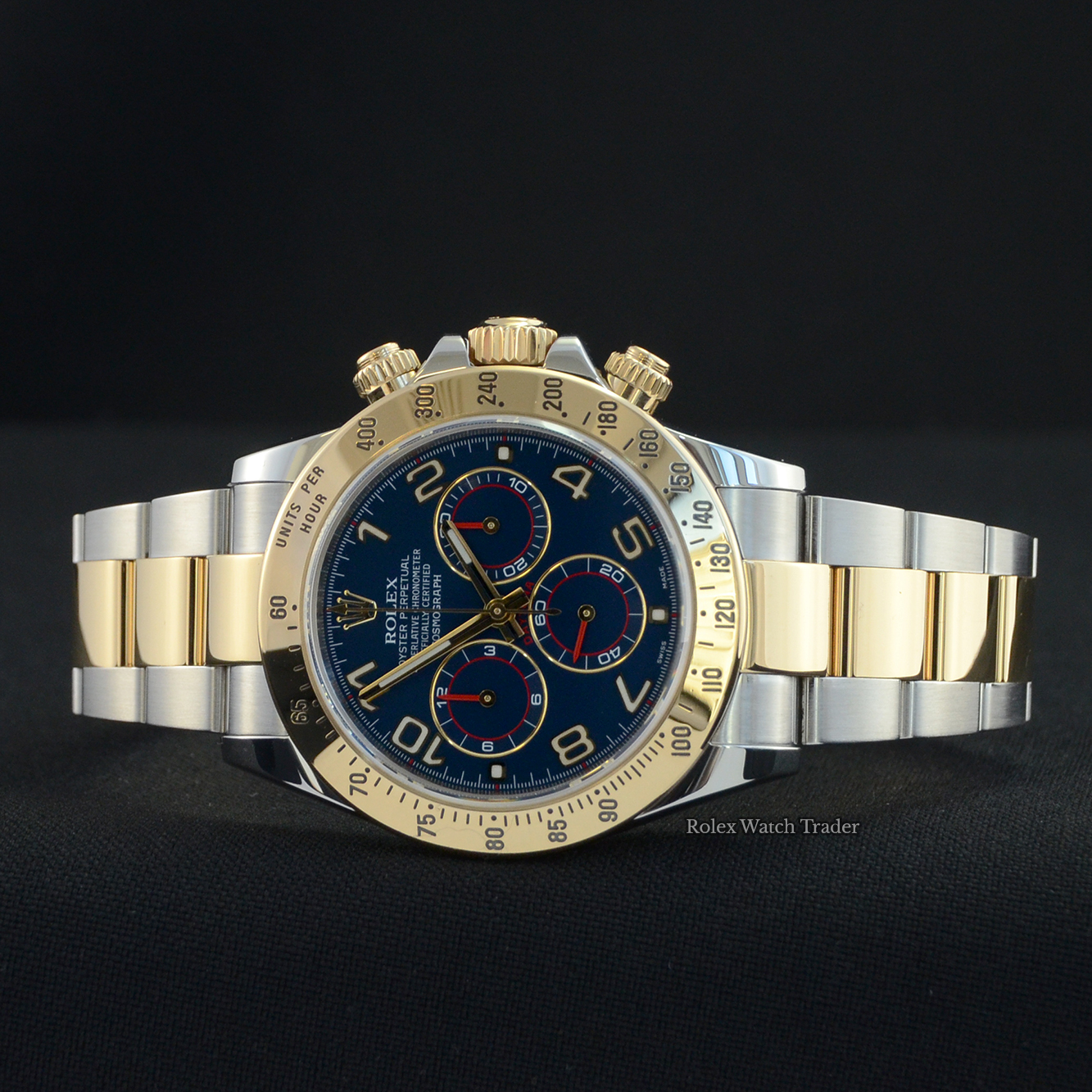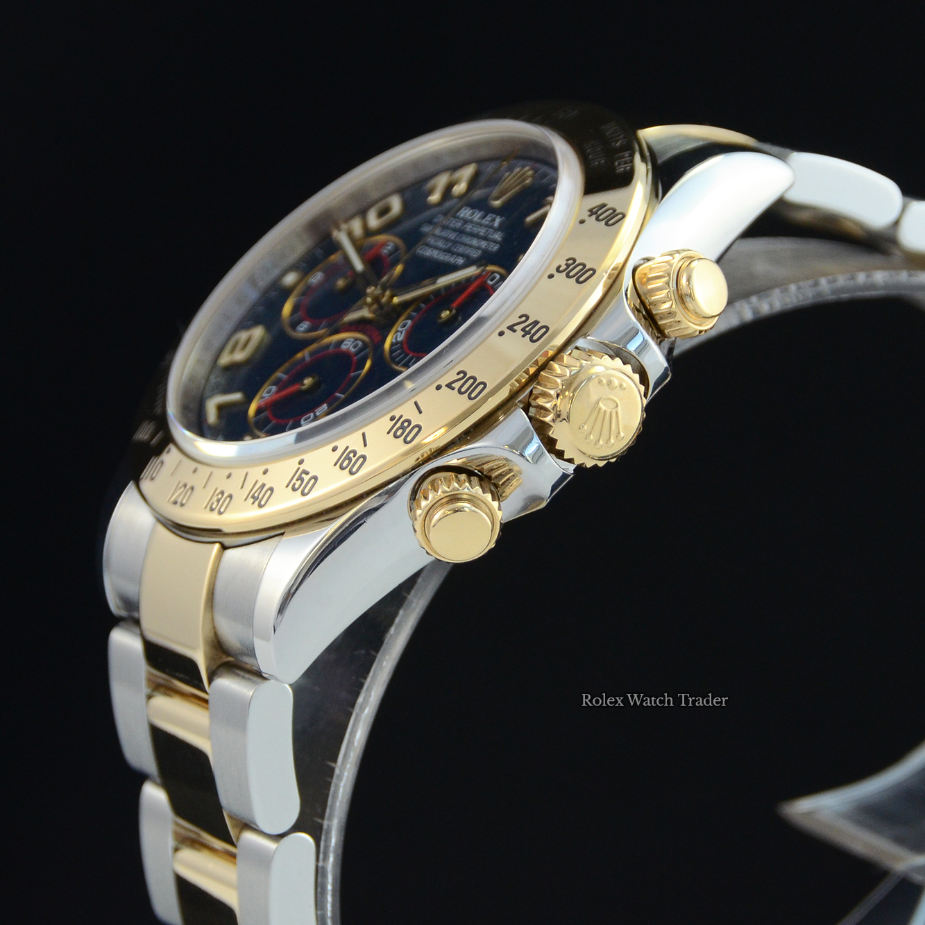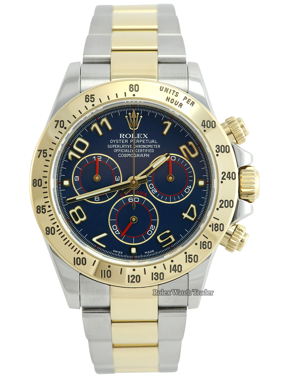 An excellent condition, chronometer certified, automatic movement Rolex Daytona 116523. Featuring a 40mm bimetal stainless steel and yellow gold case, housing a dark blue Arabic numeral dial with three gold-outlined sub-dials with red detail. The dial is surrounded by a yellow gold units per hour tachymeter bezel. All presented on a full retail length stainless steel and yellow gold Rolex Oyster bracelet with a secure Oysterlock folding clasp.
