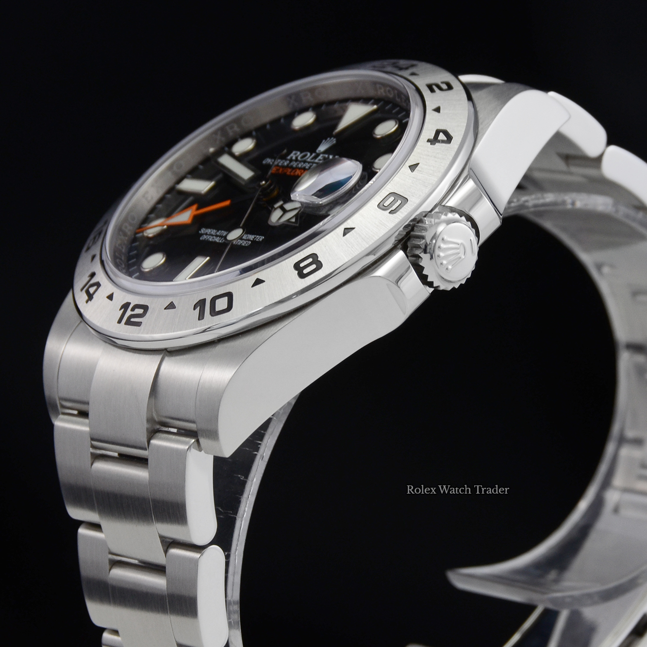 An unworn, chronometer-certified, automatic movement Rolex Explorer II, model reference 216570. Featuring a 42mm stainless steel case, housing a black baton dial with a date aperture at 3 o'clock and an orange GMT hand which is true to the original Rolex Explorer II design. The dial is surrounded by a non-moving 24-hour bezel. Presented on a full retail length brushed finish stainless steel Rolex Oyster bracelet with a secure Oysterlock folding clasp.