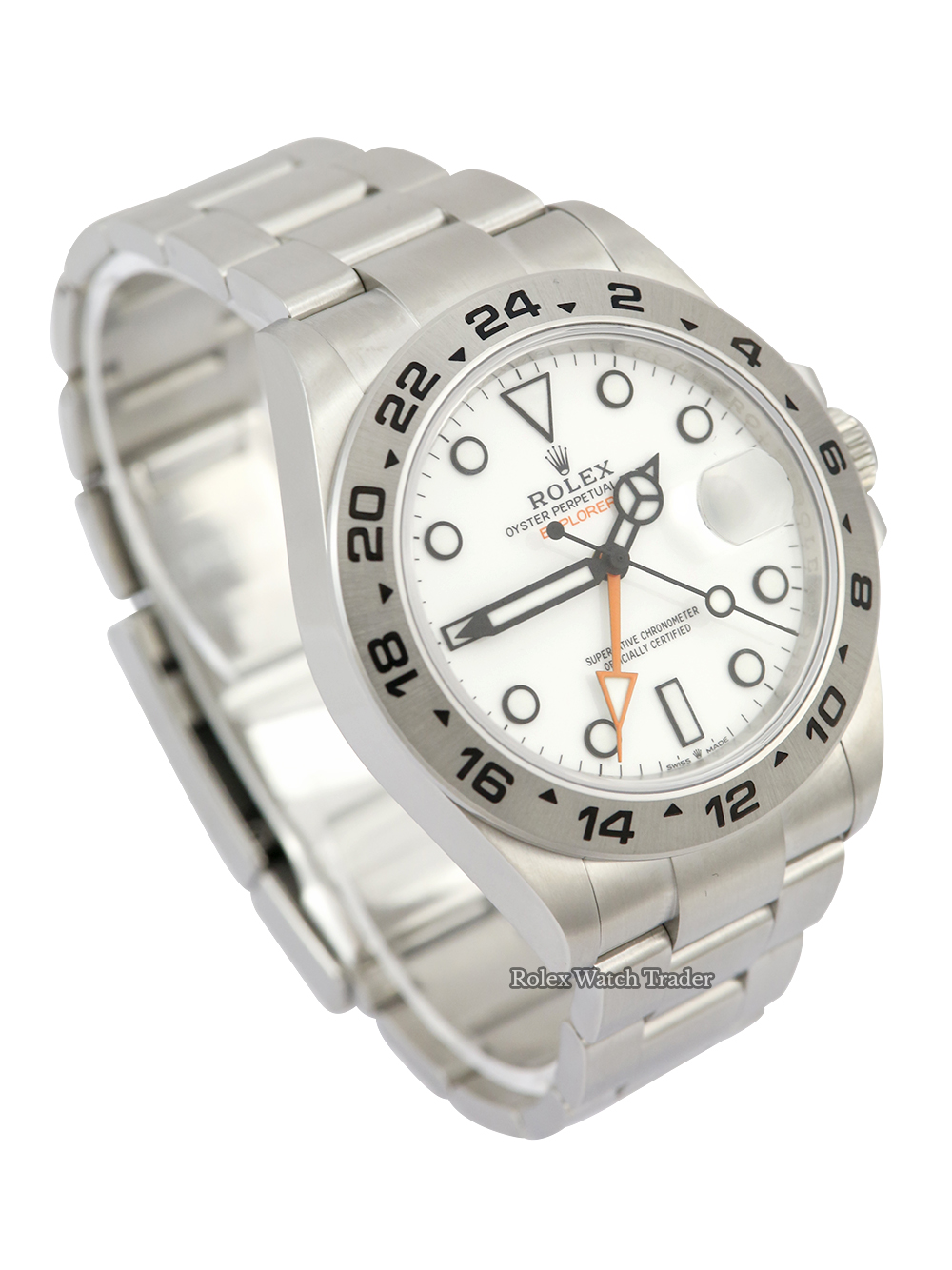 A pre-owned in excellent condition unpolished 42mm case size Oyster Steel superlative chronometer, calibre 3285, automatic movement Rolex Explorer II model reference 226570 featuring a white baton dial housing a date aperture at 3 O'clock and an orange GMT hand which is true to the original Rolex Explorer design. The dial is surrounded by a non-moving 24-hour bezel and the watch comes on a full retail length brushed finish Oyster Steel Rolex Oyster bracelet.