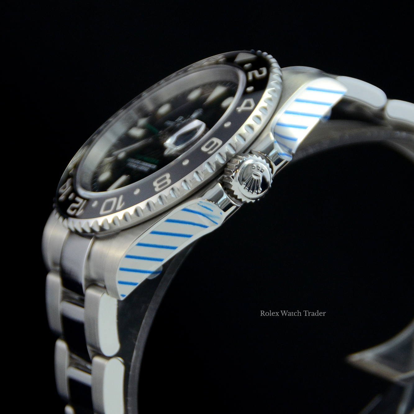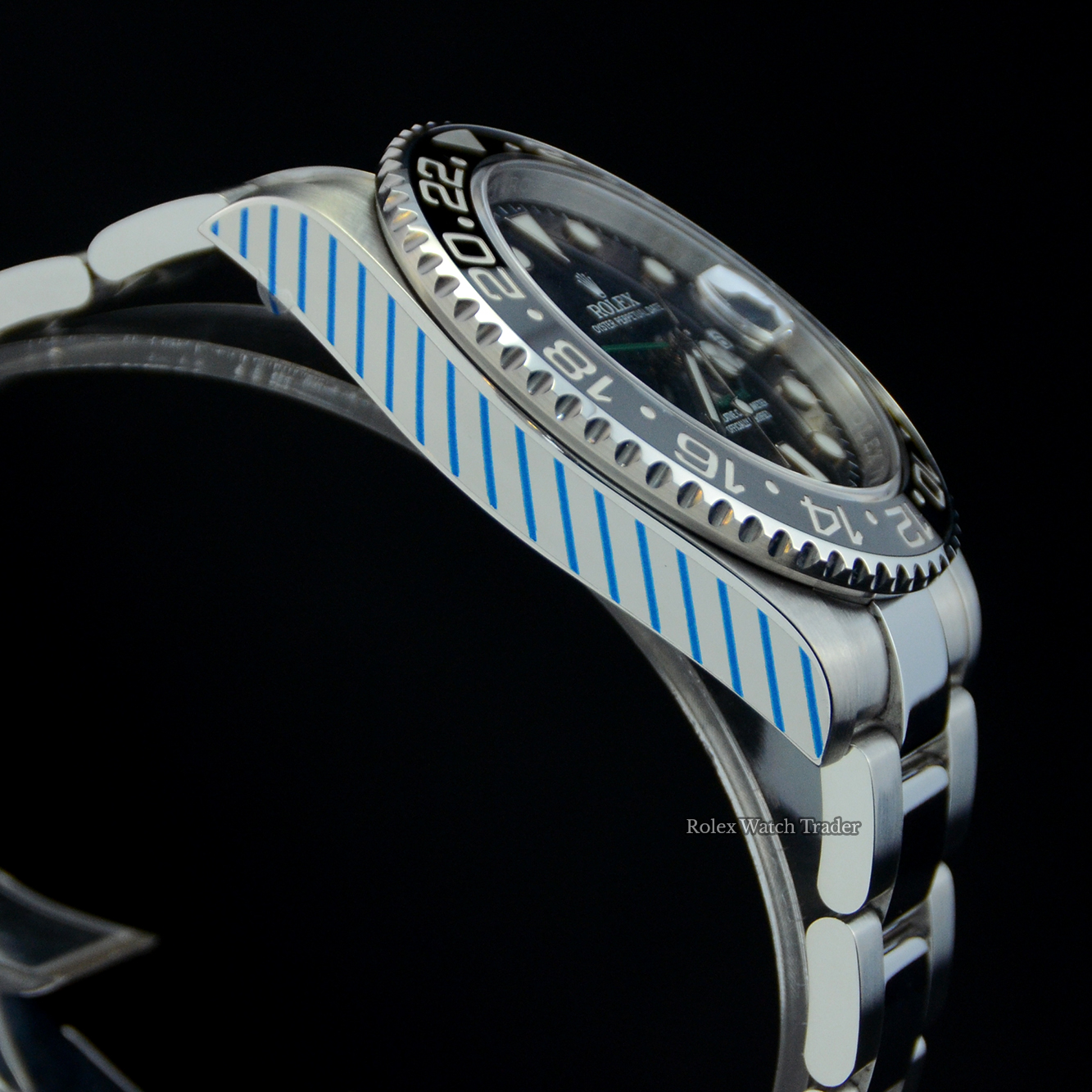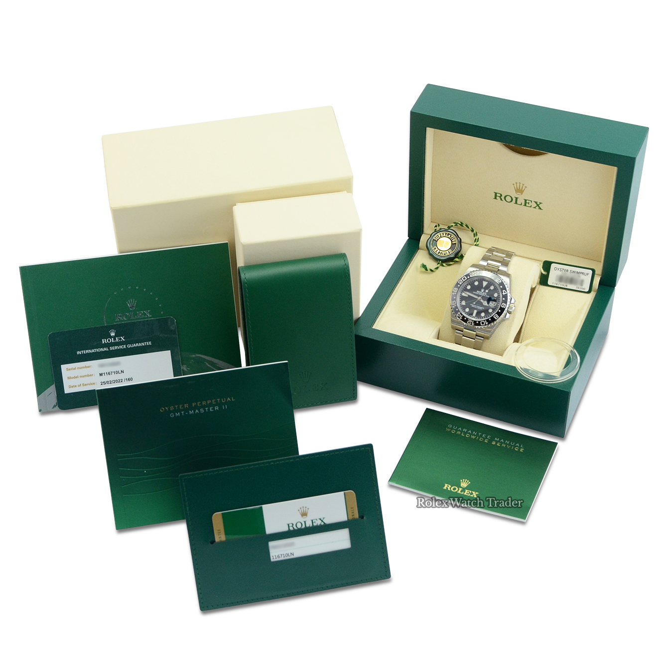 This Rolex GMT-Master II 116710LN benefits from the remainder of the Rolex service warranty which expires in February 2024 and one year Rolex Watch Trader warranty valid from the point of purchase.