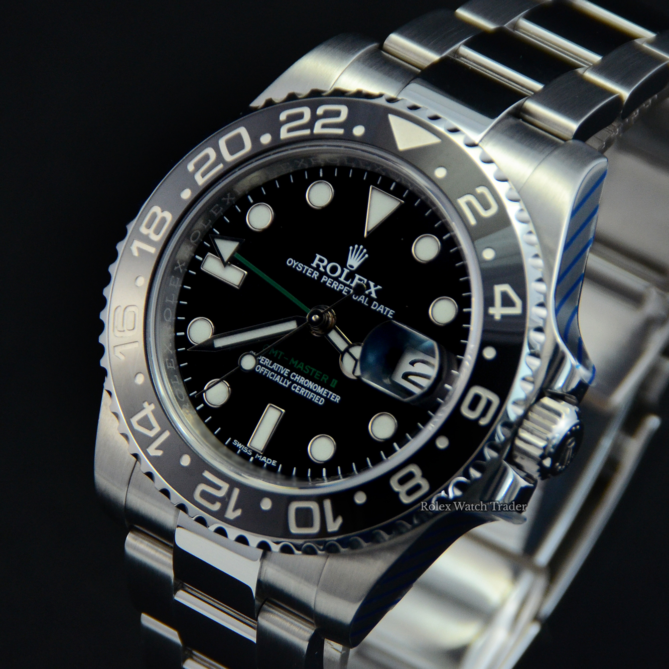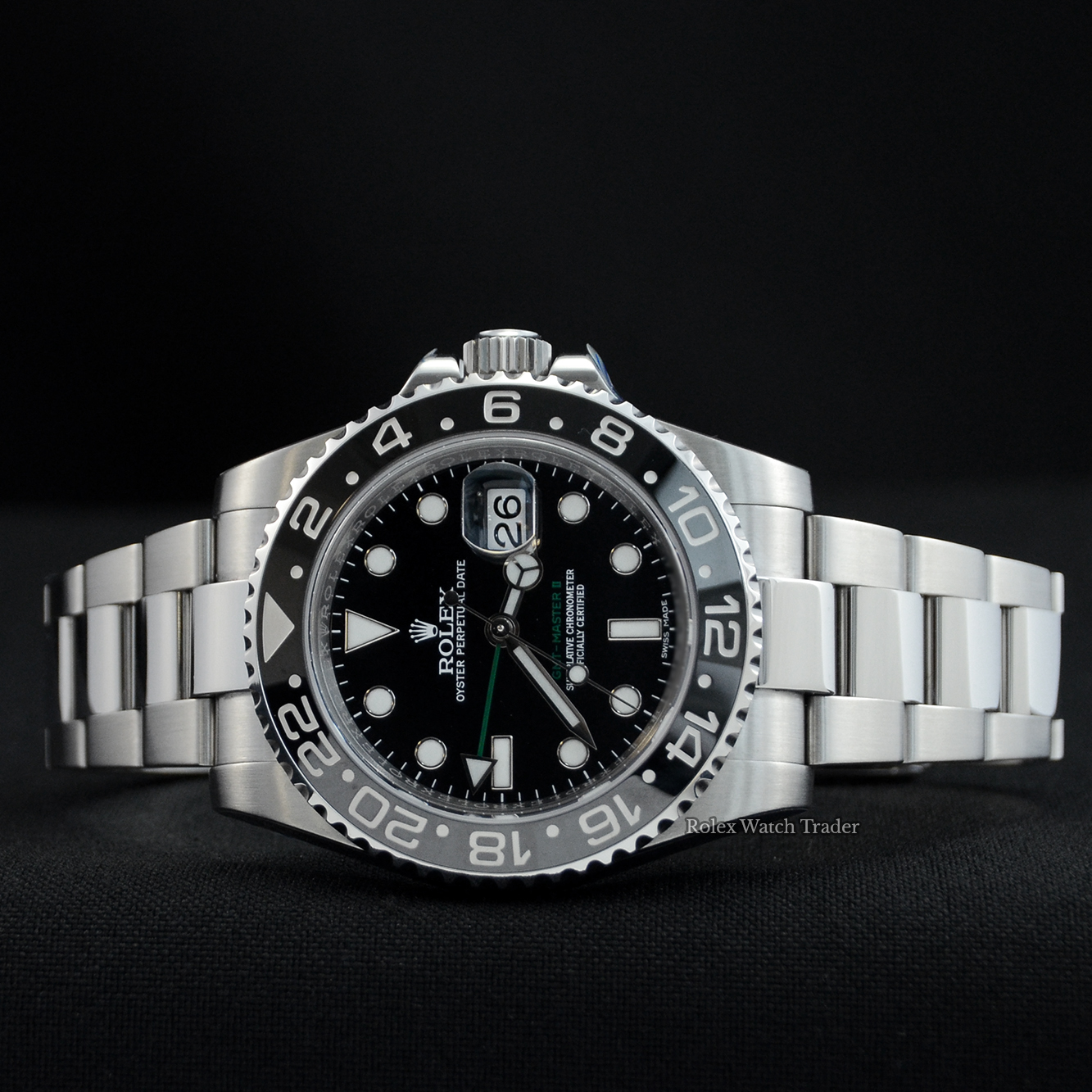 A pre-owned in excellent condition, chronometer-certified, automatic movement Rolex GMT-Master II model reference 116710LN. Featuring a 40mm stainless steel case, housing a black baton 'maxi' dial with luminous hands and hour markers, a characteristic green GMT hand, and a date aperture at 3 o'clock with an external cyclops. The dial is surrounded by a black ceramic 24 hour GMT bezel. All presented on a full retail length stainless steel Rolex Oyster bracelet with a secure Oysterlock folding clasp.
