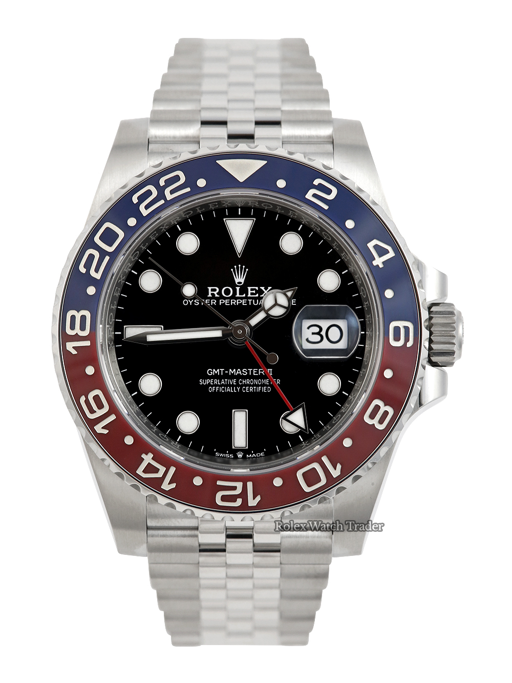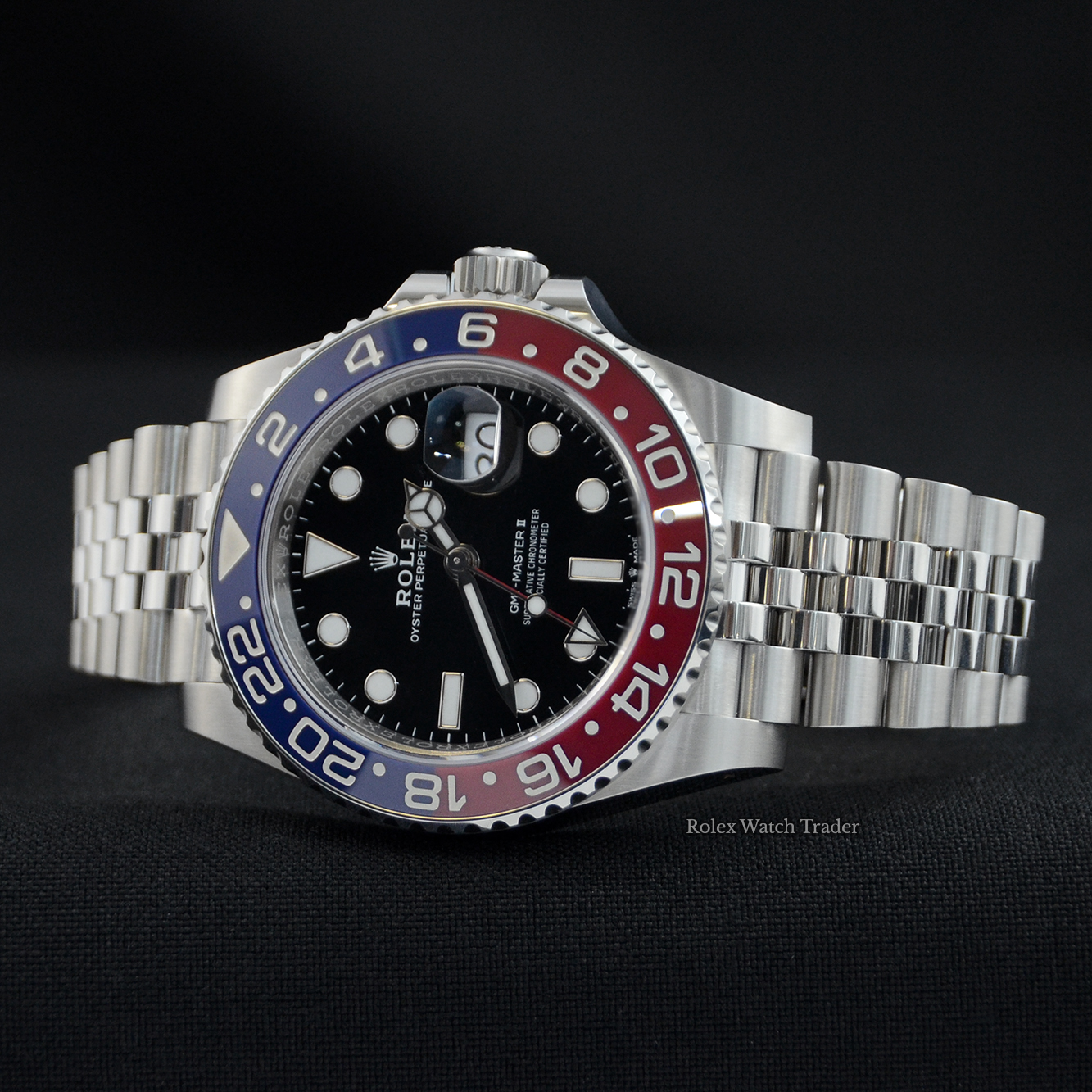 A unworn and unsized superlative chronometer-certified, automatic movement Rolex GMT-Master II model reference 126710BLRO. Featuring a 40mm stainless steel case, housing a black dial with luminous hour markers, a red GMT hand, and a date aperture at 3 o'clock. The dial is surrounded by a rotating stainless steel bezel with a ceramic red and blue GMT "Pepsi" bezel insert. Supplied on a full retail length Rolex Jubilee bracelet, completed by an Oysterlock folding clasp.