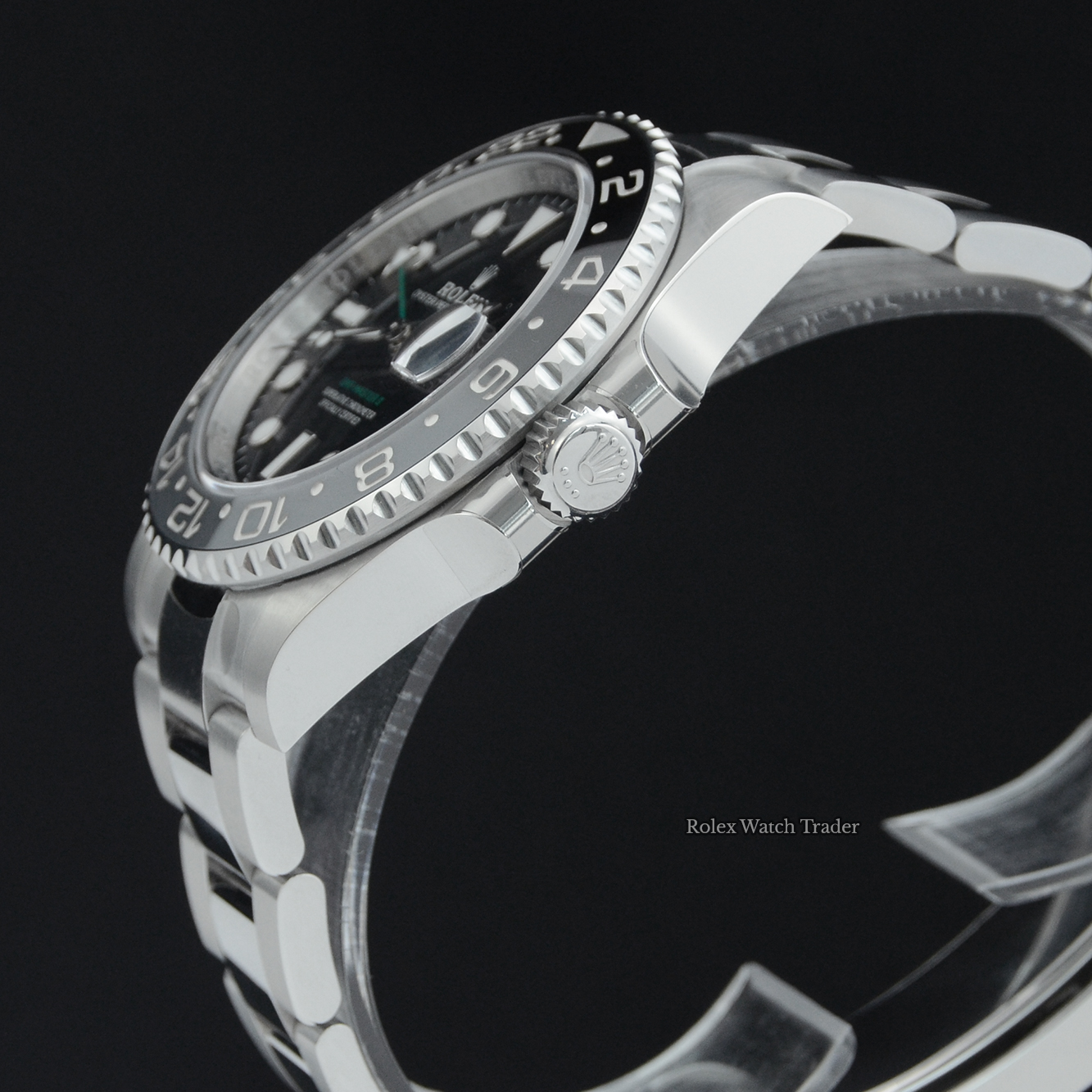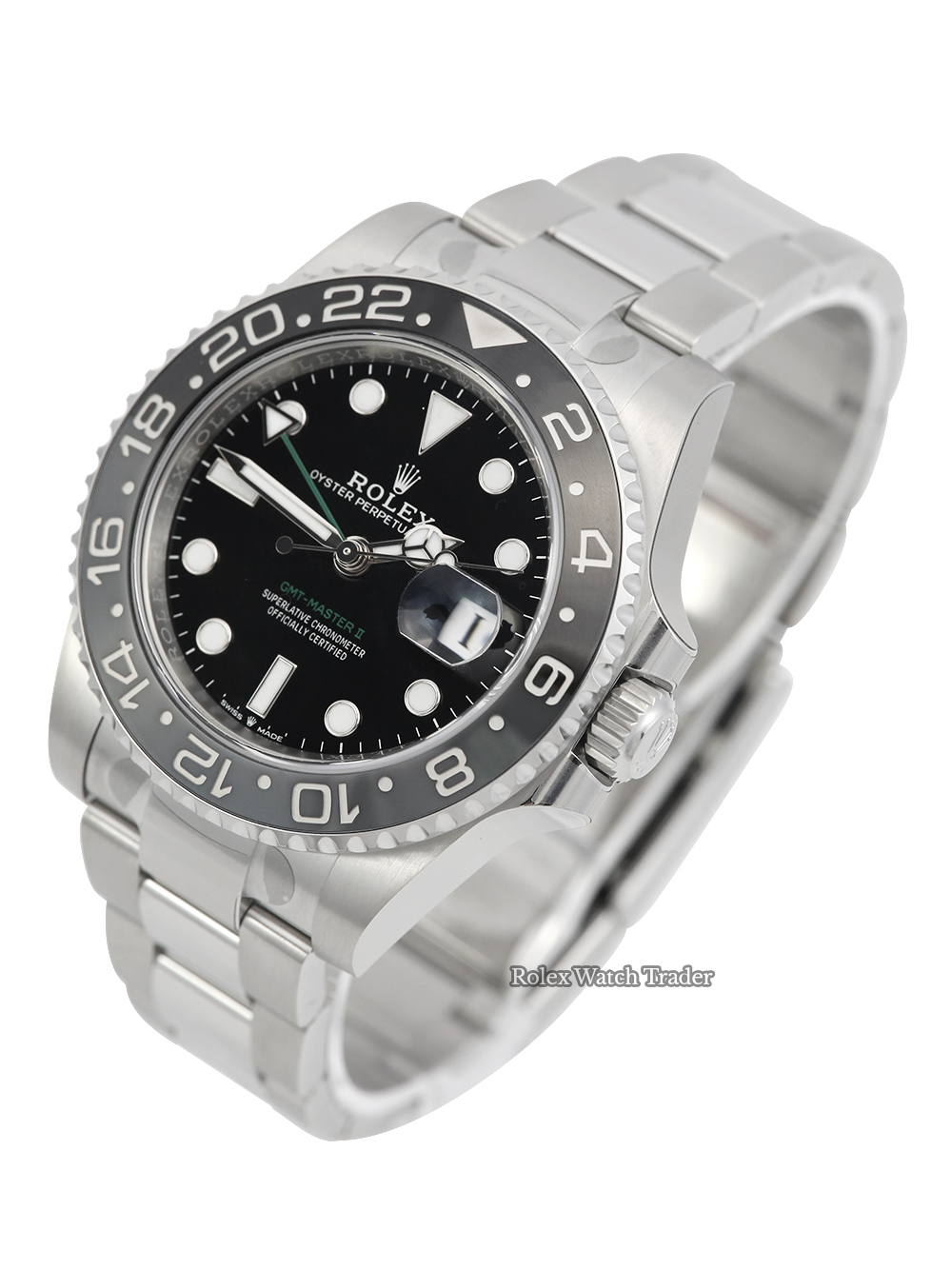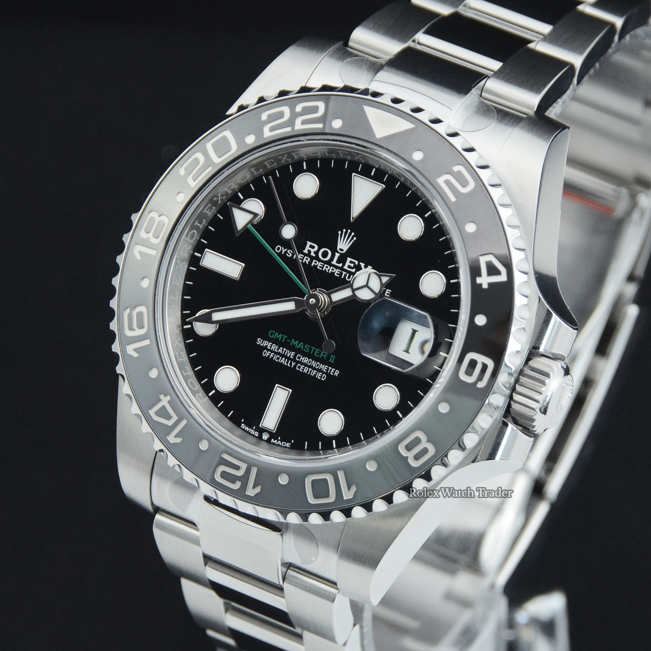 A brand new, unworn and unsized 40mm case size Oystersteel Superlative Chronometer, calibre 3285, automatic movement Rolex GMT-Master II 'Bruce Wayne' model reference 126710GRNR featuring a black baton dial housing a date aperture at 3 O'clock and a green GMT hand surrounded by an Oystersteel bi-directional bezel with a 24-hour grey and black ceramic insert. This particular watch comes on a full retail length Oystersteel Rolex Oyster bracelet