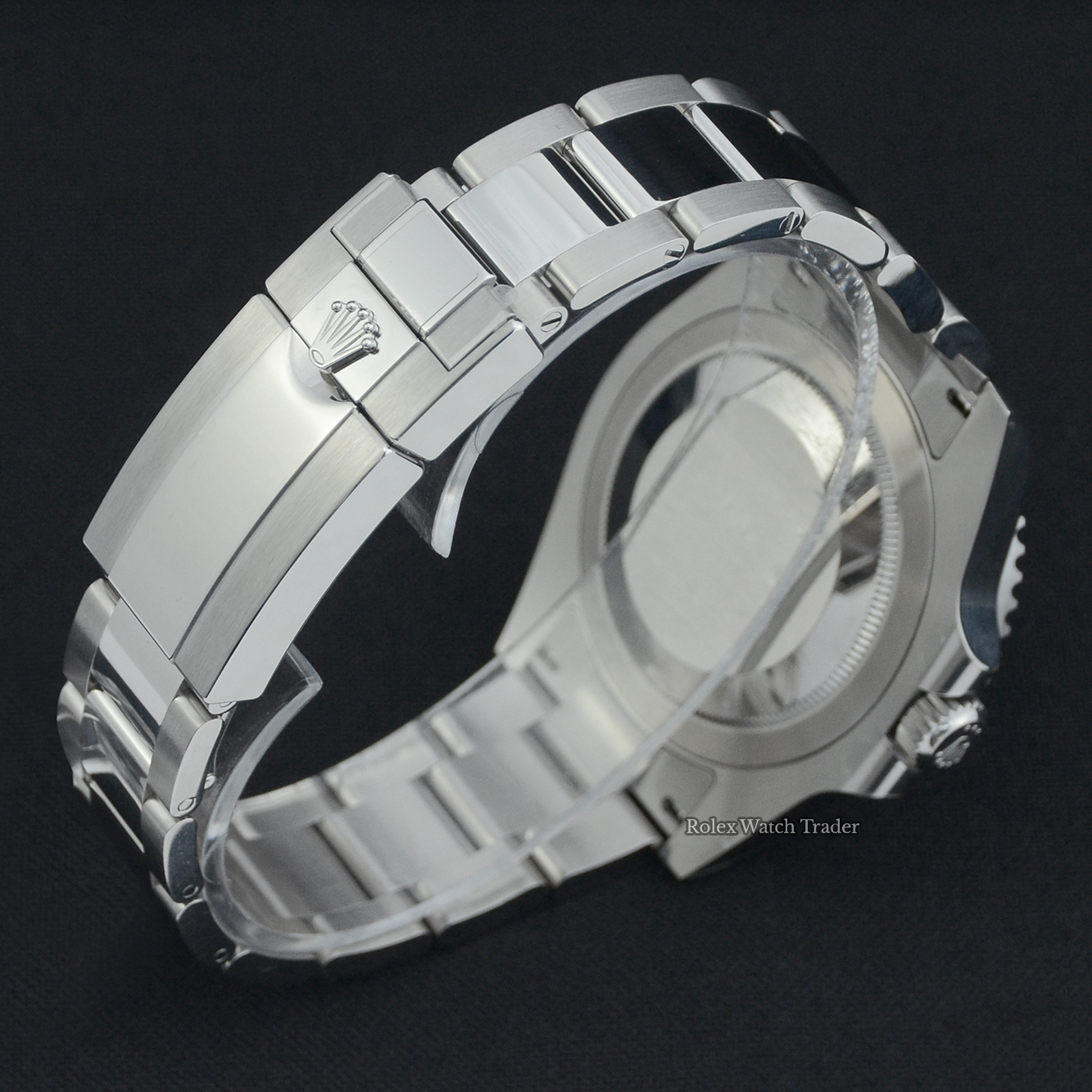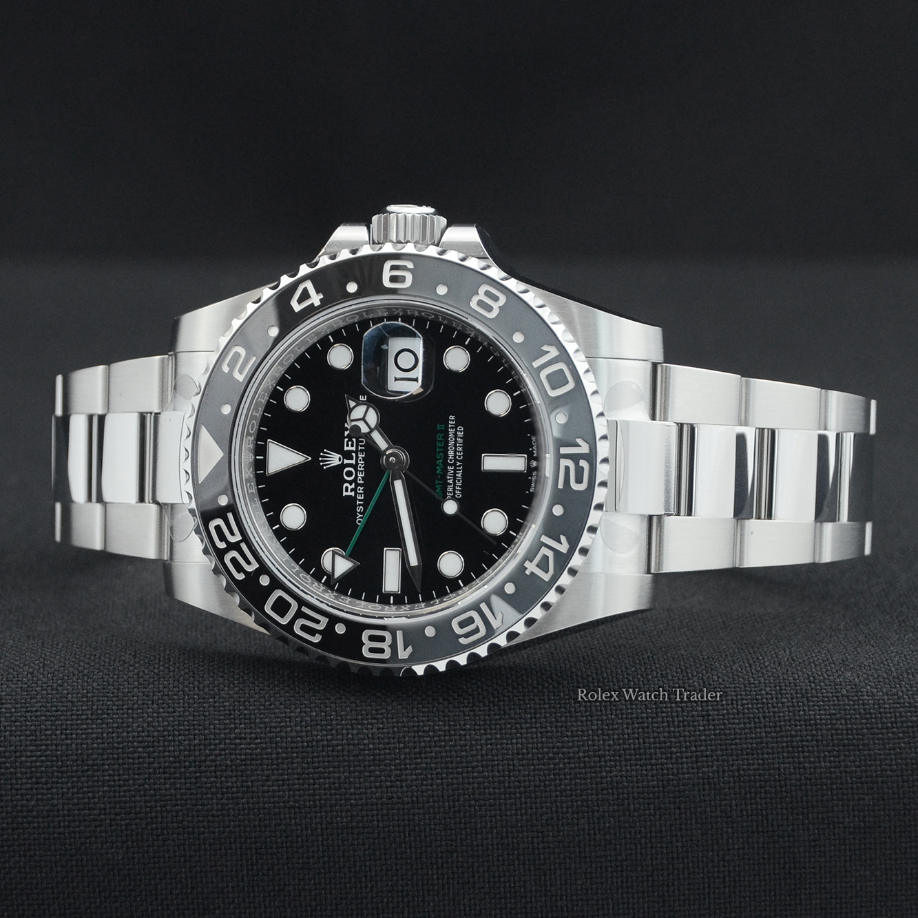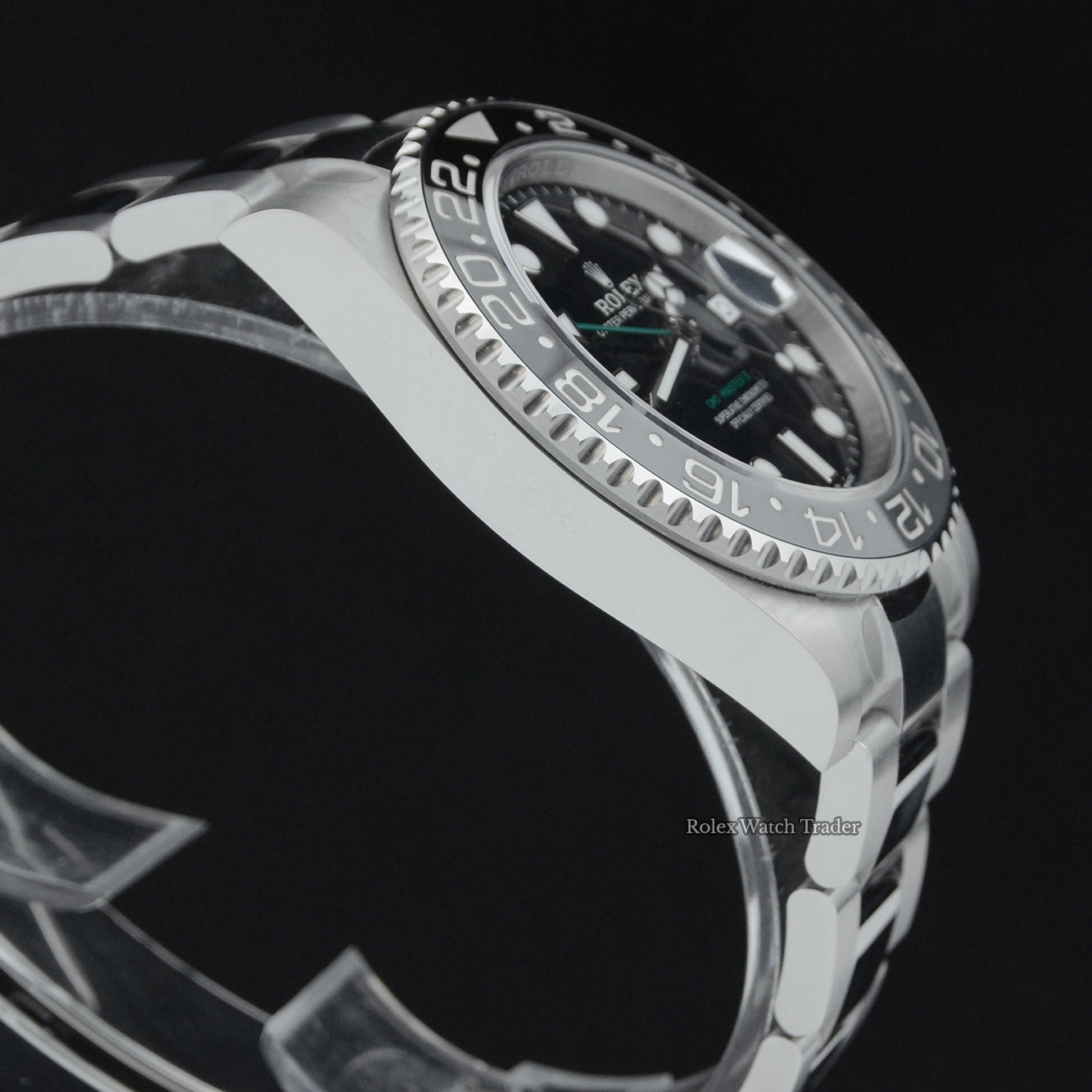 A brand new, unworn and unsized 40mm case size Oystersteel Superlative Chronometer, calibre 3285, automatic movement Rolex GMT-Master II 'Bruce Wayne' model reference 126710GRNR featuring a black baton dial housing a date aperture at 3 O'clock and a green GMT hand surrounded by an Oystersteel bi-directional bezel with a 24-hour grey and black ceramic insert. This particular watch comes on a full retail length Oystersteel Rolex Oyster bracelet