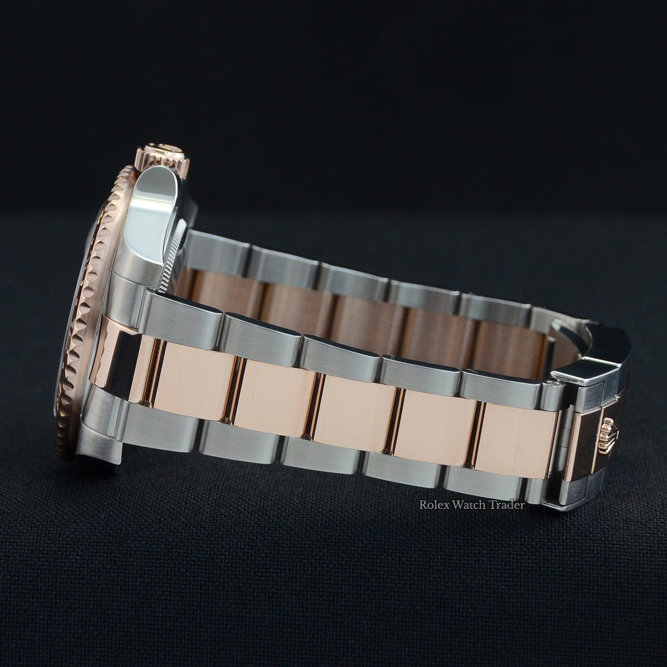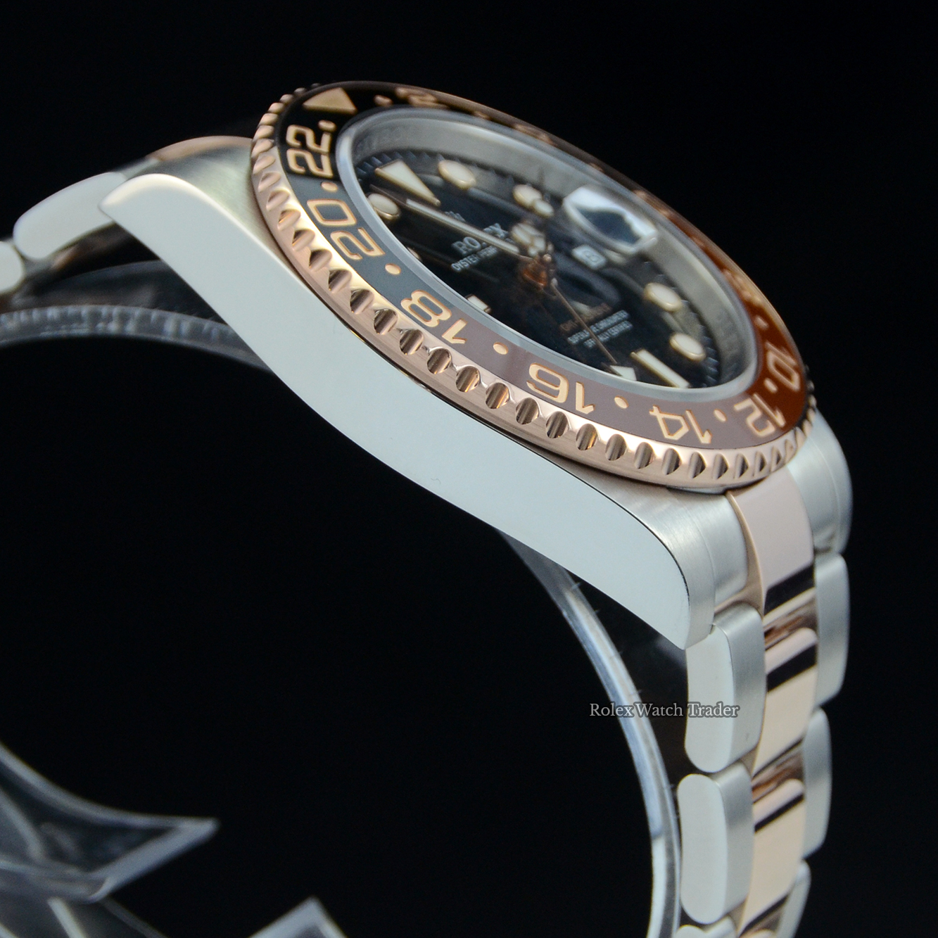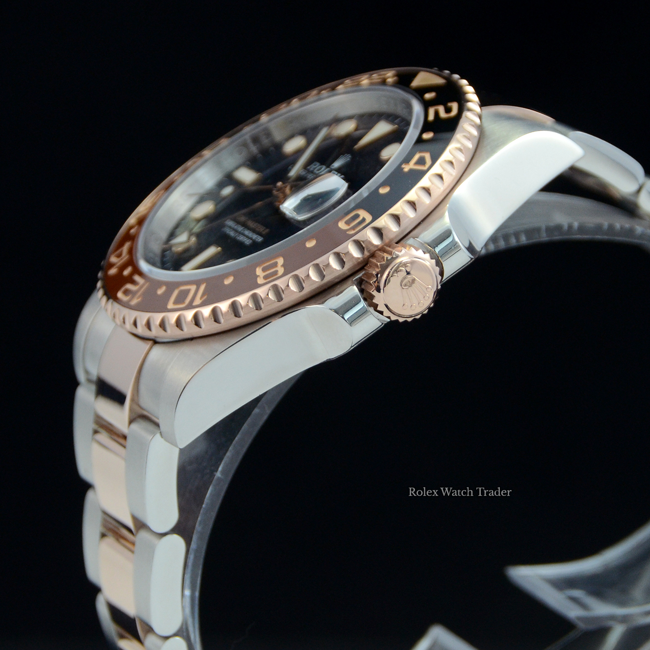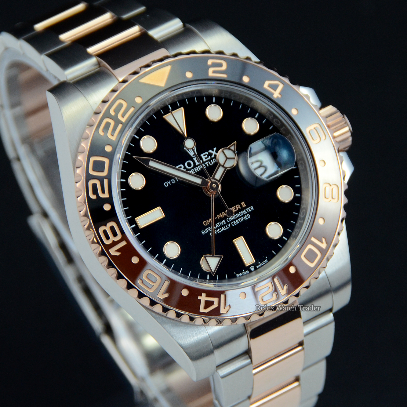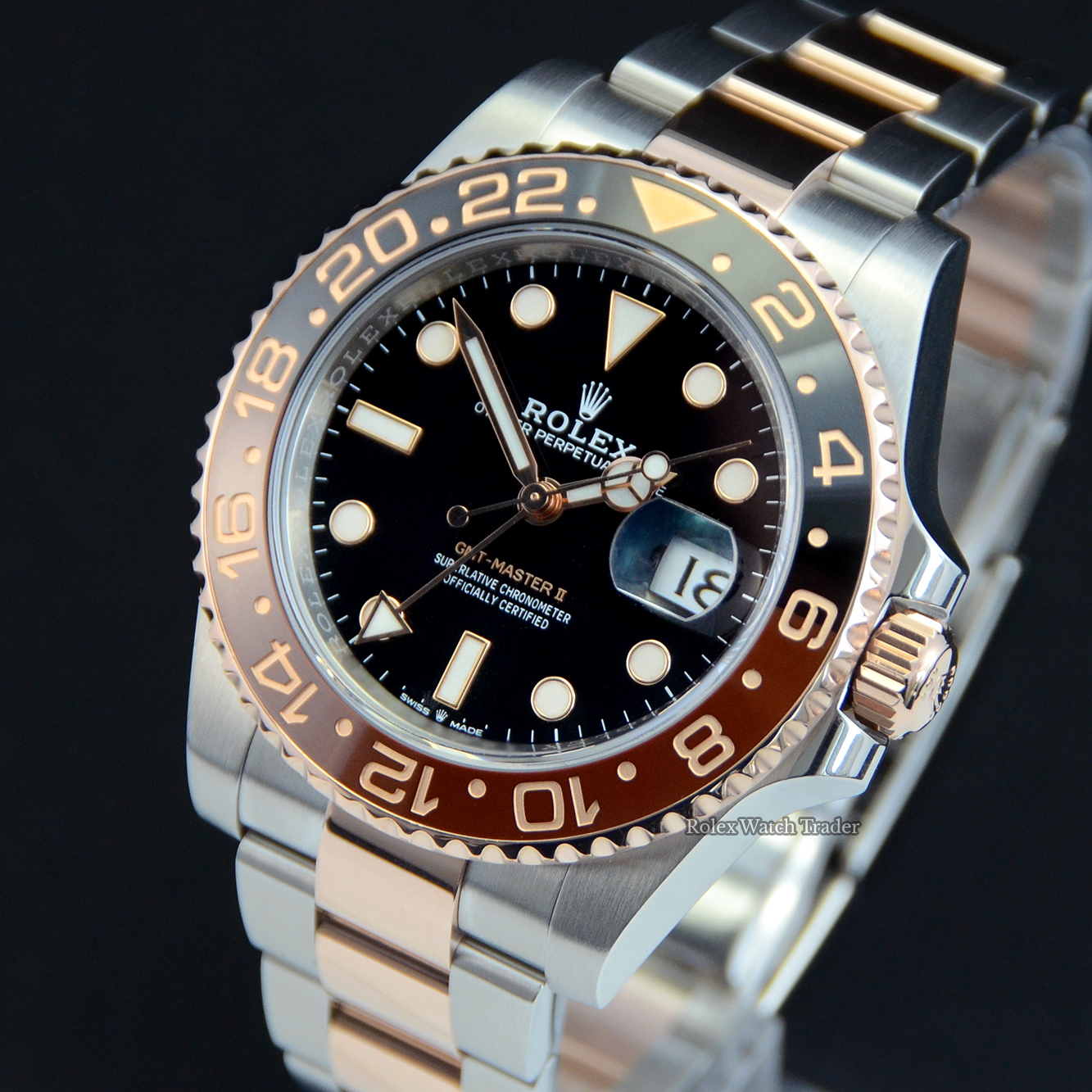 An excellent condition (could easily pass as brand new), pre-owned, chronometer rated automatic movement Rolex GMT-Master II, model reference 126711CHNR. This stunning watch features a 40mm bimetal stainless steel and rose gold, housing a black dial with luminous rose gold outlined indexes. The dial is surrounded by a rotating rose gold bezel with a black & brown "Root Beer" ceramic 24 hour GMT bezel insert. Presented on a stainless steel and ever-rose gold Rolex Oyster bracelet with satin-finished outer links and polished finish centre links, completed by a folding Oysterclasp.