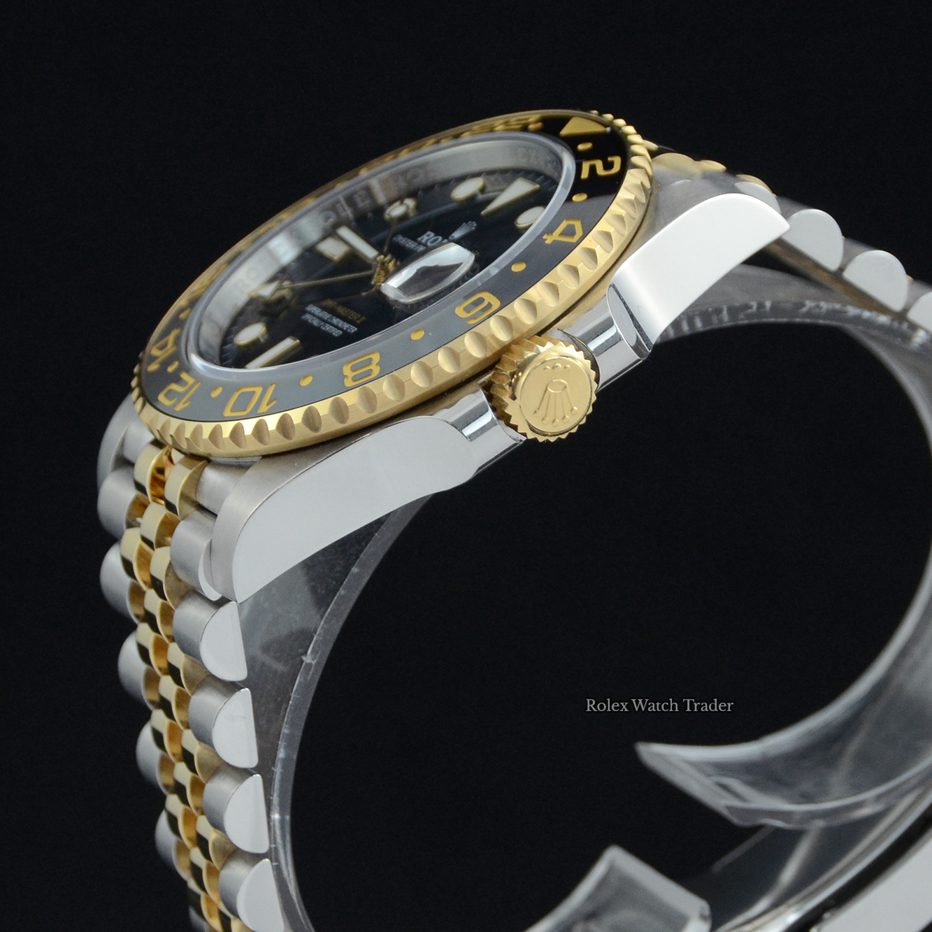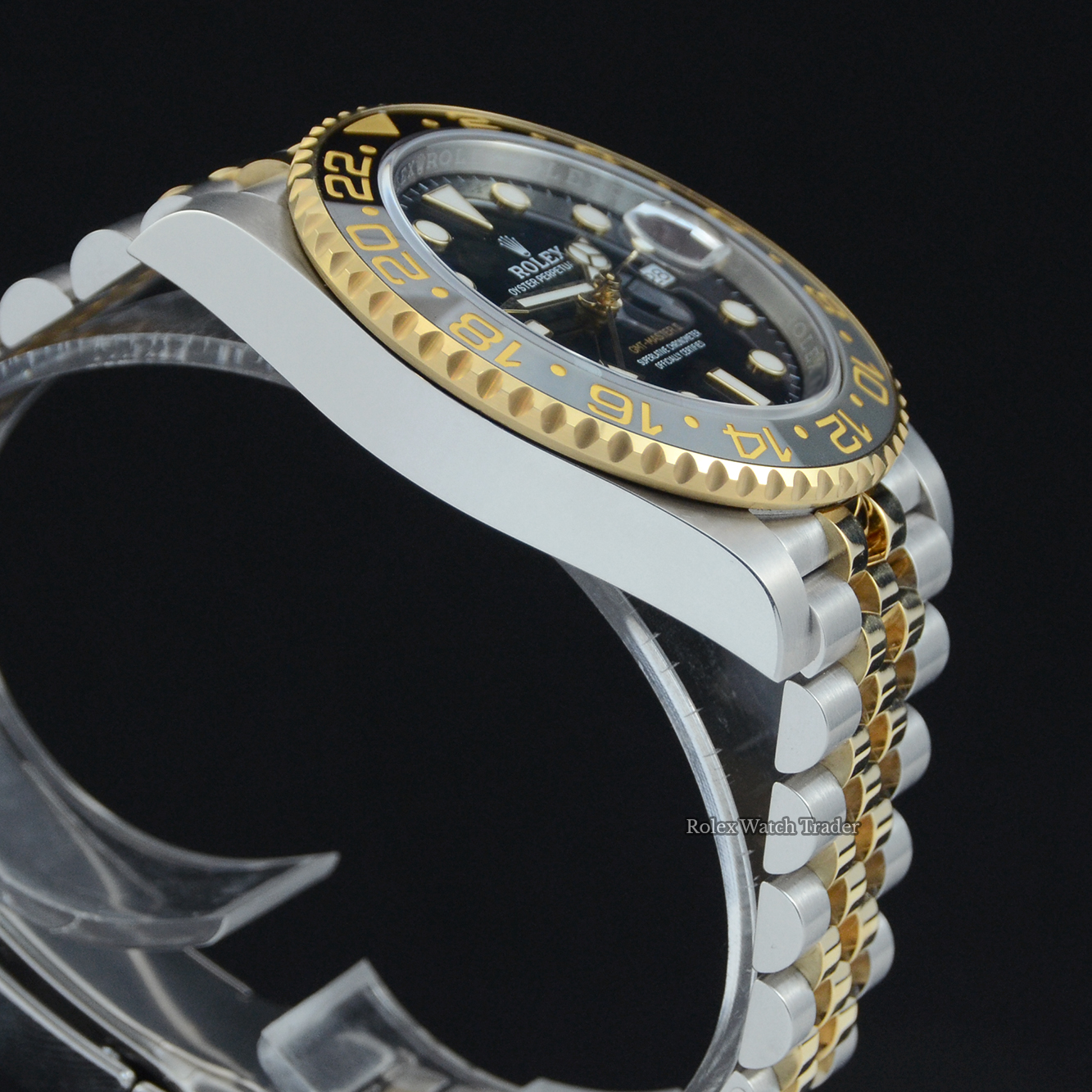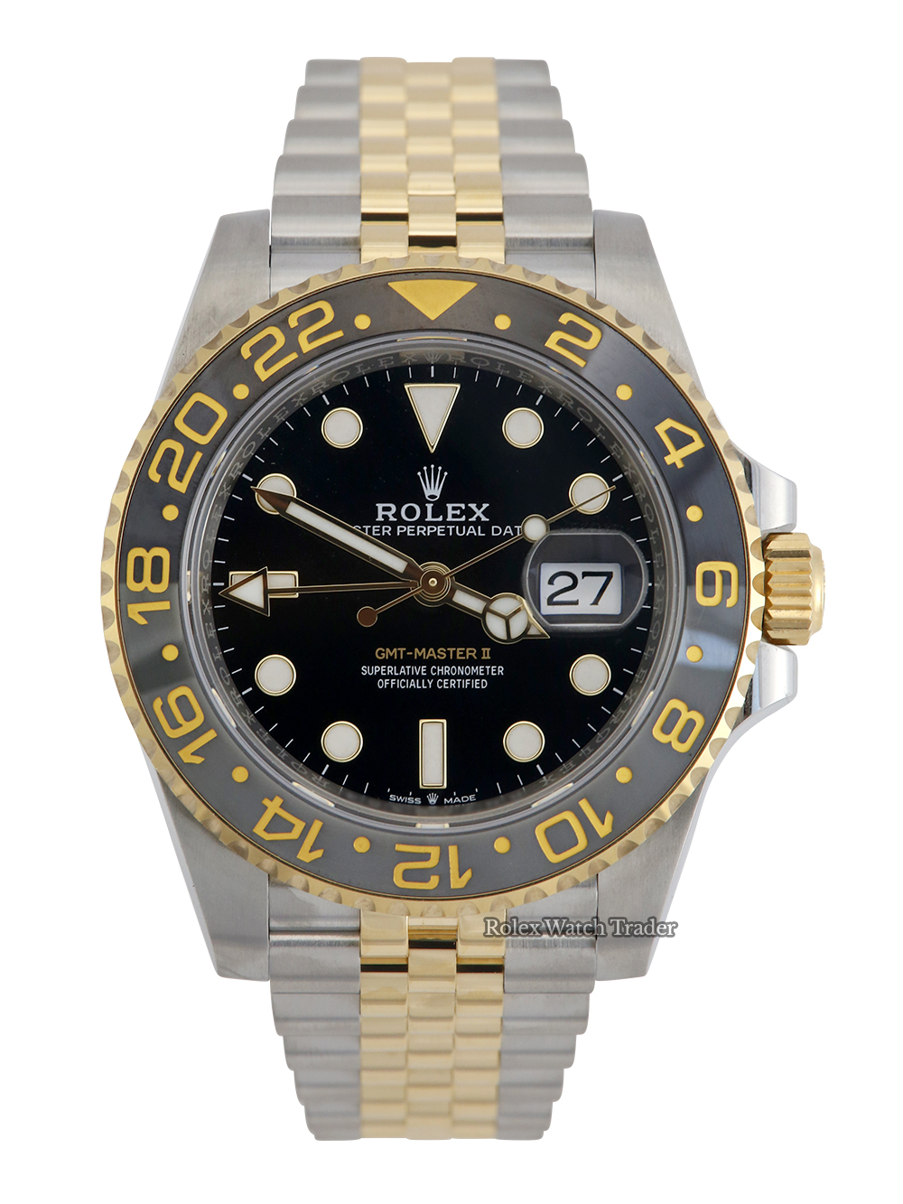 A pre-owned in pristine condition superlative chronometer-certified, automatic movement Rolex GMT-Master II model reference 126713GRNR. Featuring a 40mm stainless steel case, housing a black dial with luminous hour markers, a gold GMT hand, and a date aperture at 3 o'clock. The dial is surrounded by a rotating yellow gold bezel with a ceramic black and grey GMT bezel insert. Supplied on a full retail length stainless steel and yellow gold Rolex Jubilee bracelet completed by an Oysterlock folding clasp.