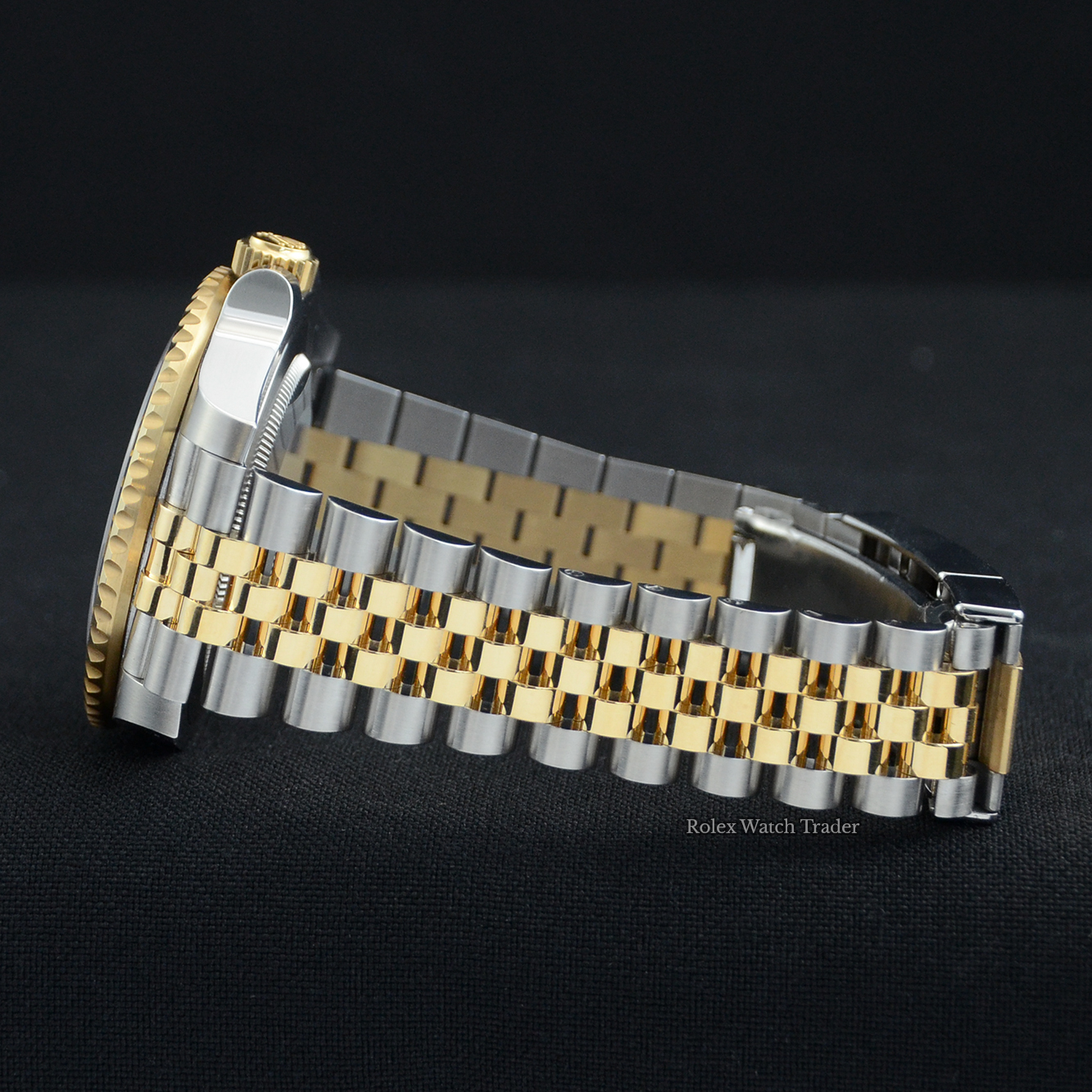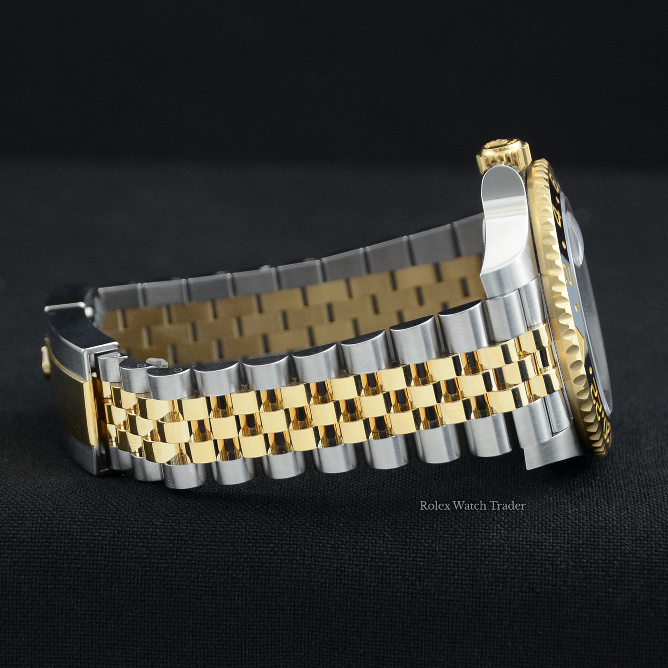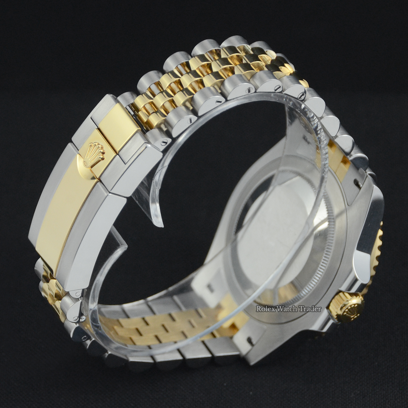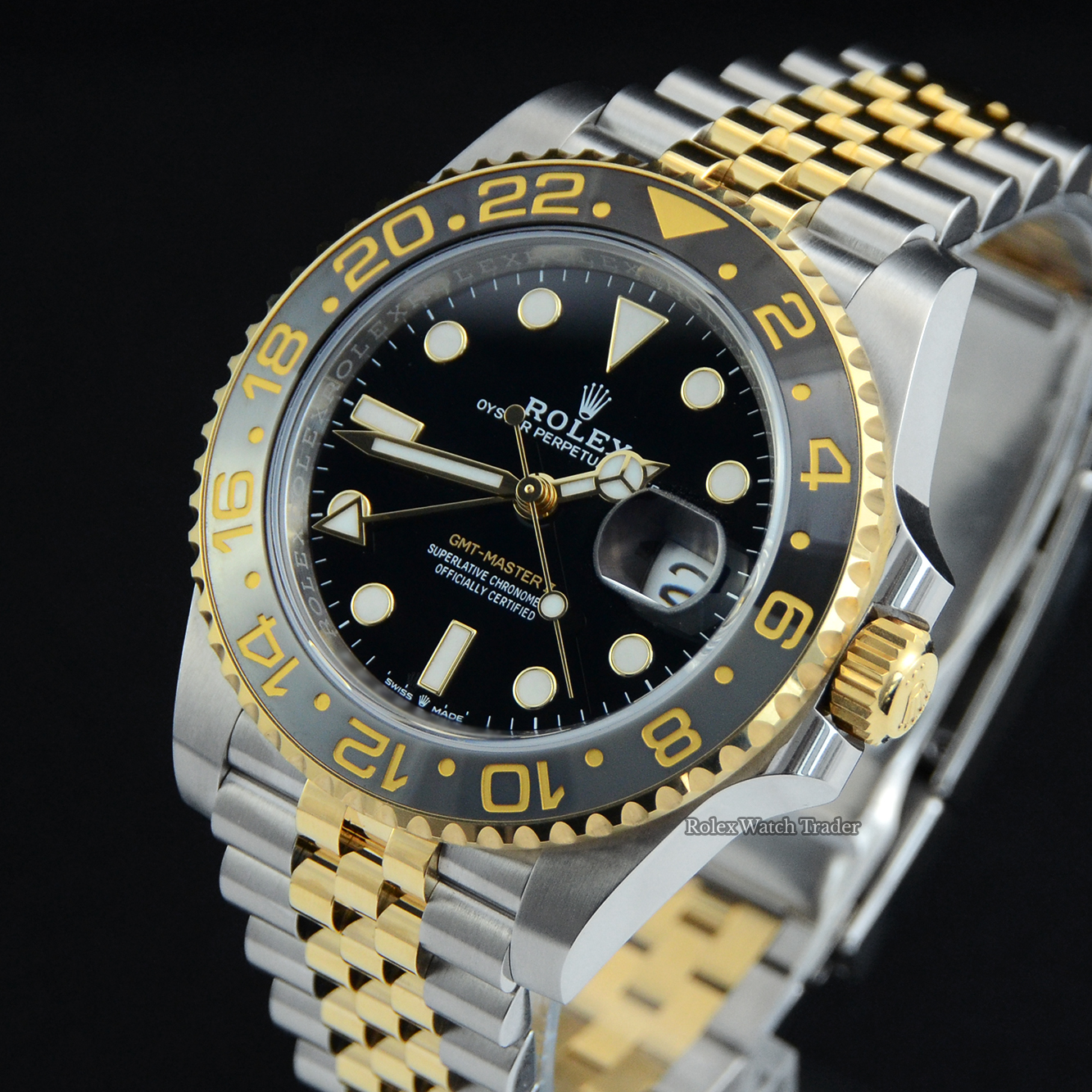 A pre-owned in pristine condition superlative chronometer-certified, automatic movement Rolex GMT-Master II model reference 126713GRNR. Featuring a 40mm stainless steel case, housing a black dial with luminous hour markers, a gold GMT hand, and a date aperture at 3 o'clock. The dial is surrounded by a rotating yellow gold bezel with a ceramic black and grey GMT bezel insert. Supplied on a full retail length stainless steel and yellow gold Rolex Jubilee bracelet completed by an Oysterlock folding clasp.