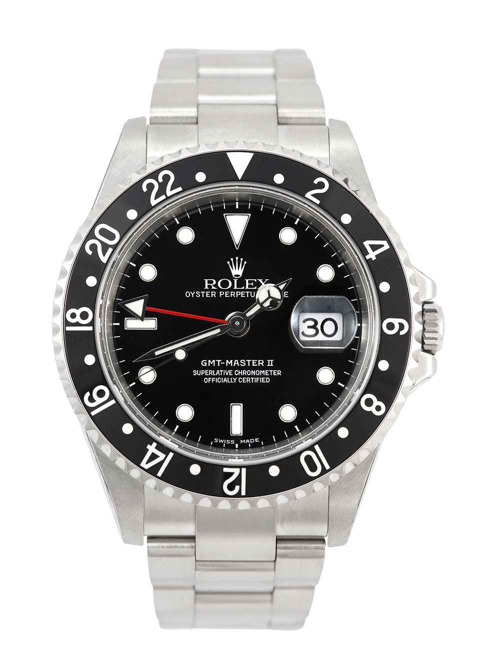 A pre-owned in excellent condition chronometer rated automatic stainless steel Rolex GMT Master II model reference 16710. Featuring a black dial surrounded by black insert 24hr GMT bezel, houses a date aperture at 3 o'clock and a red pointed GMT hand in order to run separate time readings. It is presented on a full retail length stainless steel Rolex oyster bracelet.