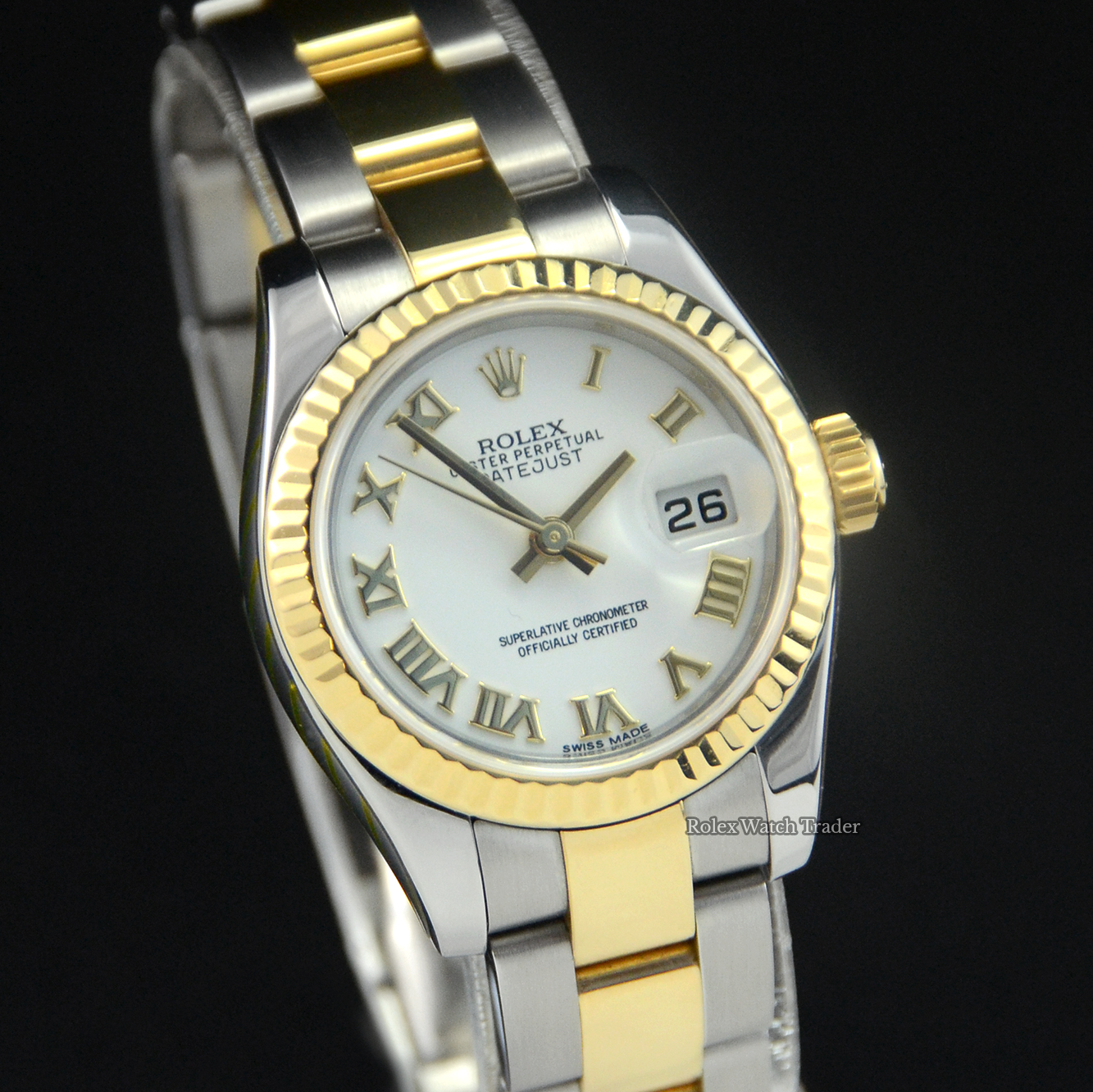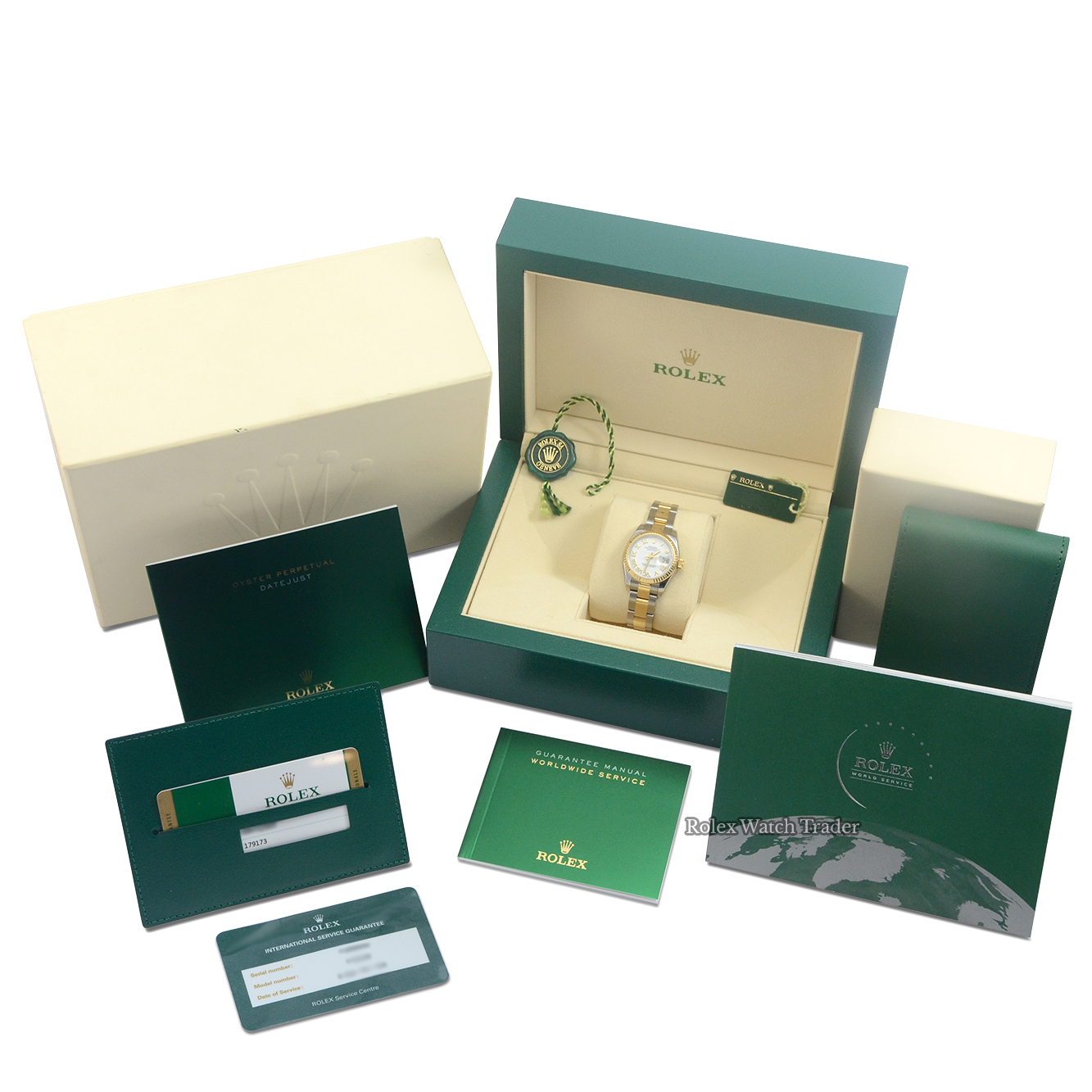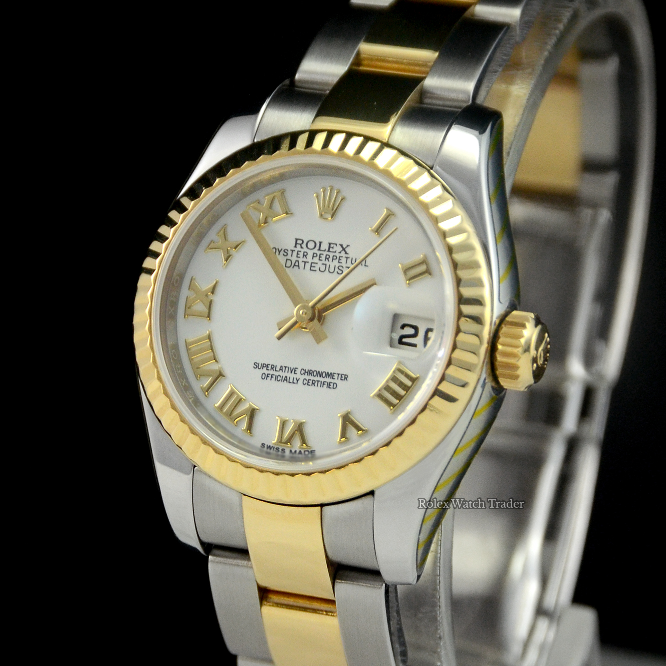 A previously owned Rolex with service stickers still intact & unworn since. As close to brand new condition as possible, pre-owned, superlative chronometer certified, automatic movement Rolex Lady Datejust with the model reference 179173. Featuring a 26mm bimetal stainless steel & yellow gold case, housing a white dial with a date aperture at 3 o'clock. The dial is surrounded by a yellow gold fluted bezel. All presented on a stainless steel and yellow gold Rolex oyster bracelet.