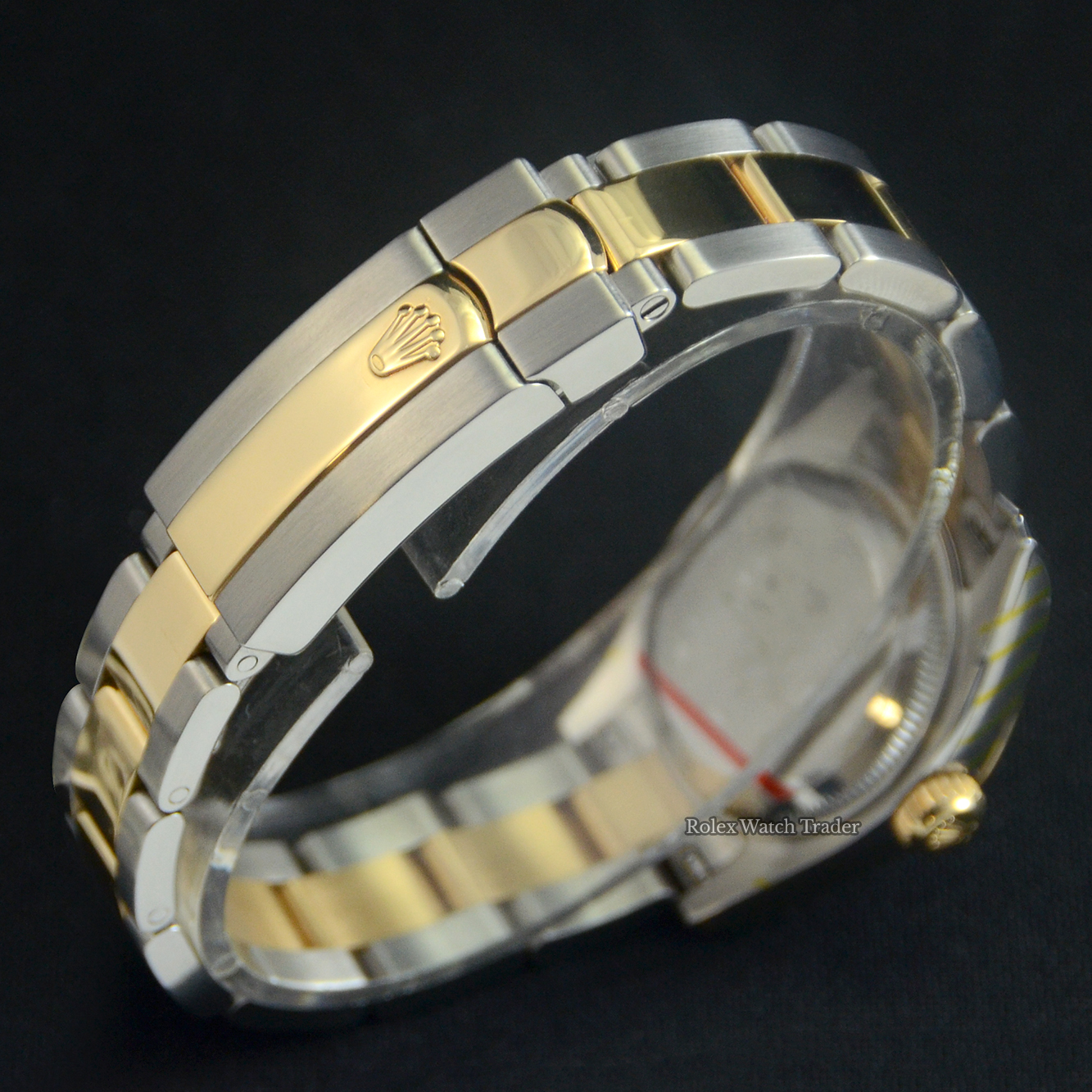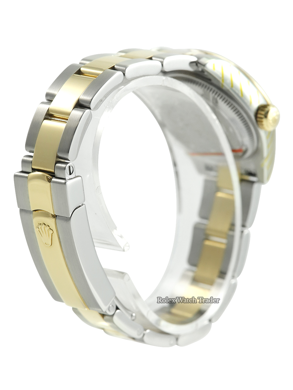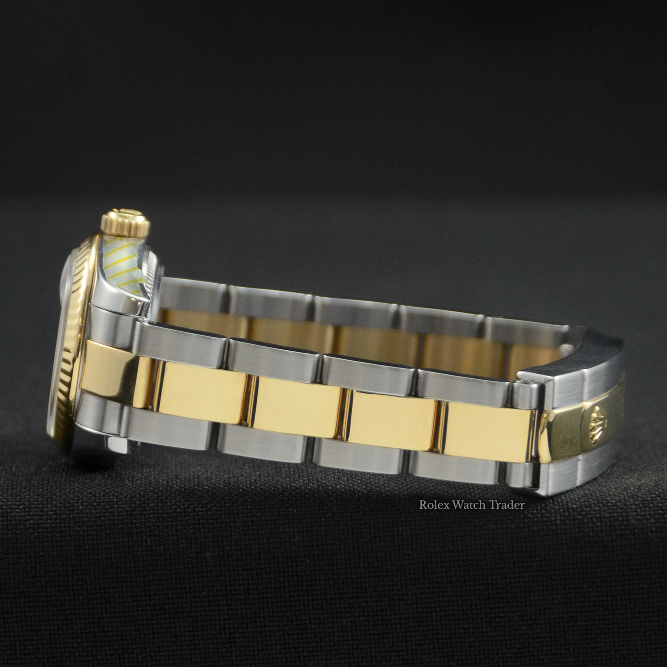 A previously owned Rolex with service stickers still intact & unworn since. As close to brand new condition as possible, pre-owned, superlative chronometer certified, automatic movement Rolex Lady Datejust with the model reference 179173. Featuring a 26mm bimetal stainless steel & yellow gold case, housing a white dial with a date aperture at 3 o'clock. The dial is surrounded by a yellow gold fluted bezel. All presented on a stainless steel and yellow gold Rolex oyster bracelet.