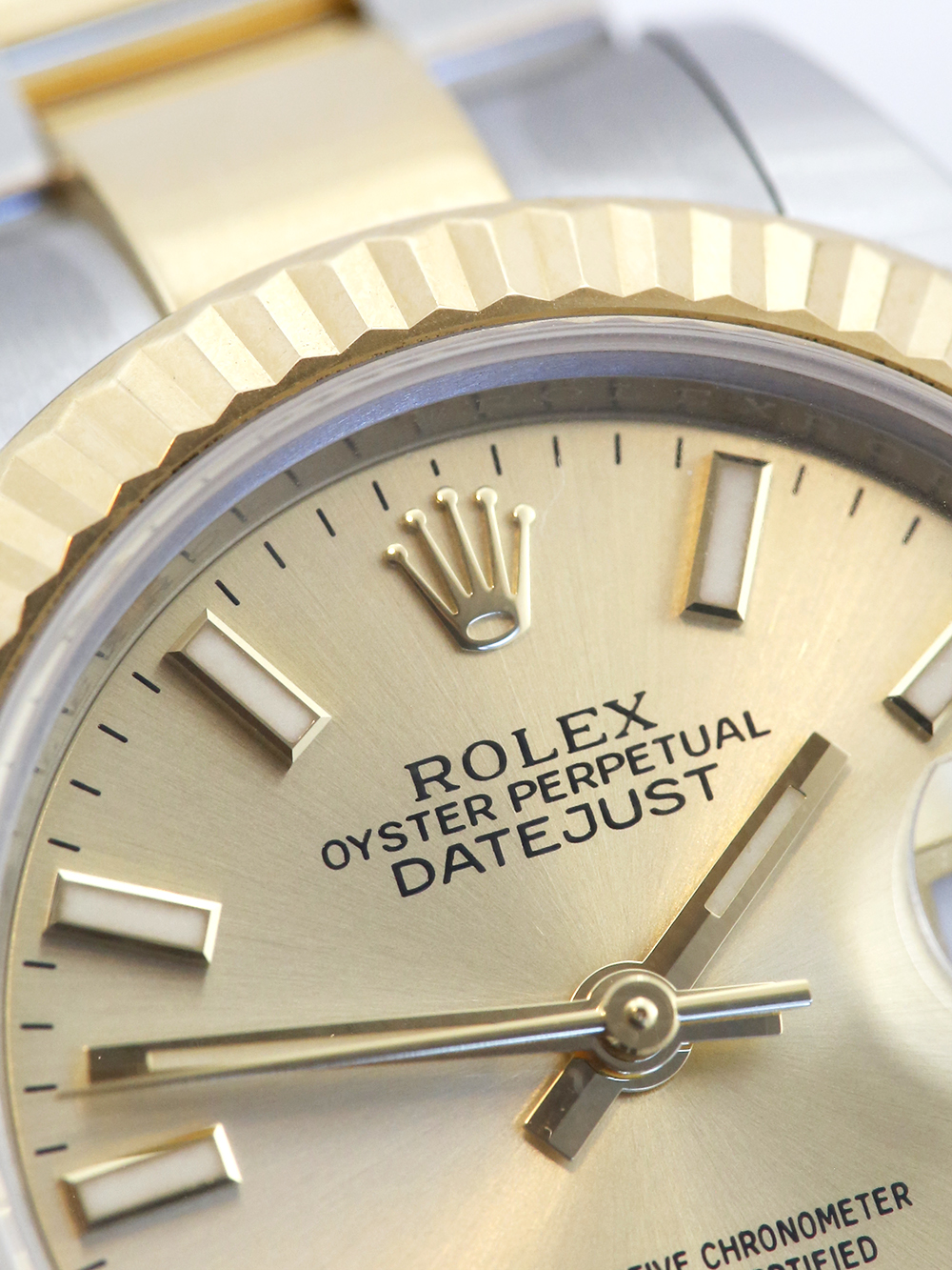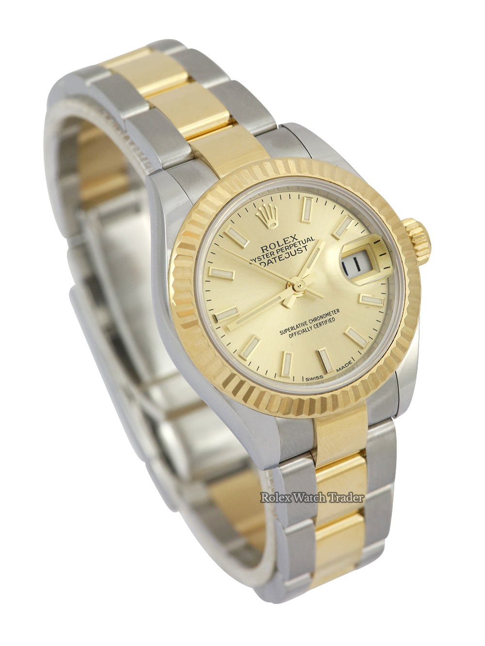 A one previous owner pre-owned in pristine condition as close to brand new as possible a stainless steel and yellow gold chronometer certified automatic movement 28mm case size Rolex Lady Datejust model reference 279173 featuring a champagne Roman numeral dial housing a date aperture at 3 O'clock surrounded by a yellow gold fluted bezel on a stainless steel and yellow gold Rolex Oyster bracelet.