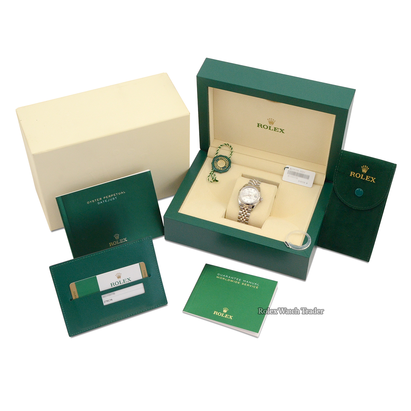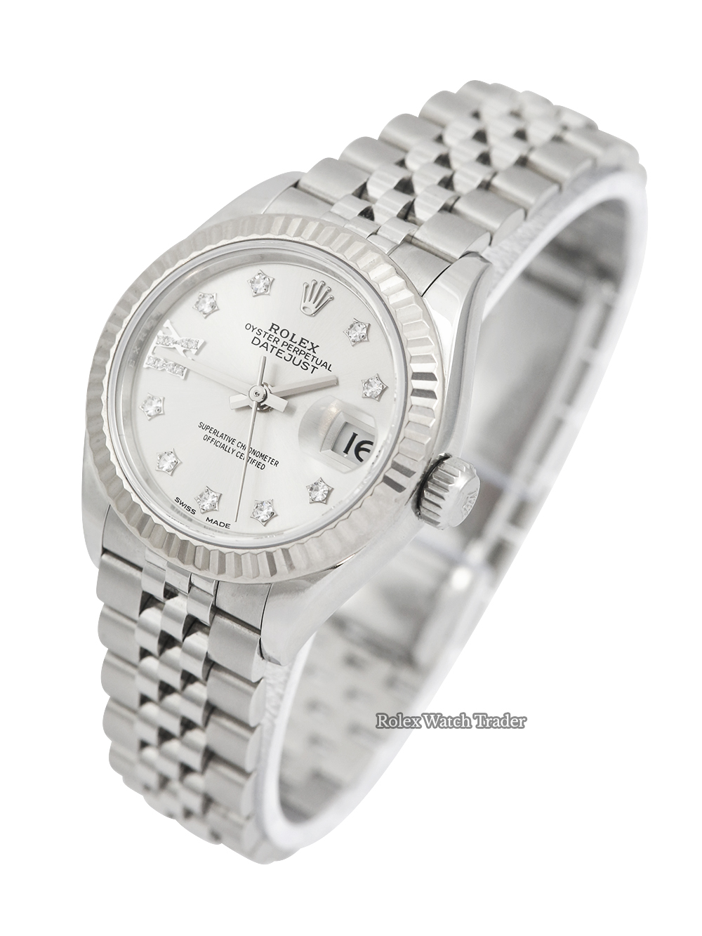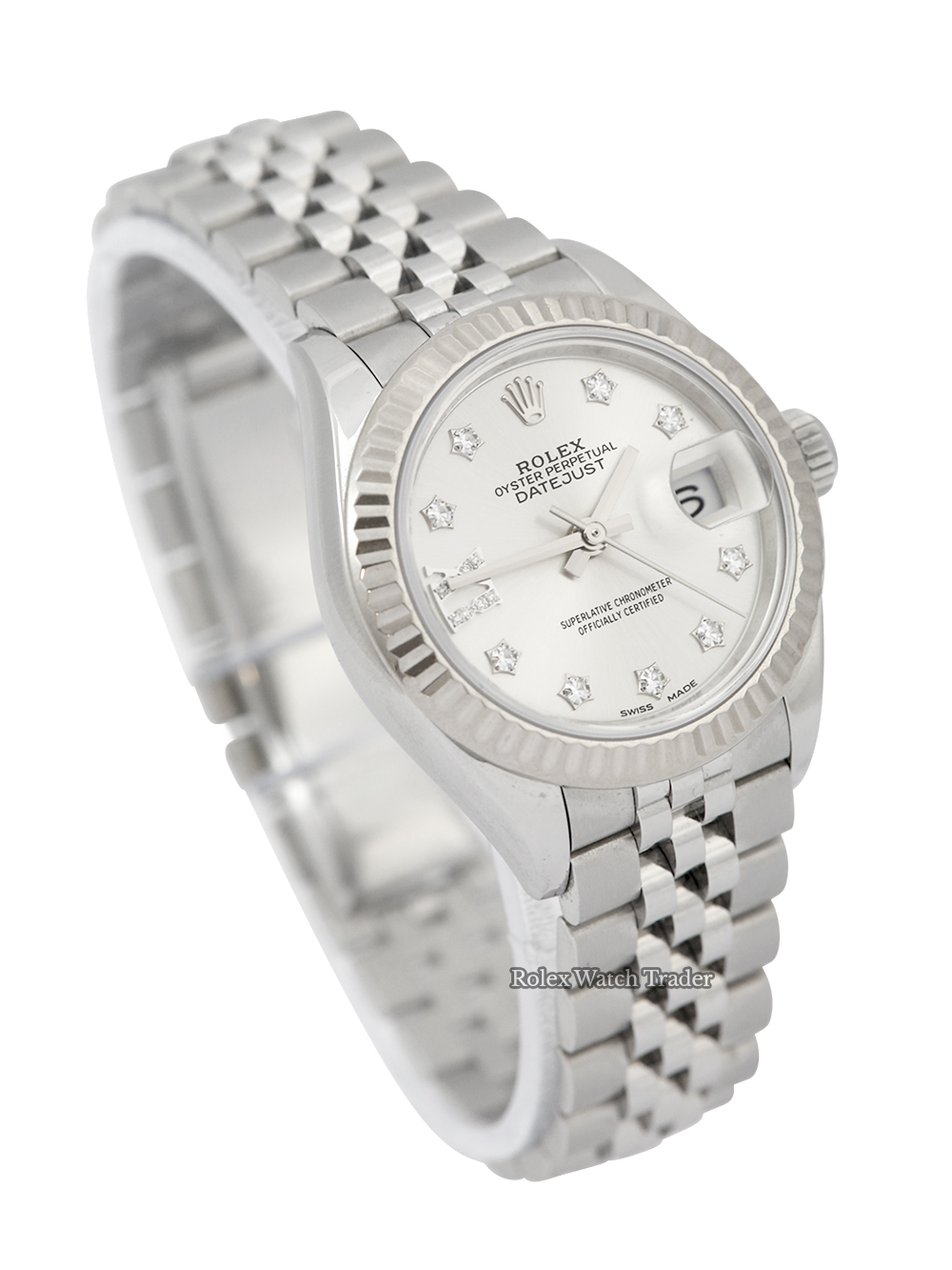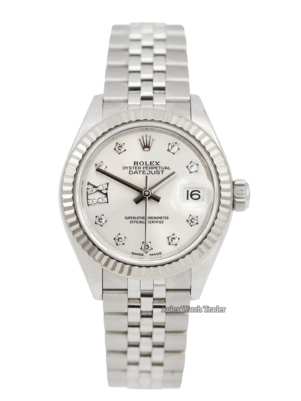 A previously owned, serviced by Rolex and unworn since (rear case service sticker still intact) a stainless steel 28mm case size chronometer certified automatic movement Rolex Datejust Lady model reference 279174 featuring a silver diamond dot dial housing a date aperture at 3 O'clock surrounded by a white gold fluted bezel on a full retail length stainless steel Rolex Jubliee bracelet.