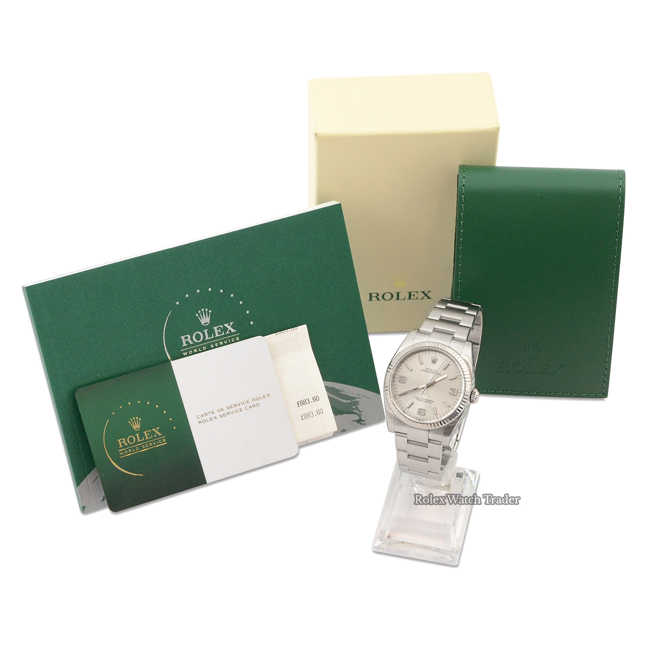This timepiece was sent away by us to the UK Rolex service centre where it underwent a full service to its movement as well as a meticulous refurbishment of the case and bracelet, in addition a new crown, new crystal glass, a replacement case back and two additional extension links were fitted. The work came to a total of £883.60. The service stickers remains in place and the watch remains unworn since.