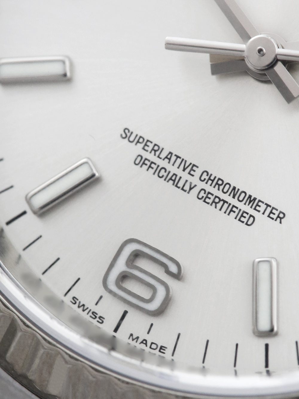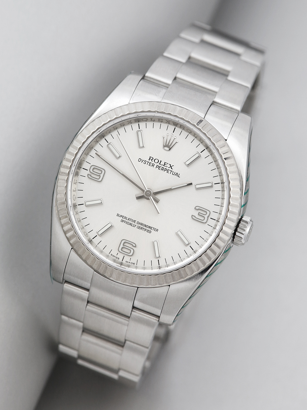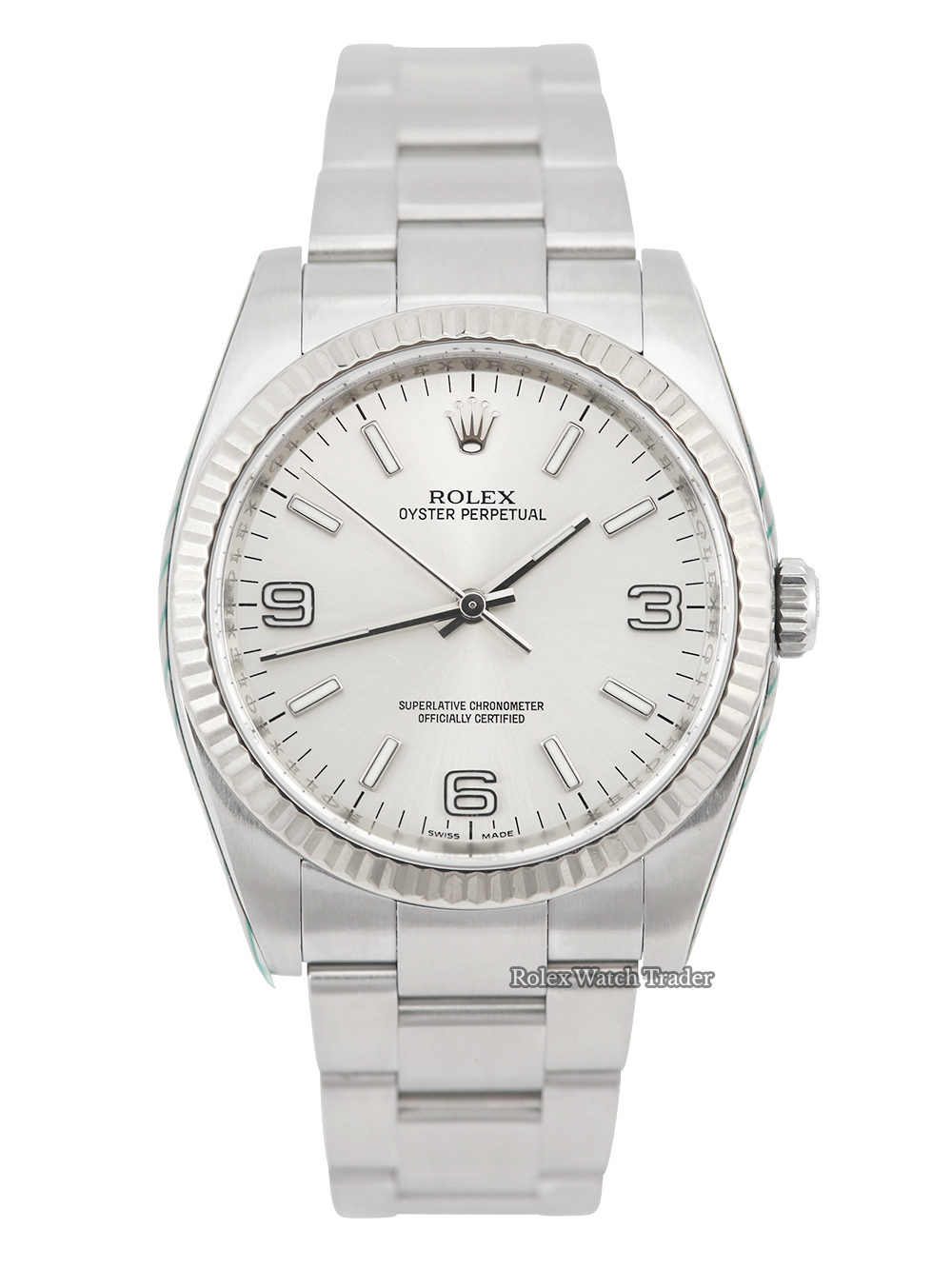 As previously mentioned a serviced by Rolex therefore presented in unquestionable condition a pre-owned stainless steel 36mm case size chronometer rated automatic movement Rolex Oyster Perpetual model reference 116034 featuring a silver baton dial with Arabic numerals per quarter surrounded by a white gold fluted bezel on a full retail length stainless steel Rolex Oyster bracelet.
