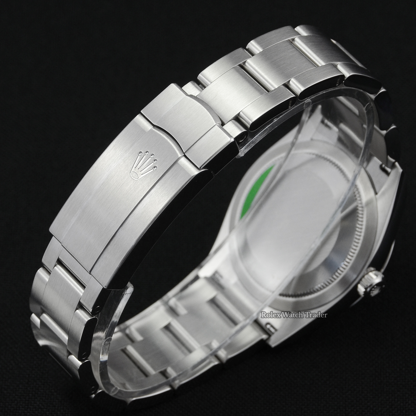 This particular watch is supplied as shown in the detailed images with the outer box sleeve, both inner and outer Rolex boxes, two swing tags, two manuals, Rolex warranty cardholder, and Rolex warranty card. The card is dated early 2021.