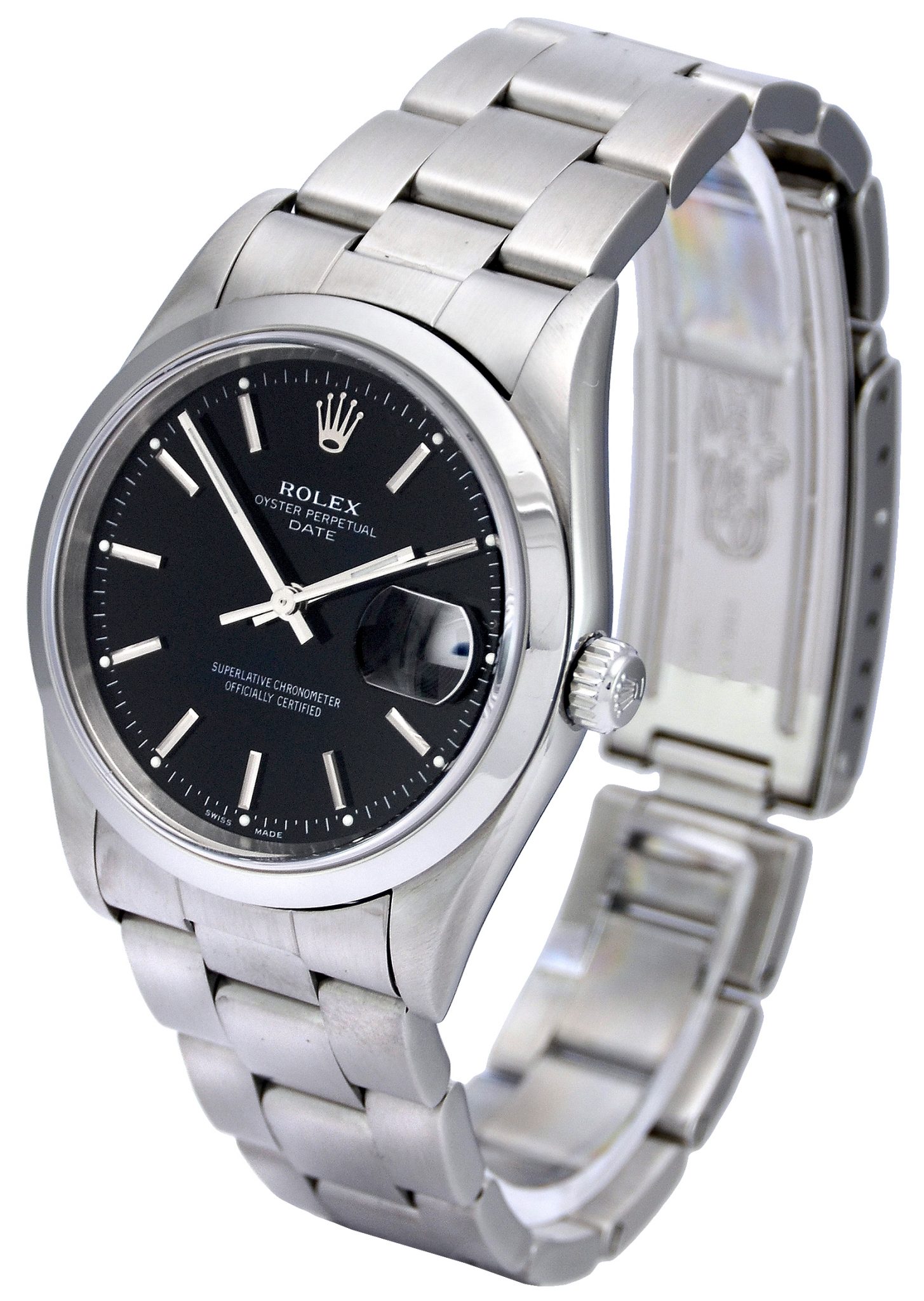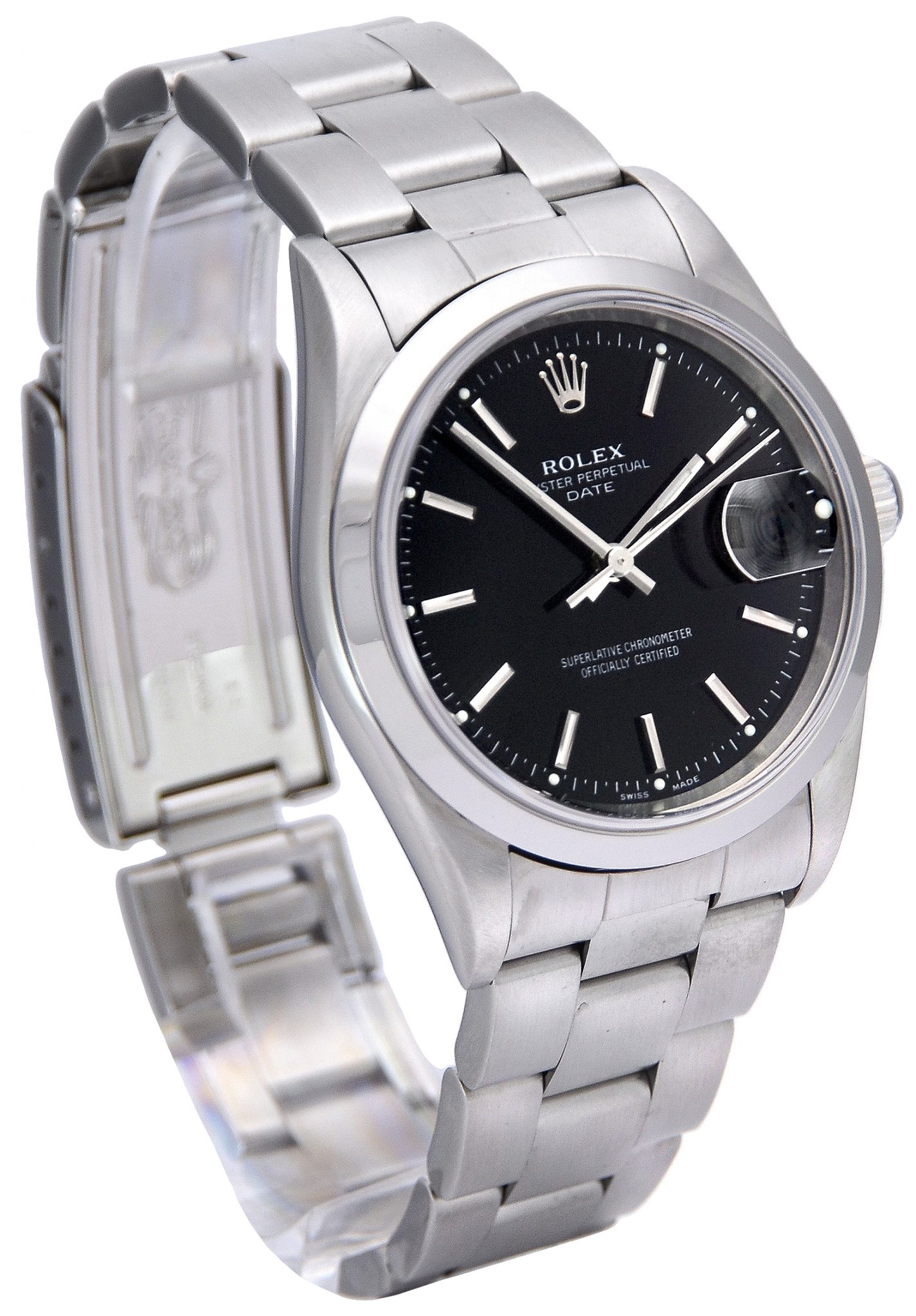 A very good condition pre-owned 'A' serial watch, which makes it circa 1999 model. This is a 34mm case size stainless steel superlative chronometer automatic movement Rolex Oyster Perpetual Date, model reference 15200. Black baton dial housing a date aperture at 3 o'clock, surrounded by a polished finish stainless steel domed bezel on a full retail length stainless steel Rolex oyster bracelet. This watch comes with a Rolex box only.
