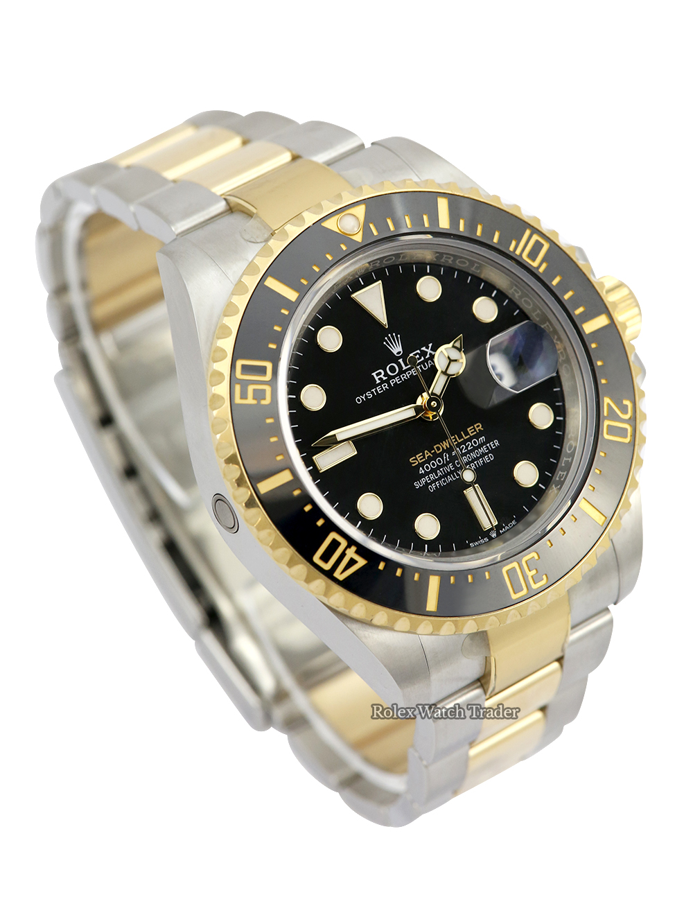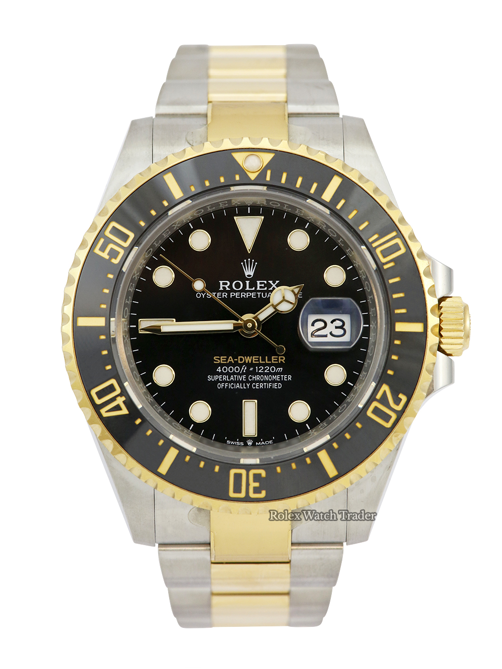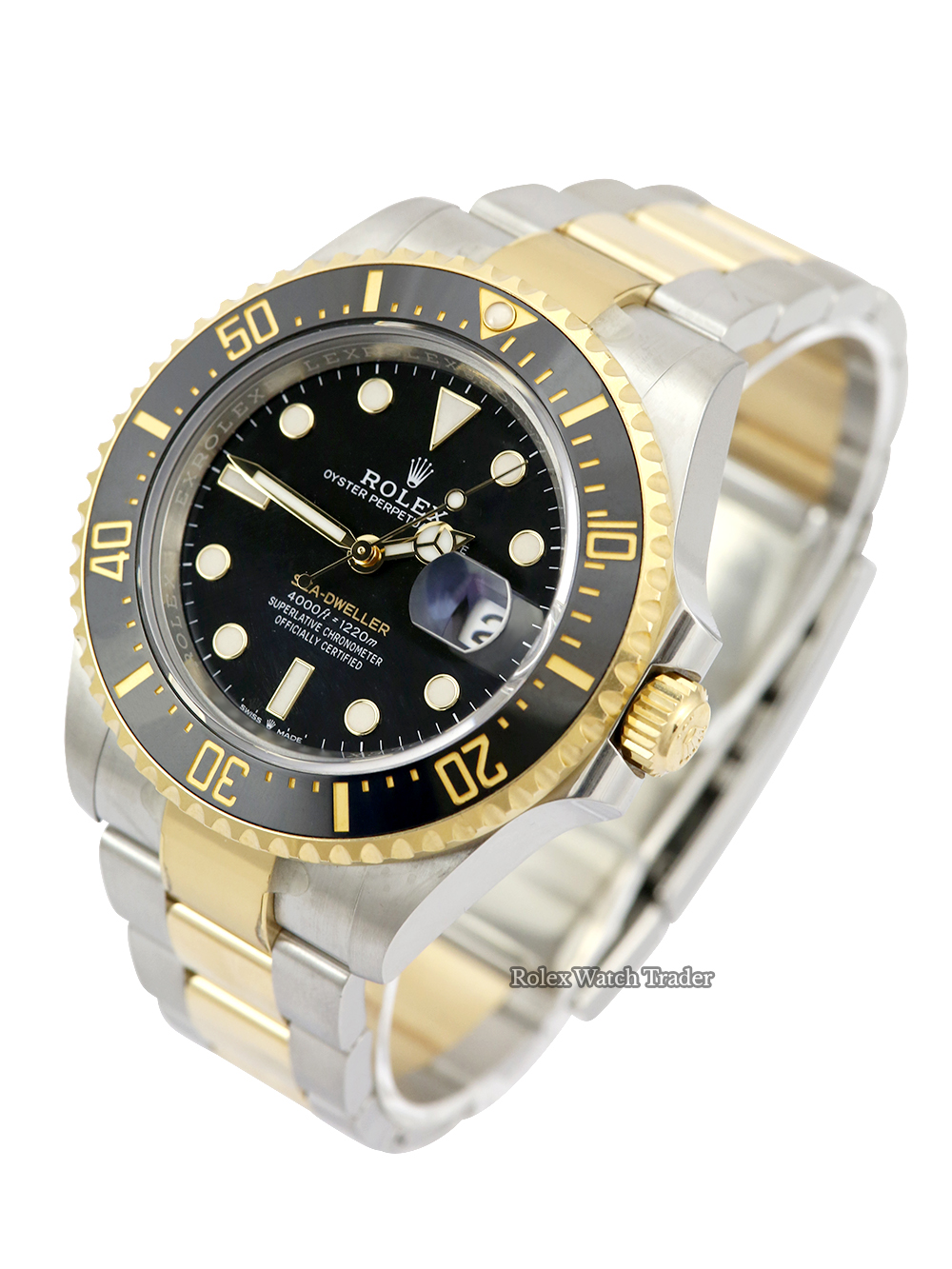 A preowned in pristine condition Oyster Steel and yellow gold Bi-Metal superlative chronometer, calibre 3235, automatic movement Rolex Sea-Dweller model reference 126603 featuring a black baton dial bearing the name 'Sea-Dweller' in gold surrounded by a black 60-minute unidirectional ceramic divers bezel on a full retail length Oyster Steel and yellow gold Rolex Oyster bracelet.