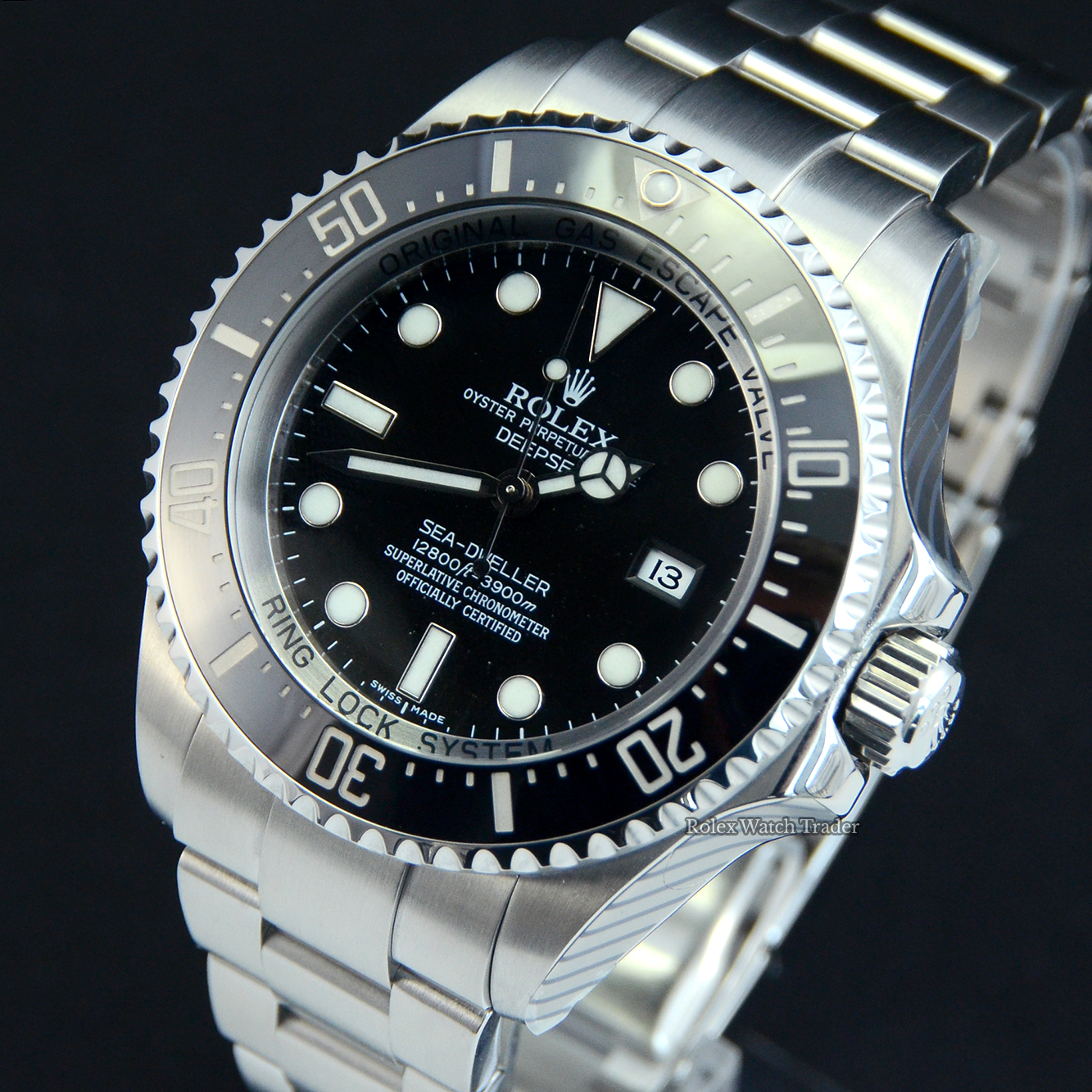 A pre-owned in excellent condition with Rolex service stickers, chronometer rated automatic movement Rolex Sea-Dweller Deepsea model reference 116660. Featuring an impressive stainless steel case of 44mm diameter and 17.7mm thickness, housing a black maxi dial with a date aperture at 3 o'clock and the special 5.5mm thick domed sapphire crystal. The dial is surrounded by a black 60 minute uni-directional rotating black ceramic bezel. Supplied on a full retail length stainless steel Rolex Oyster bracelet featuring the glide-lock clasp and a diver extension link.