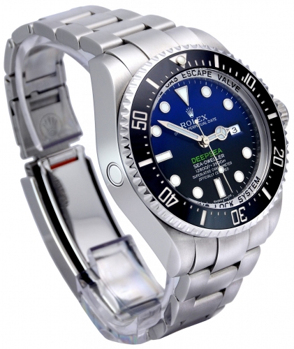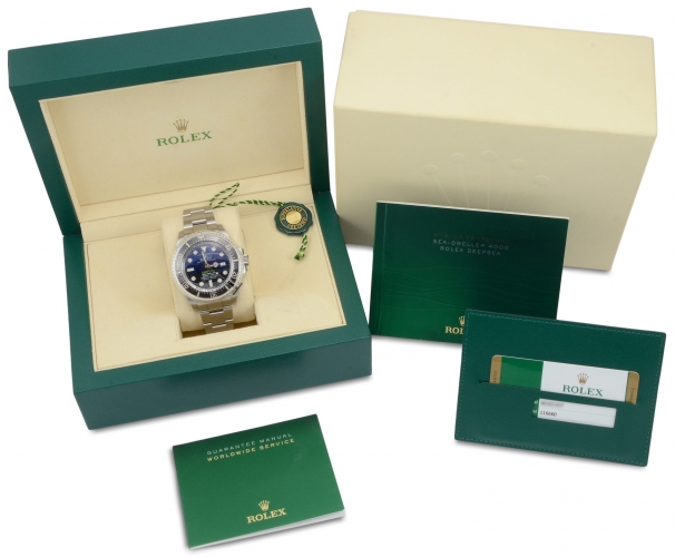 A pre-owned in pristine condition stainless steel chronometer certified automatic movement Rolex Deepsea Sea-Dweller D-blue model reference 116660. With a stunning blue and black D-Blue dial where the colours fade into one another, housing a date aperture at 3 o'clock, surrounded by a 60 minute uni-directional black ceramic bezel. This watch comes on a full retail length stainless steel Rolex oyster bracelet with the glidelock clasp and is complete with the original Rolex box, one swing tag, booklets, Rolex warranty card holder and Rolex warranty card date stamped February 2018 when first supplied new.