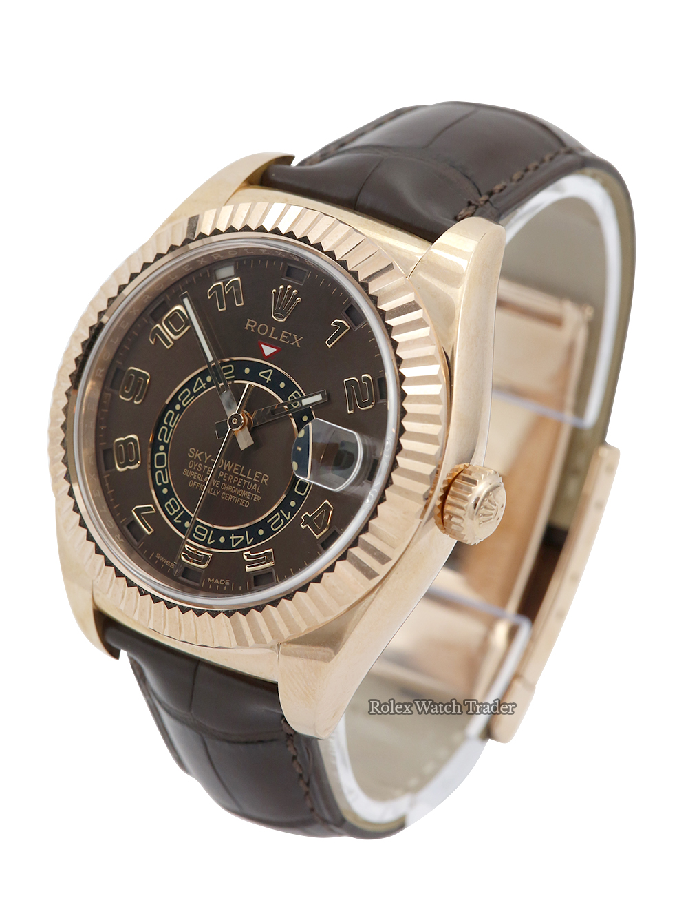 An unworn rose gold chronometer certified automatic movement Rolex Sky-Dweller model reference 326135 featuring a chocolate Arabic numeral dial surrounded by a rose gold fluted bezel on a brown leather Rolex deployment strap.