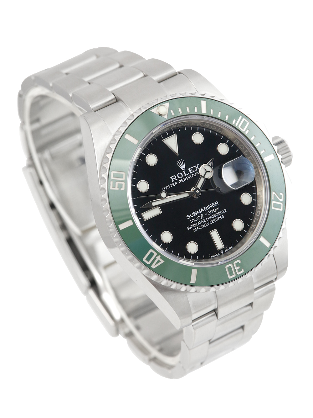 We are delighted to offer for sale this preowned in pristine condition 41mm case size Oystersteel superlative chronometer, calibre 3235, automatic movement Rolex Submariner Date model reference 126610LV featuring a black dial housing a date aperture at 3 O'clock with an external Cyclops surrounded by a green ceramic 60-minute unidirectional divers bezel on a full retail length Oystersteel Rolex Oyster bracelet.